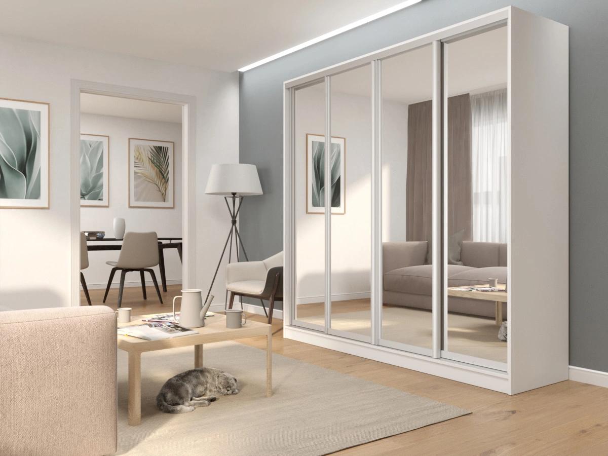 Шкаф-купе Снежок 5 представляет собой просторное и практичное изделие, которое прекрасно подойдет для хранения многочисленных вещей большой и дружной семьи. Благодаря своим внушительным размерам и четырем раздвижным дверям шкаф сможет вместить в себя все необходимые вещи.