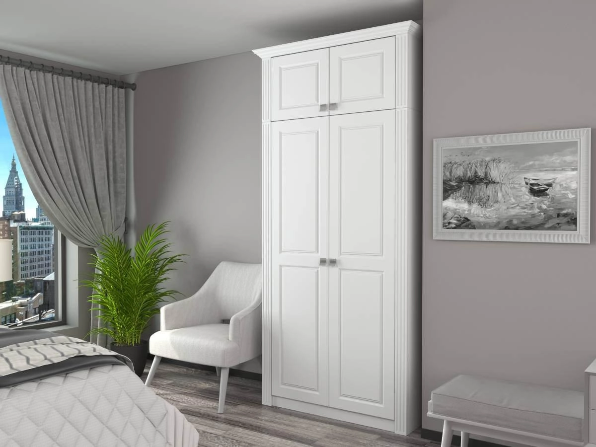 Шкаф имеет две распашные двери с фрезеровкой "Жасмин", за которыми можно выбрать любое наполнение для максимально удобного хранения вещей. Также модель отличается наличием дополнительной антресоли. Вся внутренняя комплектация может быть подобрана индивидуально, с учетом ваших потребностей и предпочтений. При изготовлении шкафа Жасмин-9 MSK используются исключительно качественные и надежные материалы, а также прочная фурнитура премиум-класса.