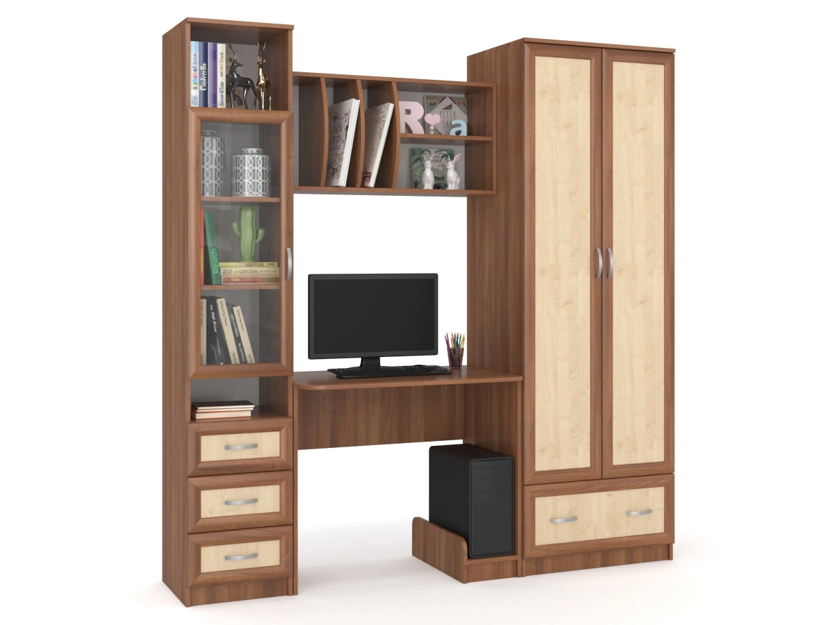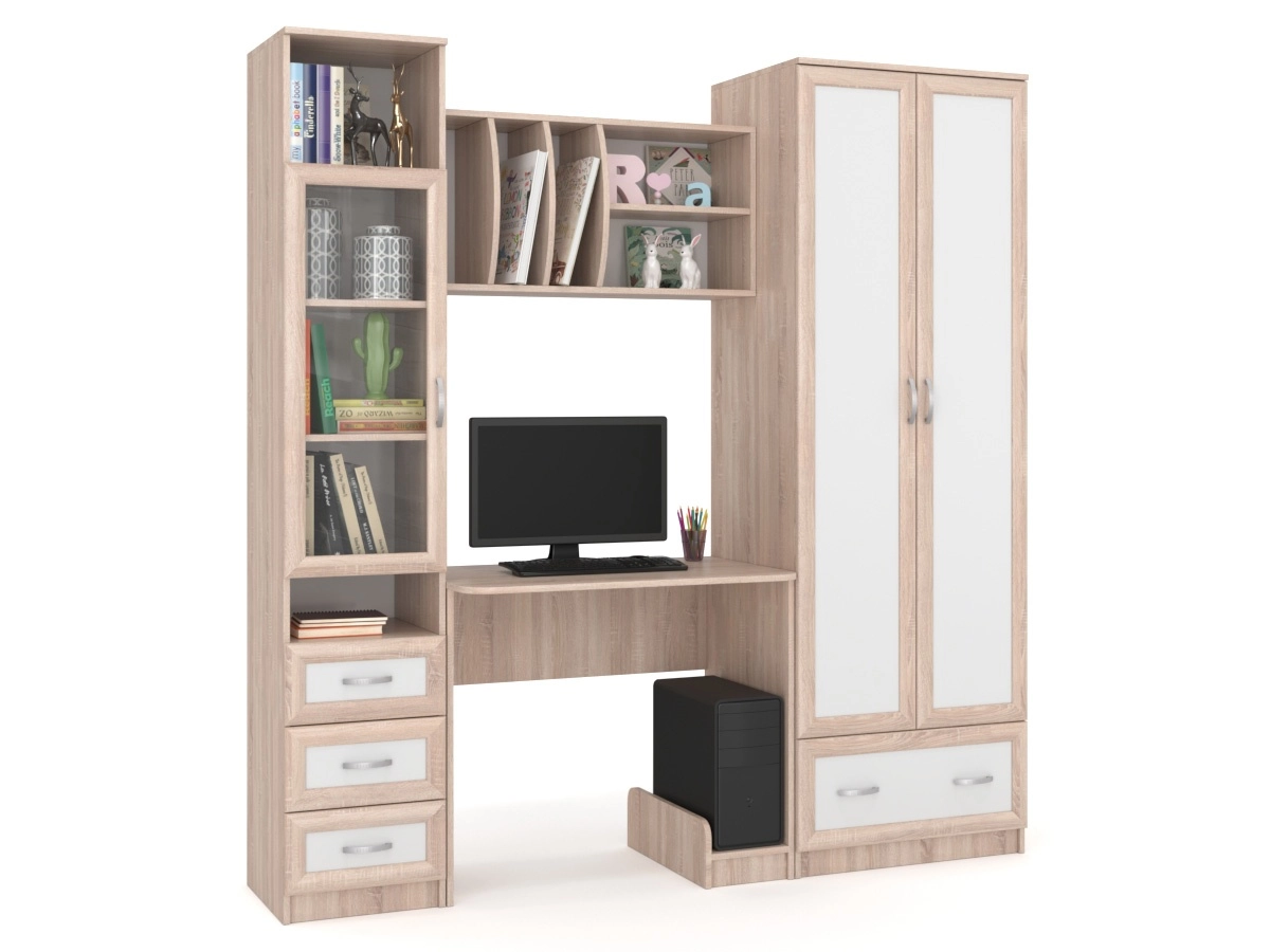 Детская стенка Бэмби - этот пример детской стенки показывает, как ваша комната растет вместе с ребенком. В стенке есть пенал с темным стеклянным фасадом и тремя ящиками. В центре столешница для компьютера и полка для клавиатуры, внизу есть место для системного блока. Платяной двухстворчатый шкаф оснащен ящиком. Между шкафами открытые полки.