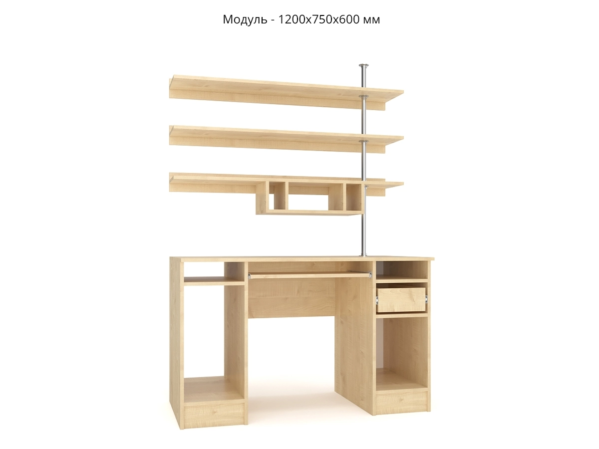 Детская стенка Богатырь – 6 – мебельная стенка в комнату подростка. В центральной зоне расположен компьютерный стол с тумбой и выдвижной полкой. Шкаф пенал оснащен выдвижными ящиками и одностворчатой зоной для вещей. Над столом много открытых полок. Есть платяной двухстворчатый шкаф, а также стеллаж с полками.
