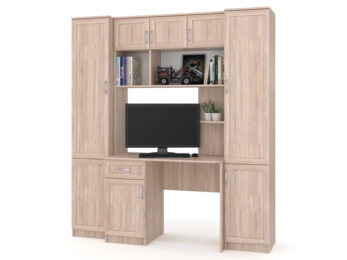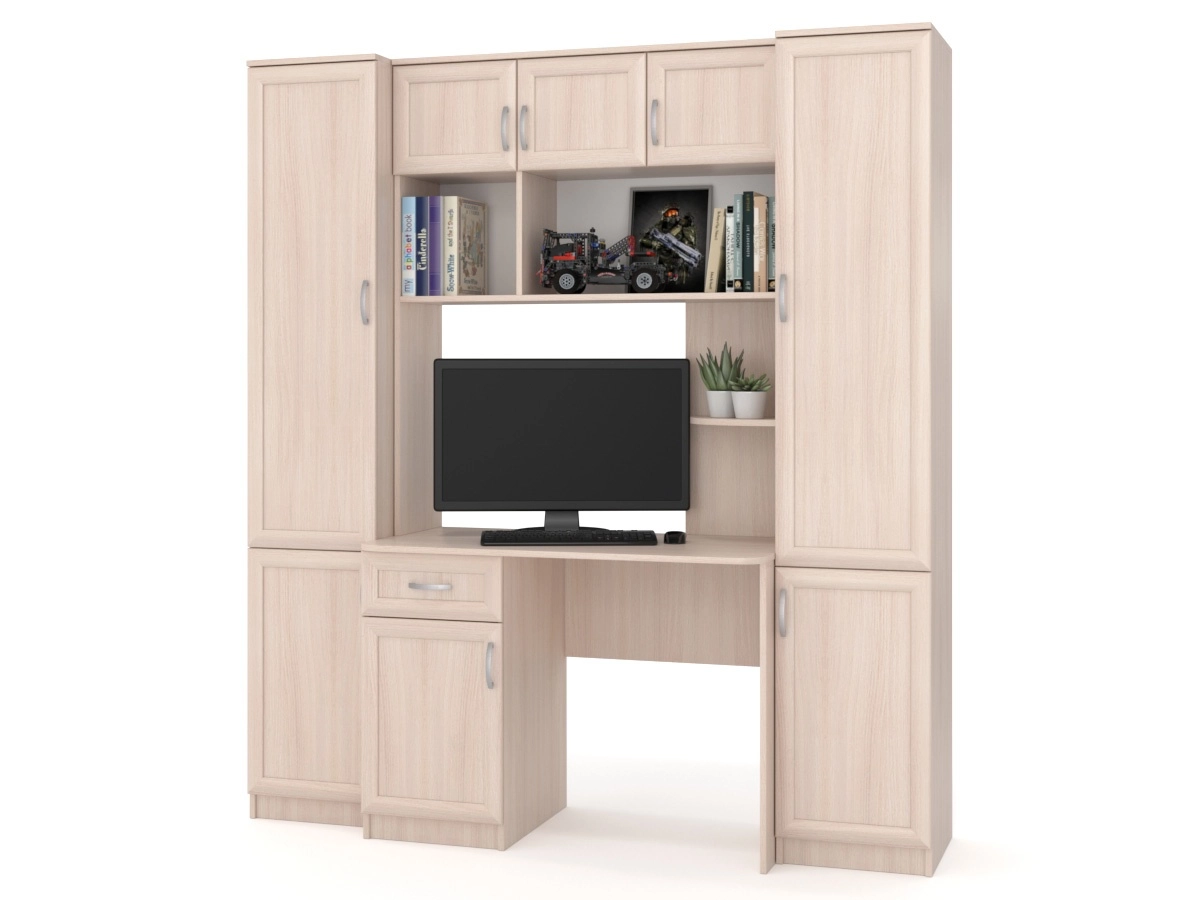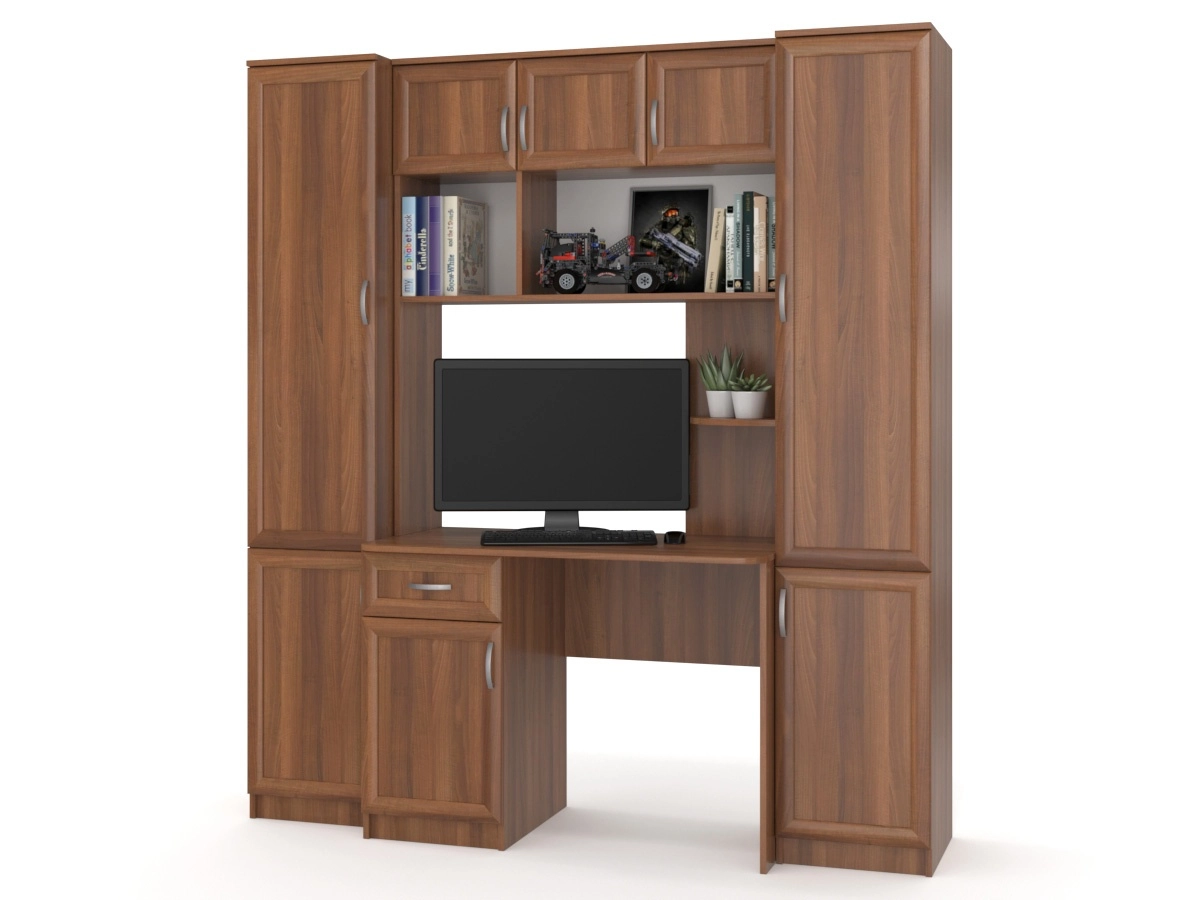 Детская стенка Елена 2 – удобная и вместительная стенка в комнату подростка или ребенка. Она состоит из двух вместительных пеналов, тумбочки с письменным столом, предусмотренным для размещения компьютера, открытых полок вертикального и горизонтального расположения и антресоли. Стандартная модель из ЛДСП в красивой цветовой гамме.