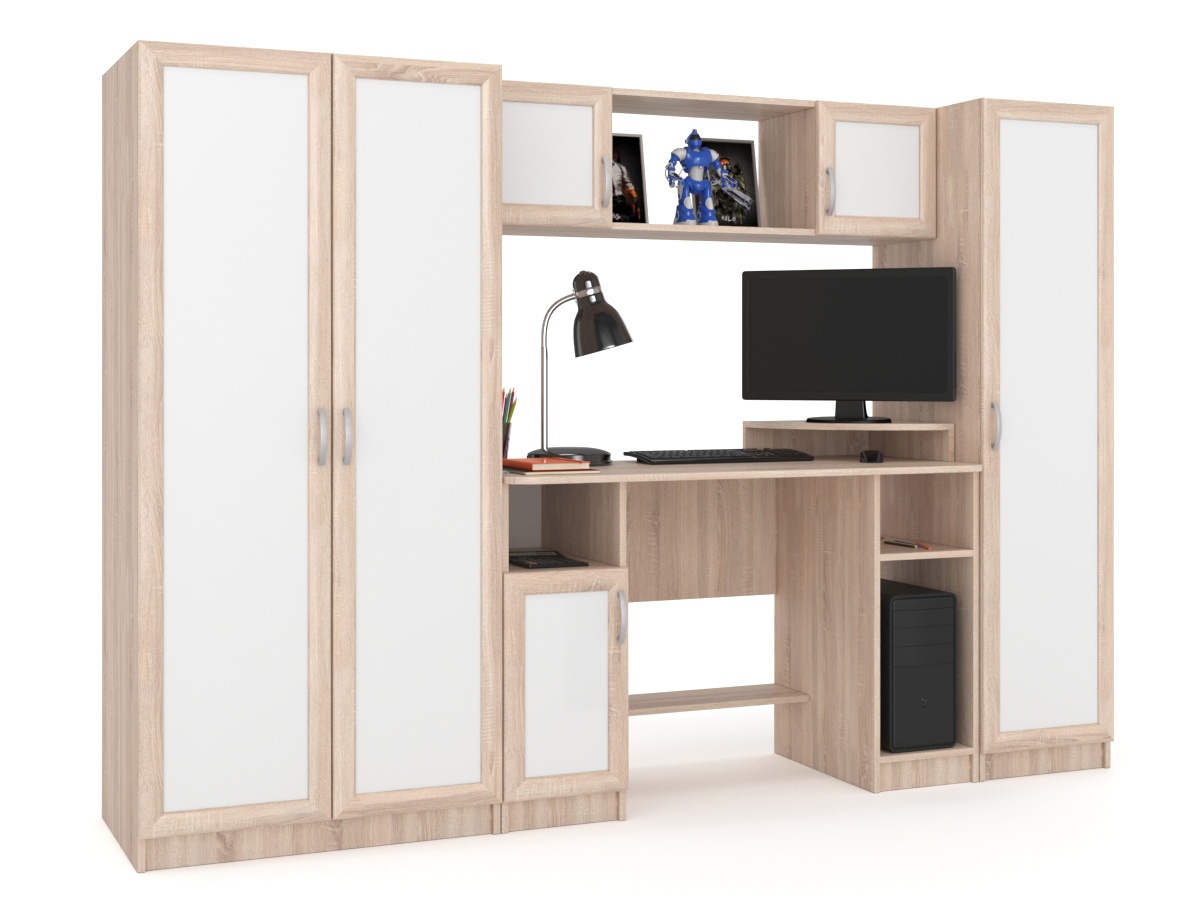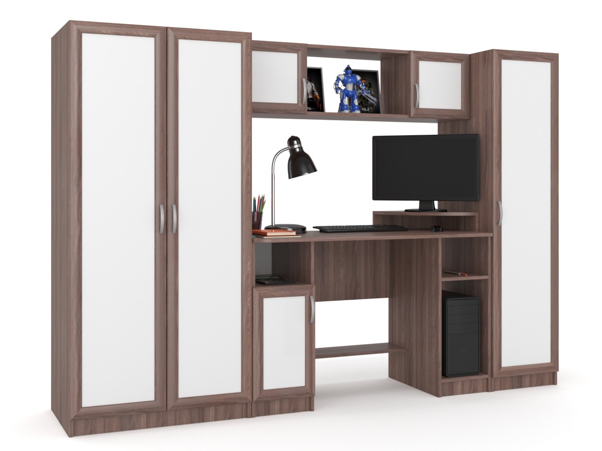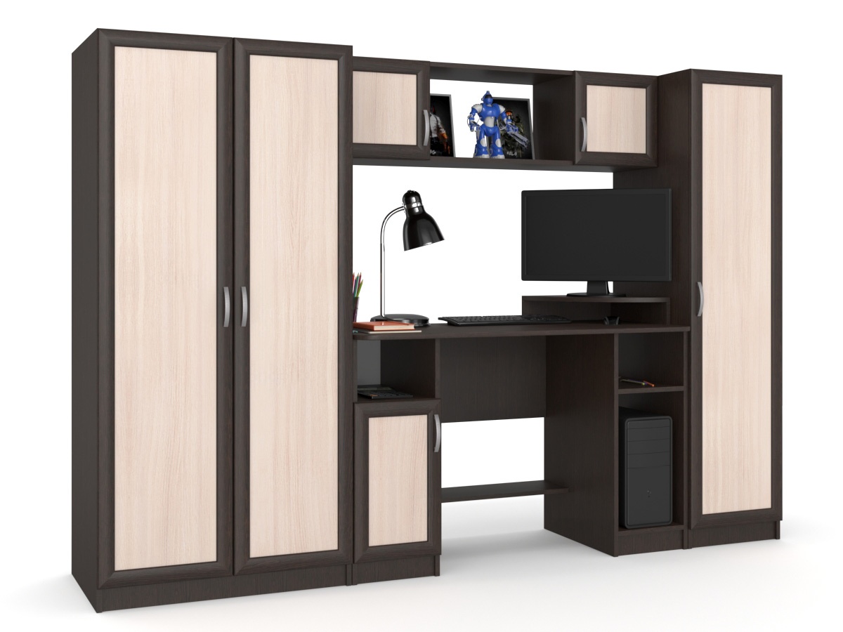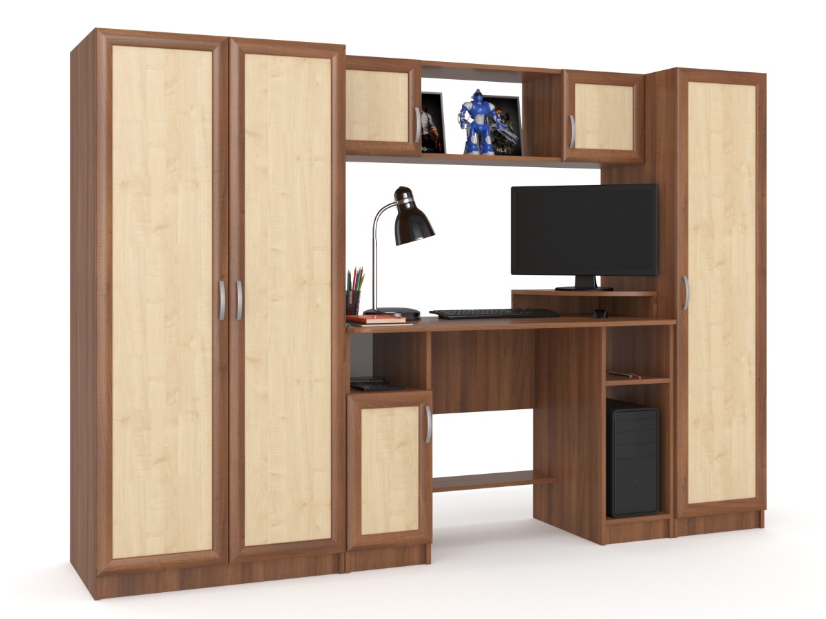 Детская стенка Карлсон 4 – модульная стенка в комнату ребенка. Это отличный вариант мебели в разных цветах фасадов. Двухстворчатый шкаф очень вместительный. Письменный стол с полочками и небольшим шкафчиком. Сверху соединительная полка. Одностворчатый шкаф вместит книги и разные вещи, игрушки и канцелярию.