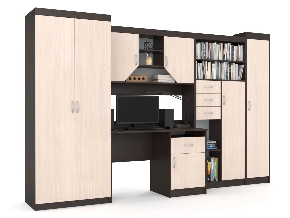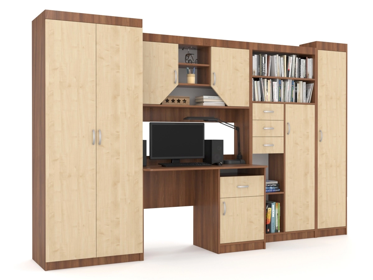Детская стенка «Полина 2» представляет собой очень вместительный гарнитур, выдержанный в современном стиле. Он состоит из нескольких частей и может быть установлен в один ряд или распределен по комнате ребенка либо подростка. В левой части находится двустворчатый шкаф для одежды. Справа от него — компьютерный стол с тумбой и выкатной доской для клавиатуры, дополненный навесным шкафчиком с фигурными дверцами и полочками. Также в комплект входит книжный шкаф с открытыми полками, ящиками и отделением с дверцей. С ним соседствует однодверный пенал.