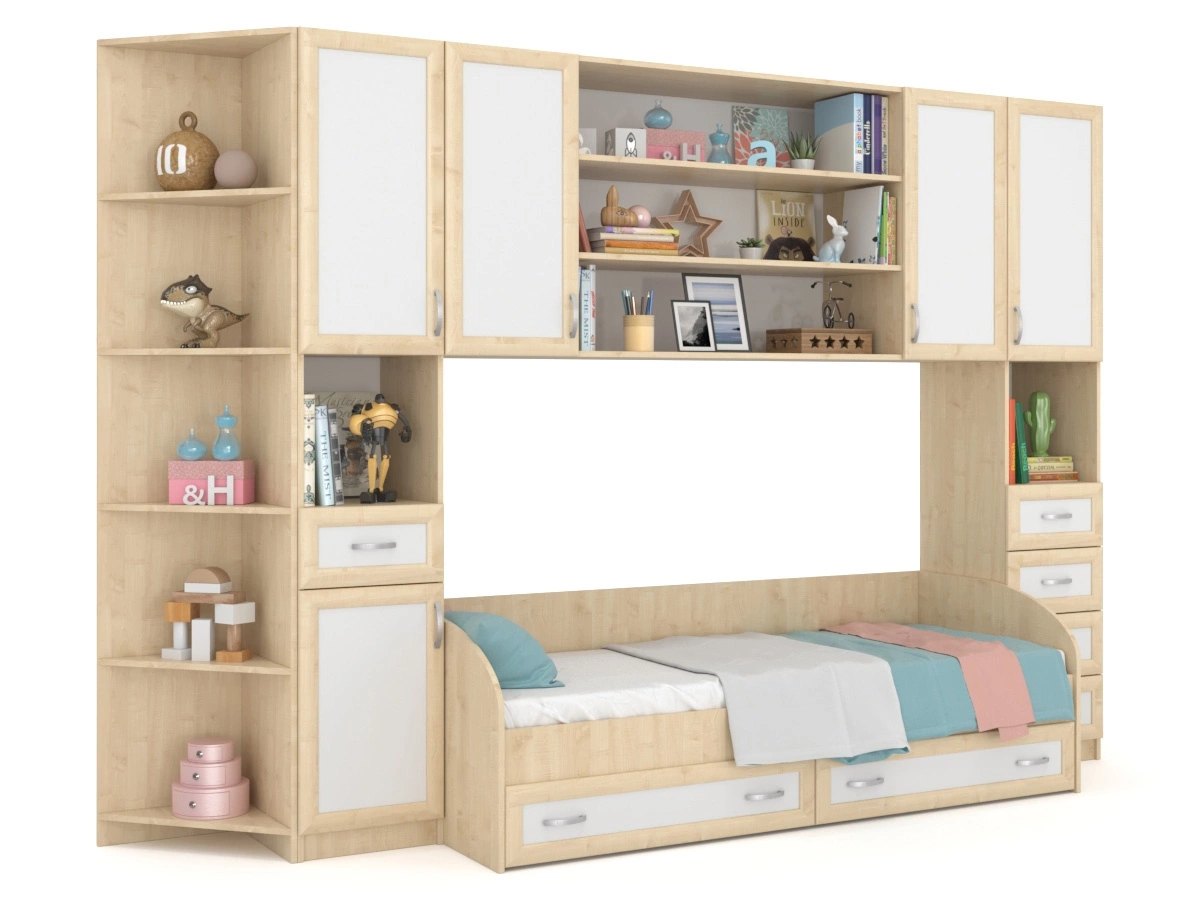 Детская стенка «Поттер 1» — вместительный и красиво оформленный комплект мебели для ребенка. Модули можно поставить вдоль одной стены либо распределить по комнате. Слева находятся стеллаж с треугольными полками и комбинированный пенал: отделения с дверцами, ящичек и открытая полка. В центре расположена кровать с ящиками под ней, защищенная с трех сторон бортиками из ДСП. Над ней — навесной шкаф с полками открытого типа и с дверцами. Справа еще один пенал, снабженный ящиками снизу и закрытыми полками над центральной нишей.