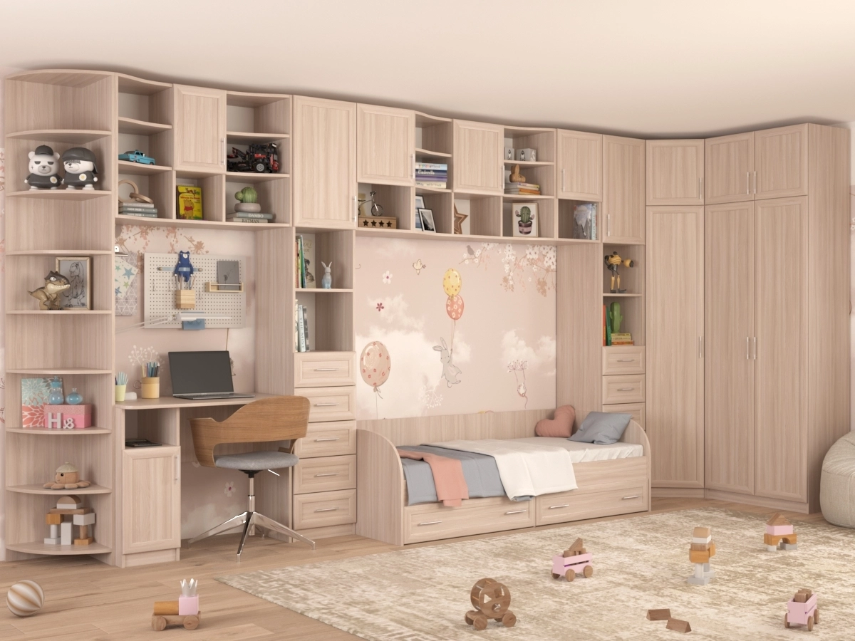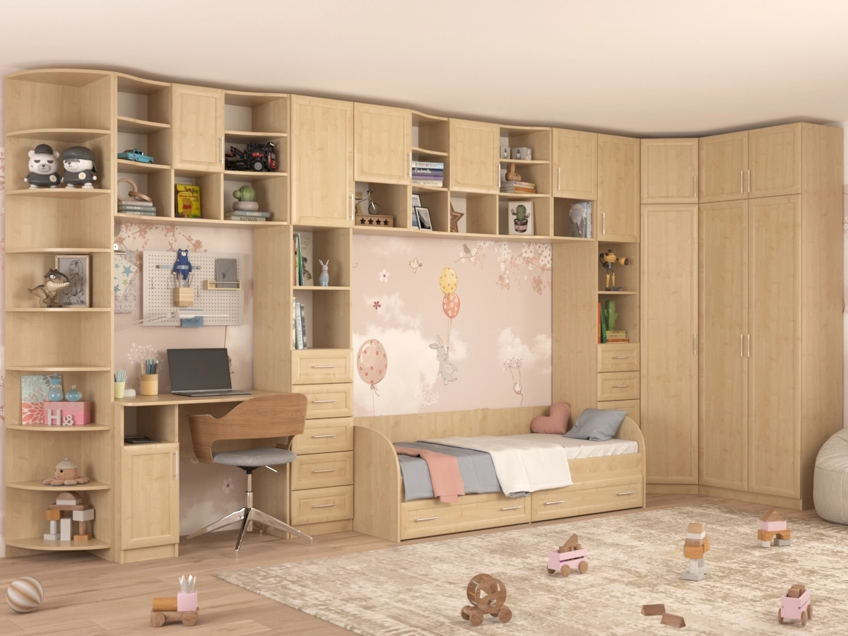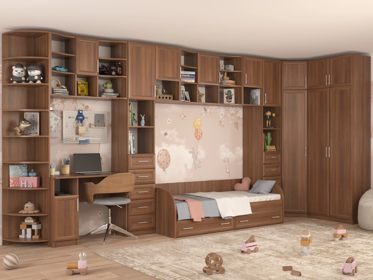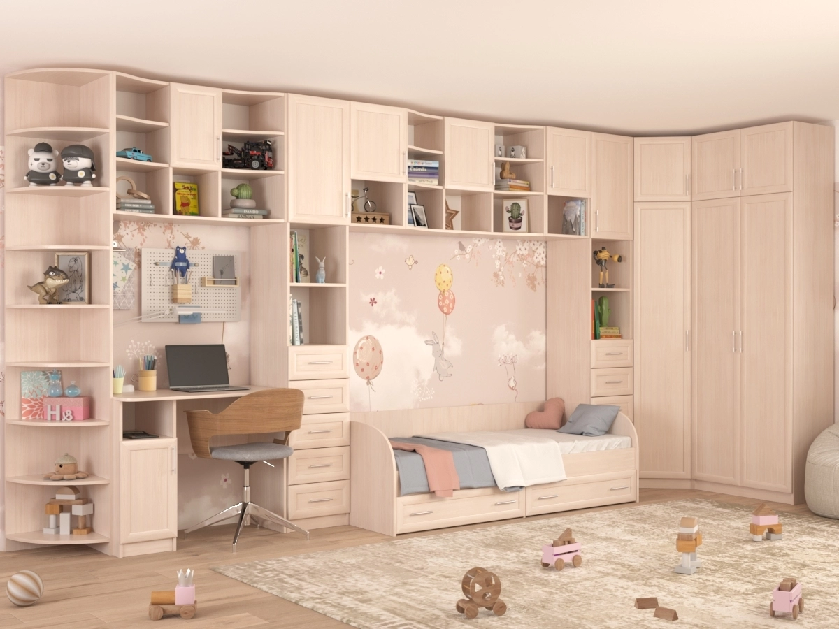 Детская стенка Щелкунчик - просторная мебельная композиция. Прекрасно впишется в большую комнату. Для каждой вещи найдется свое место, так как много открытых и закрытых полок, выдвижных ящиков, а также вместительный шкаф с распашными дверями и антресолью. За компьютерным столом удобно делать уроки, а уютная кровать поможет выспаться.