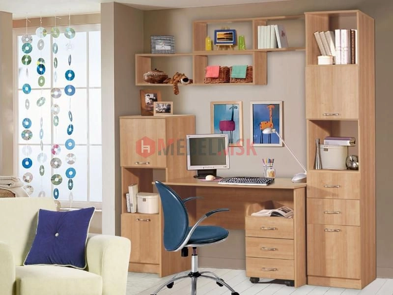 Детская стенка Спринт 9 — удобный набор мебели для ребенка. В комплект входит высокая тумба с двумя шкафчиками, разделенными открытой полкой, настенные книжные полки, пенал с открытыми и закрытыми полками, выдвижными ящиками. Есть компьютерный стол с тумбой на колесиках. За счет небольших размеров стенка эргономично впишется в детскую.