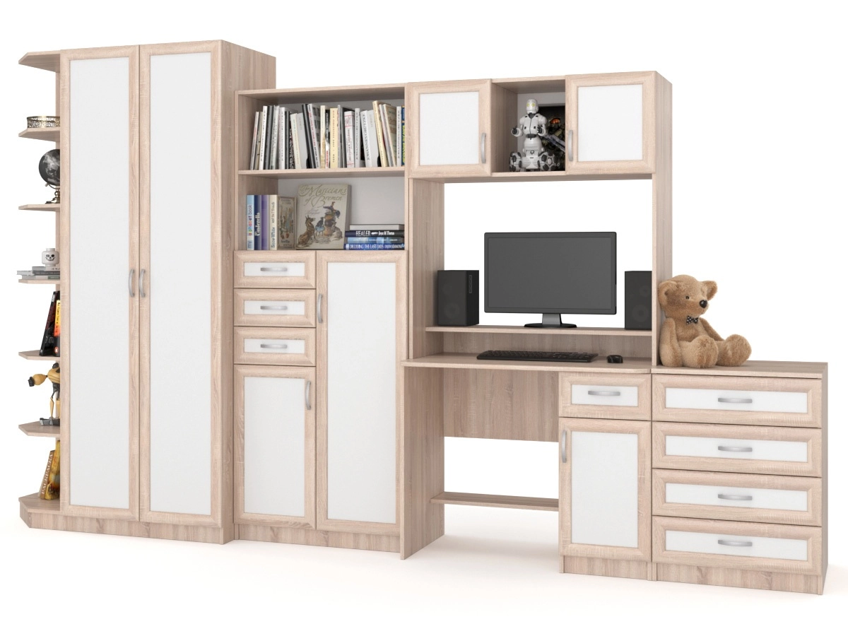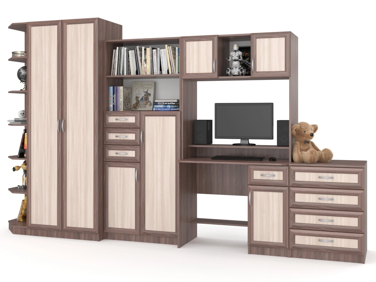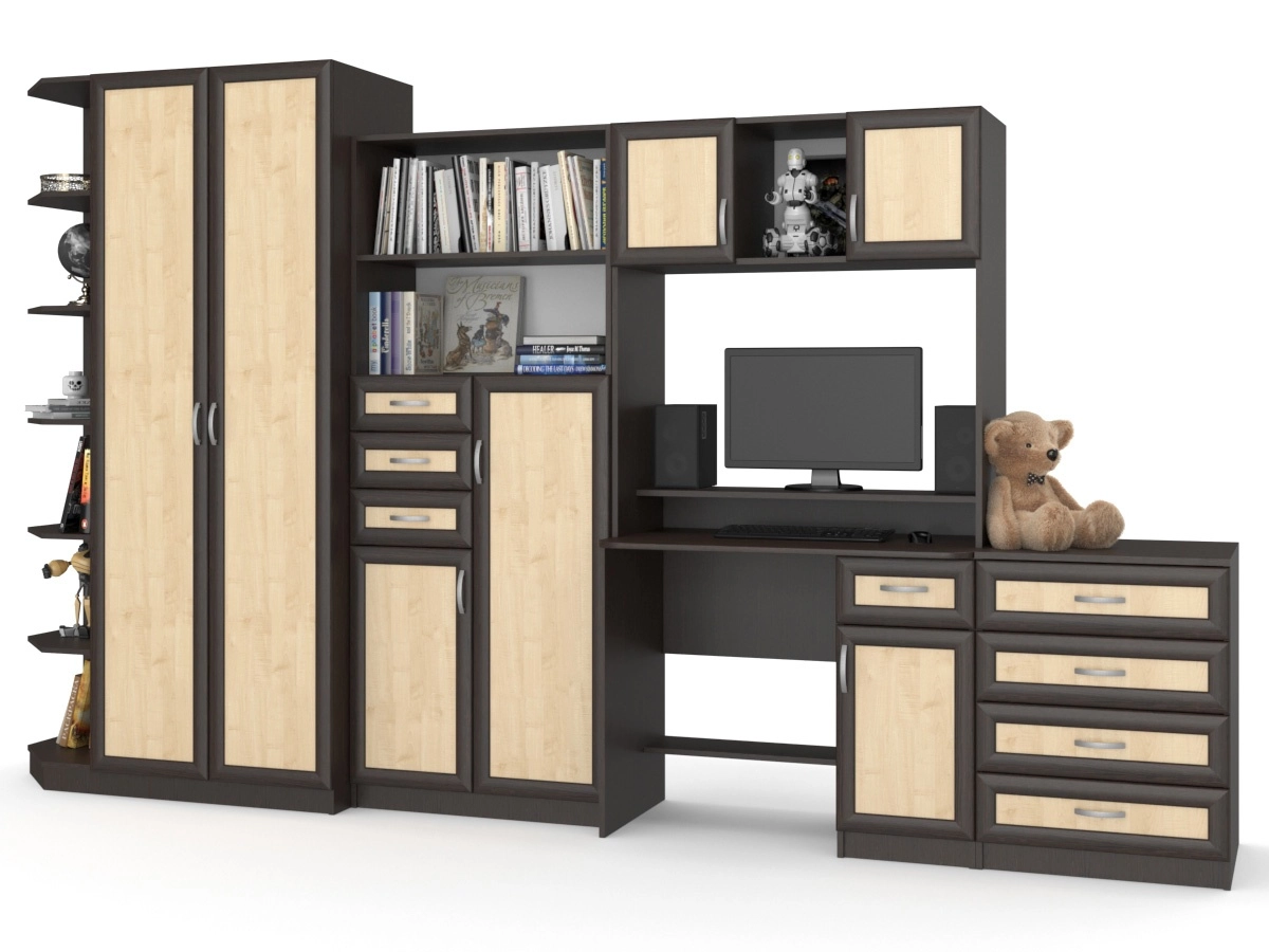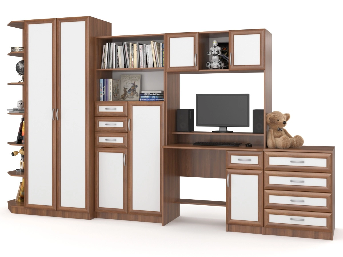 Детская стенка Том и Джерри 2 — оригинальная и практичная. Слева находится платяной шкаф с угловым стеллажом для игрушек и других вещей. Следом за ним идет модуль с выдвижными ящиками, открытыми полками и отделениями с дверцами. Над удобным компьютерным столом навесной шкаф с двумя закрытыми и открытыми полками. Завершает комплект комод с ящиками. Яркие цвета добавят красок в интерьере детской.