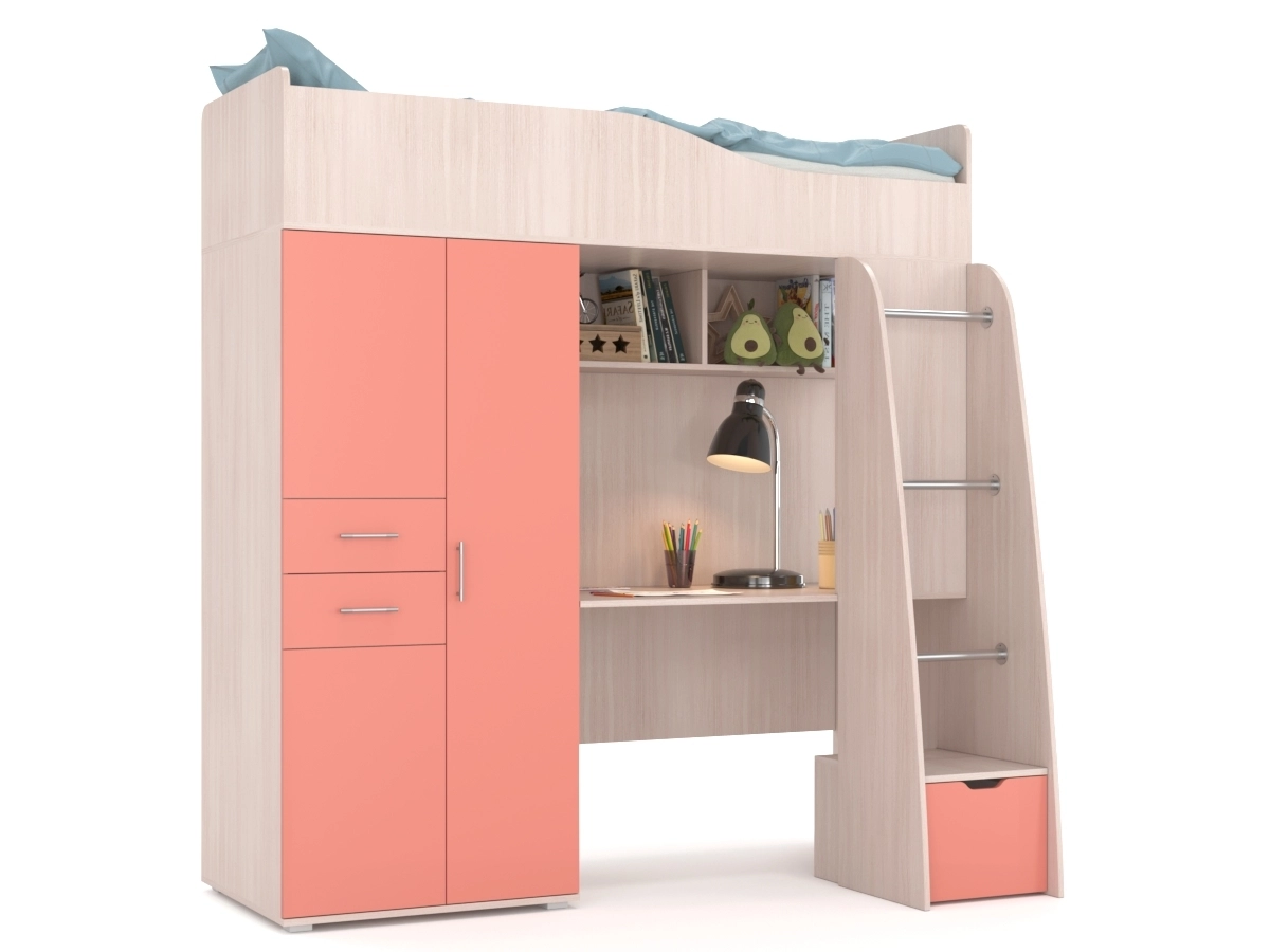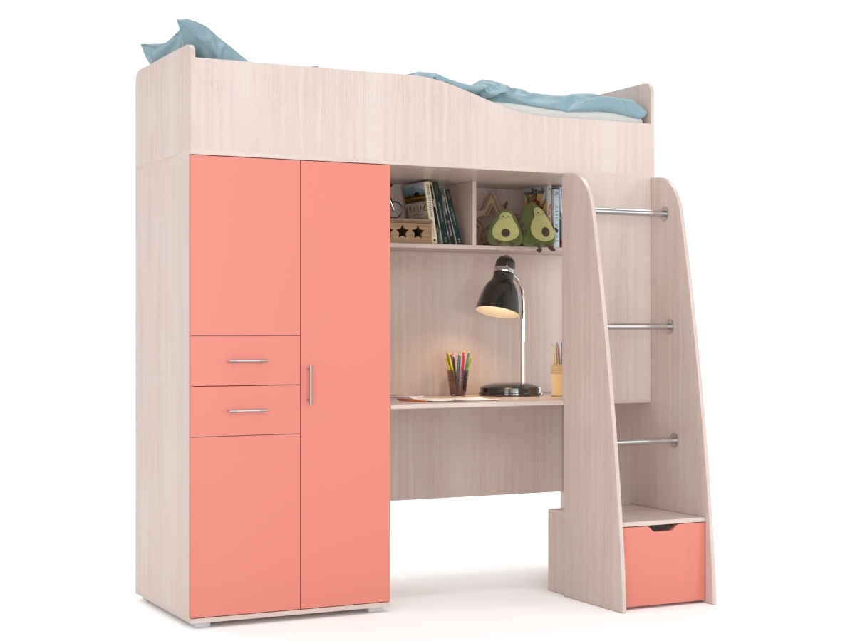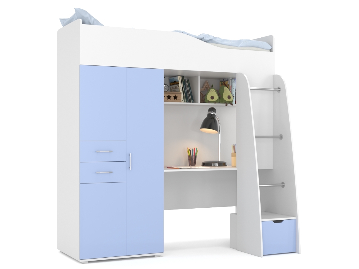 Детский гарнитур В гостях у сказки 10 — компактная и красивая мебель для комнаты ребенка. Кровать чердачного типа надежно защищена высоким бортиком и укомплектована лестницей с ящиком для игрушек в нижней части. Под спальным местом размещены шкаф для одежды с дверцами и ящиками, полка для книг и письменный стол.