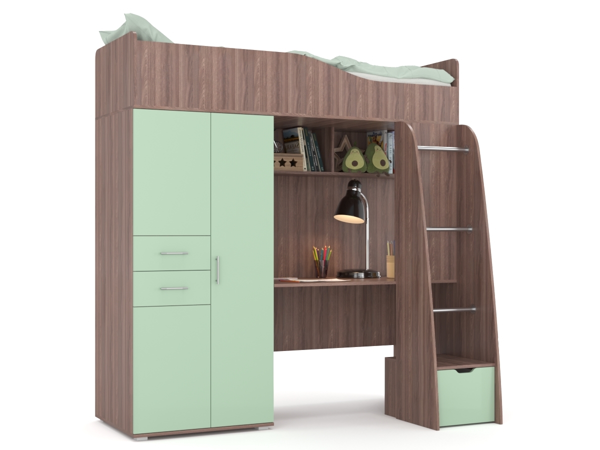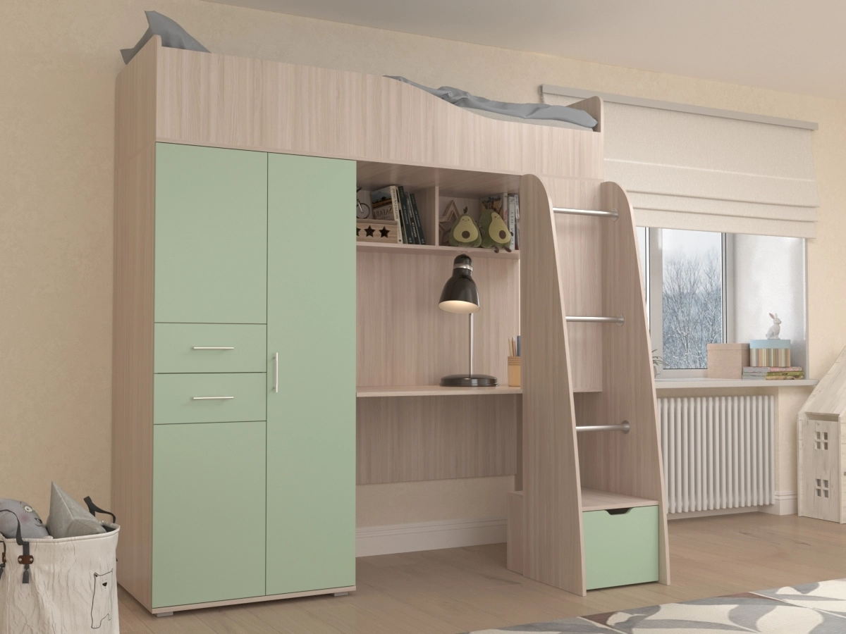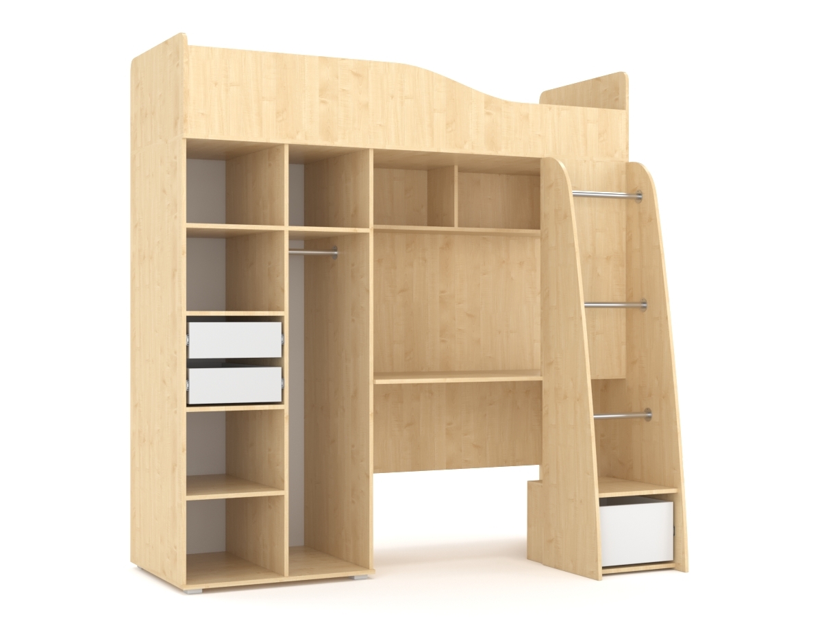 Детский гарнитур В гостях у сказки 10 — компактная и красивая мебель для комнаты ребенка. Кровать чердачного типа надежно защищена высоким бортиком и укомплектована лестницей с ящиком для игрушек в нижней части. Под спальным местом размещены шкаф для одежды с дверцами и ящиками, полка для книг и письменный стол.