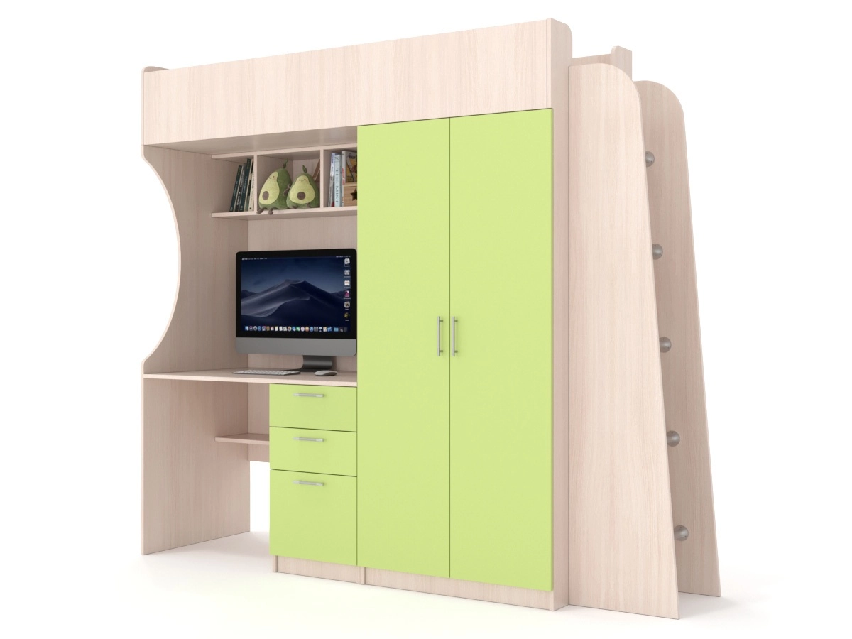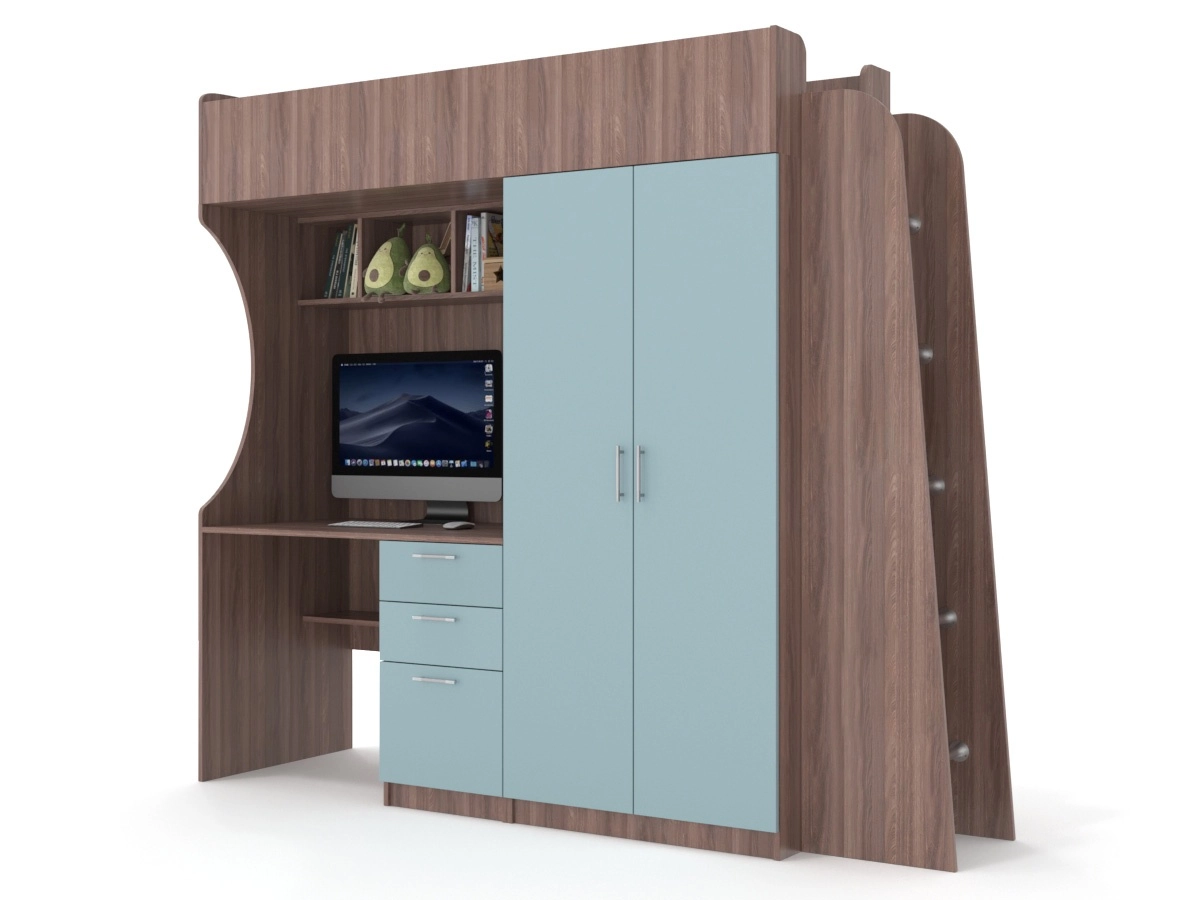 Детский гарнитур В гостях у сказки 11 — прекрасный вариант для детской комнаты. Кровать с высоким бортиком выполнена в виде чердака. Под ней находится шкаф с распашными дверцами, книжные полки и компьютерный стол с тумбой, состоящей из ящиков. Такая модель будет отлично смотреться в небольшом помещении и обязательно порадует вашего ребенка.