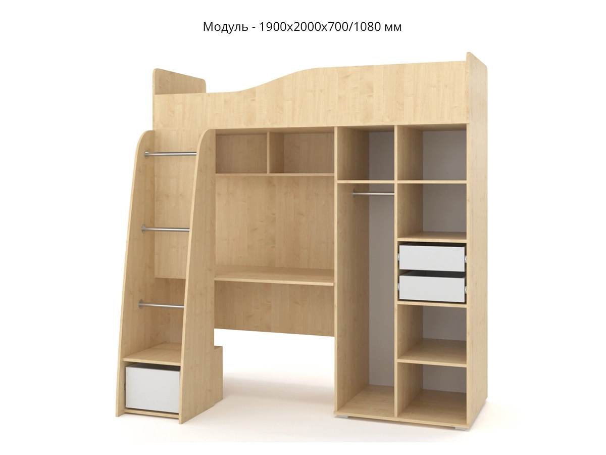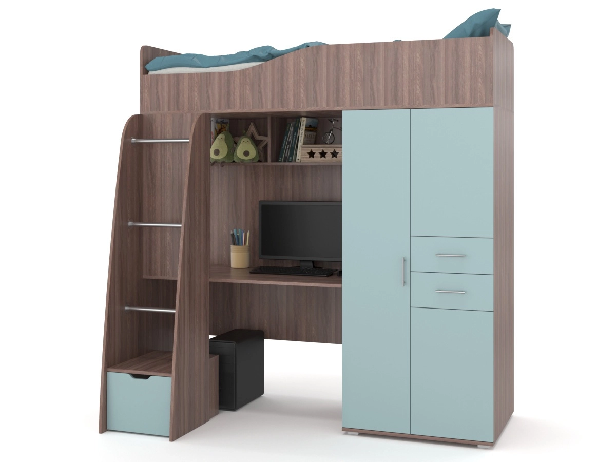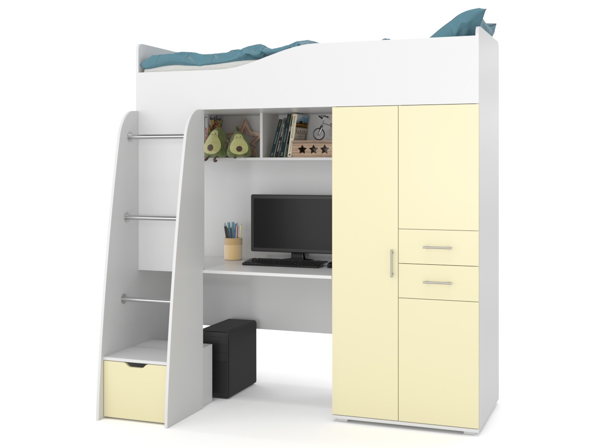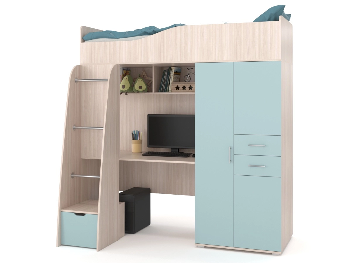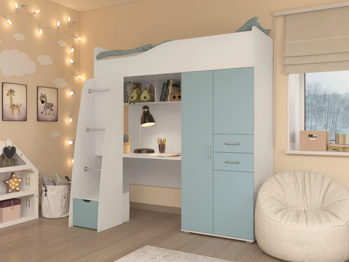 Детский гарнитур В гостях у сказки 9 – мебельный гарнитур в комнату ребенка. Сверху находится спальное место. Подняться наверх можно с помощью лестницы. В лестнице есть небольшой шкафчик для хранения вещей. Также есть письменный стол с полкой вверху и просторный шкаф с выдвижными ящиками для вещей.
