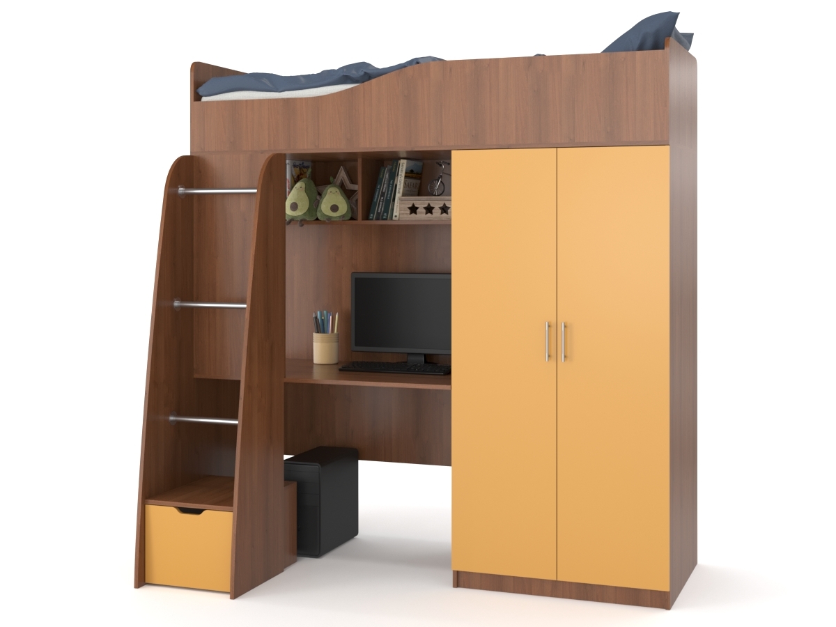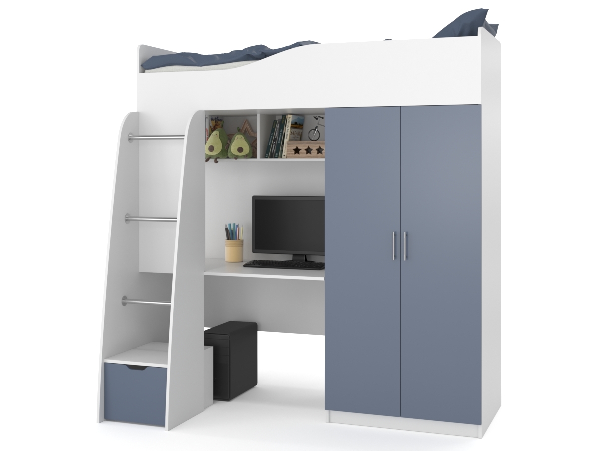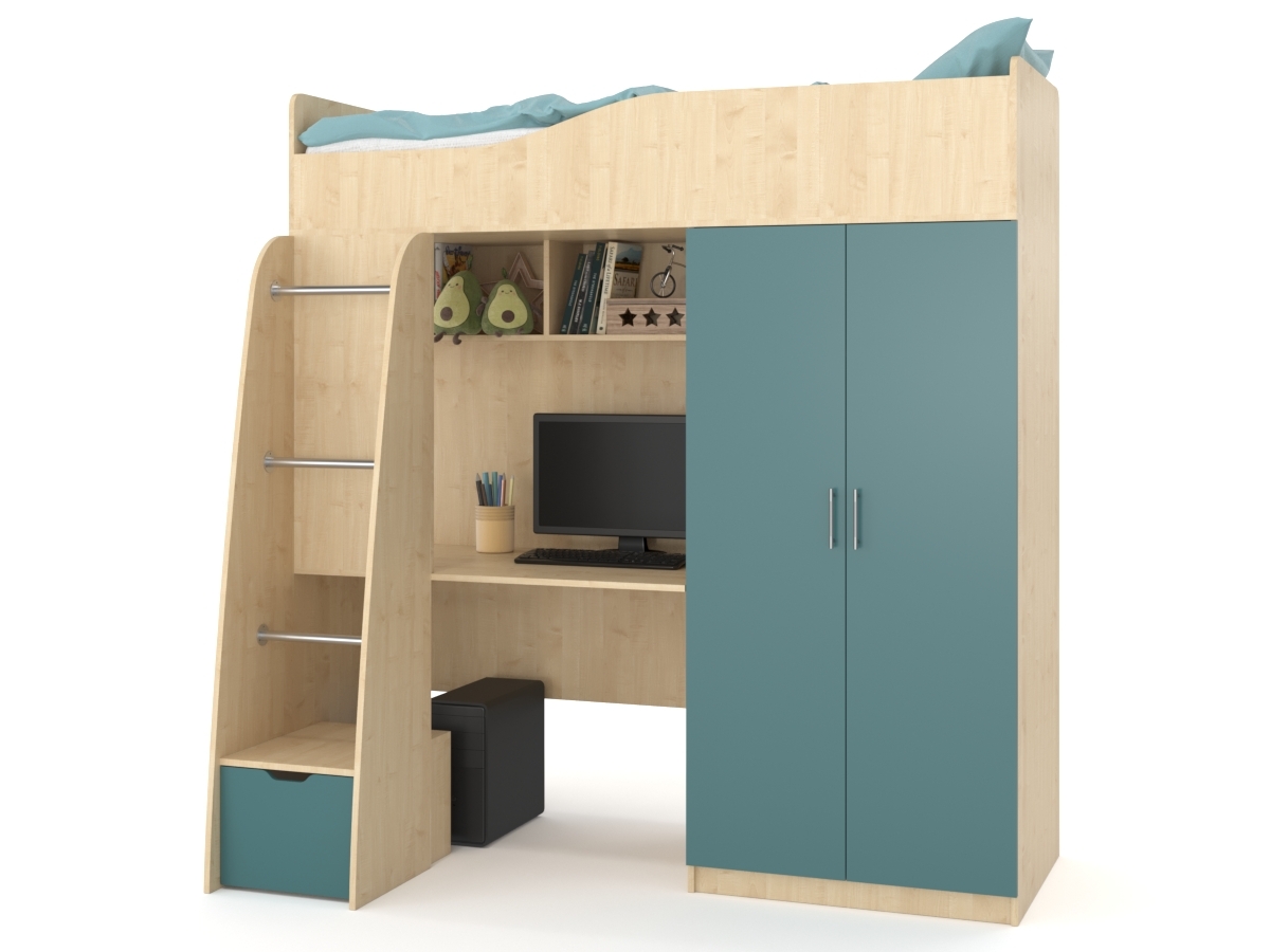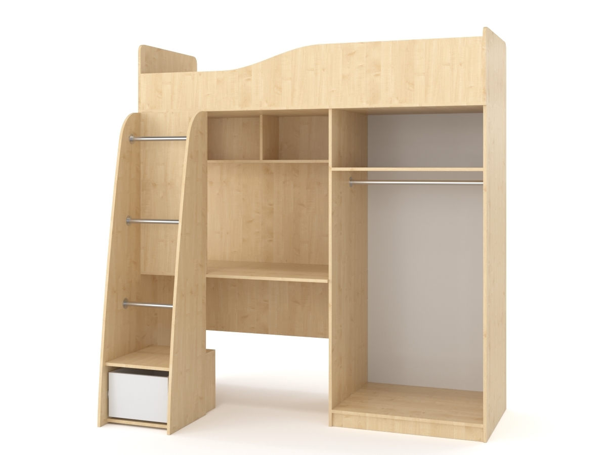 Детский гарнитур В гостях у сказки 9 – мебельный гарнитур в комнату ребенка. Сверху находится спальное место. Подняться наверх можно с помощью лестницы. В лестнице есть небольшой шкафчик для хранения вещей. Также есть письменный стол с полкой вверху и просторный шкаф с выдвижными ящиками для вещей.