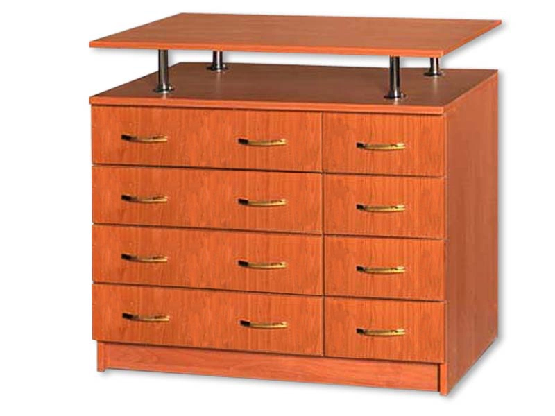 Комод TV – комод для гостиной с полкой для установки телевизора. Он представлен в современном исполнении и отлично смотрится. В комоде много разных ящиков, они украшены металлическими ручками. Полка крепится на металлических трубках. Для плавной работы ящиков имеются направляющие.