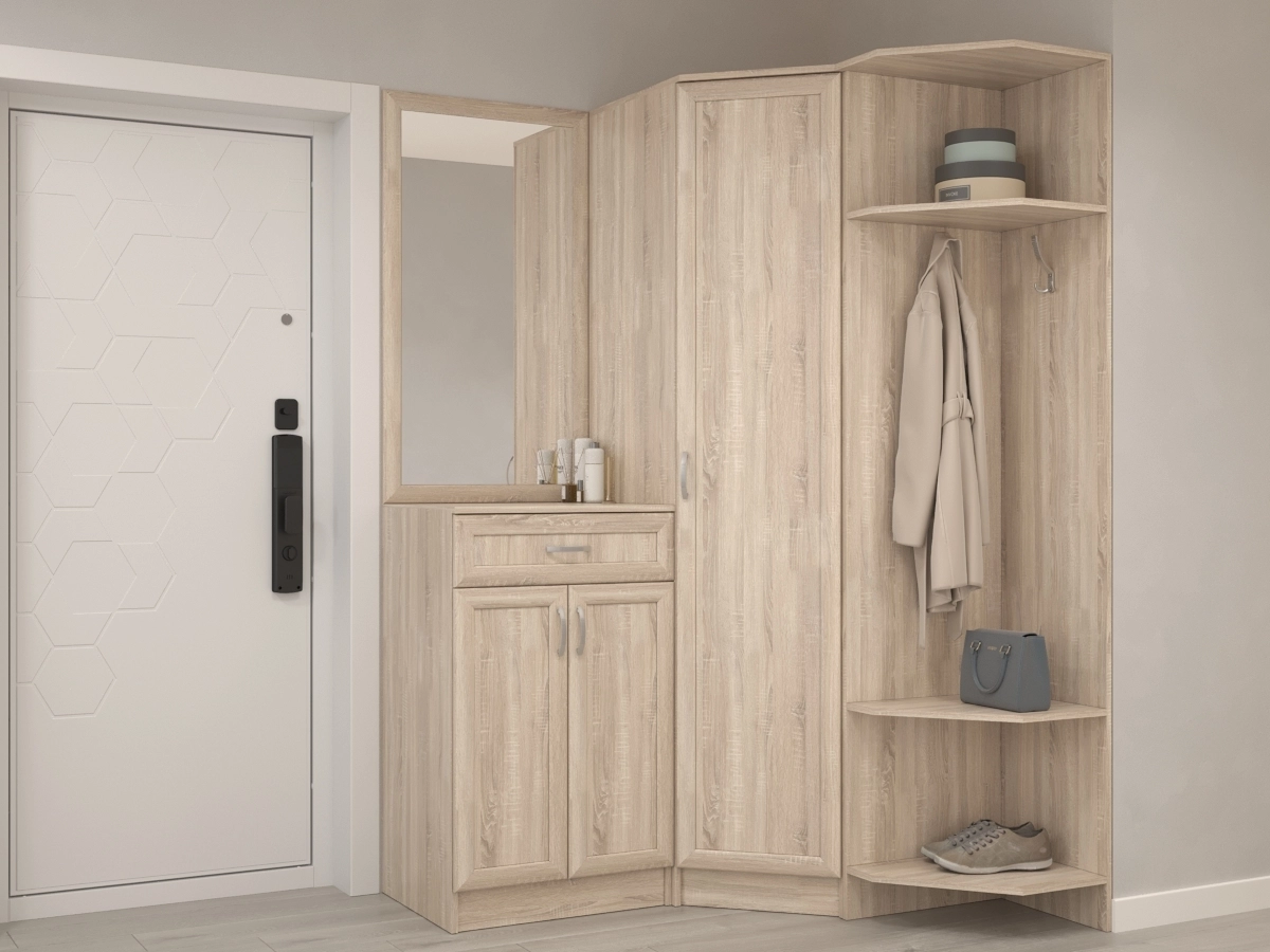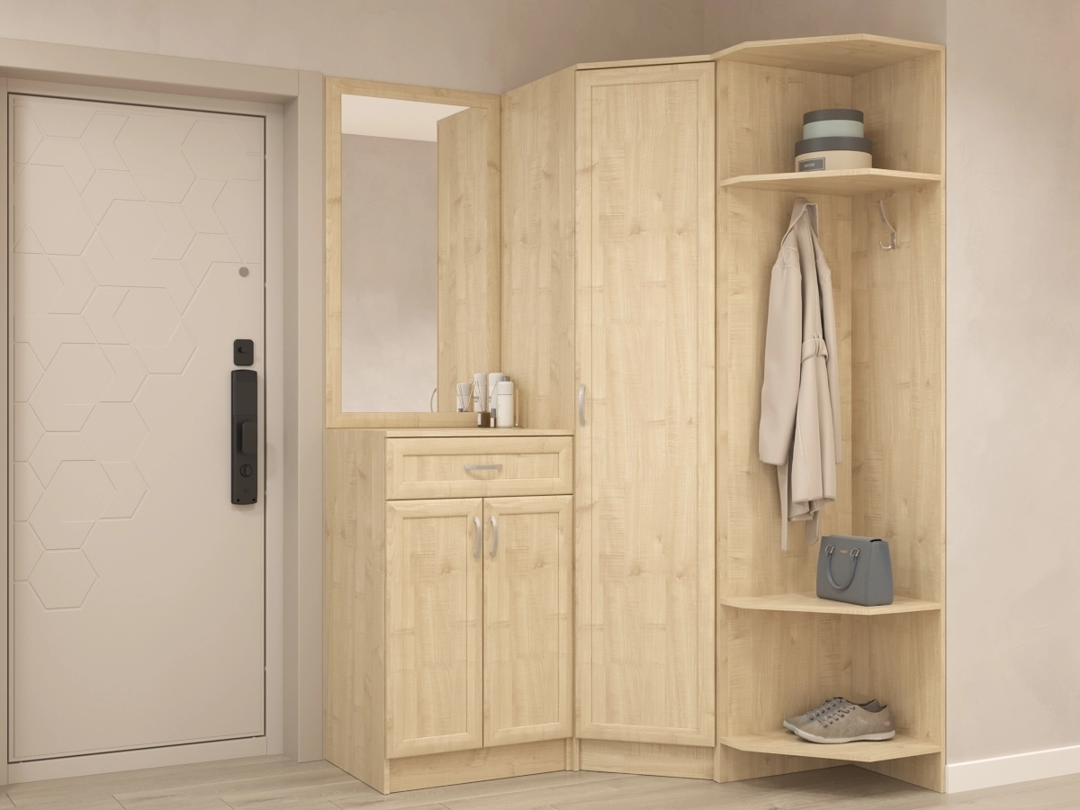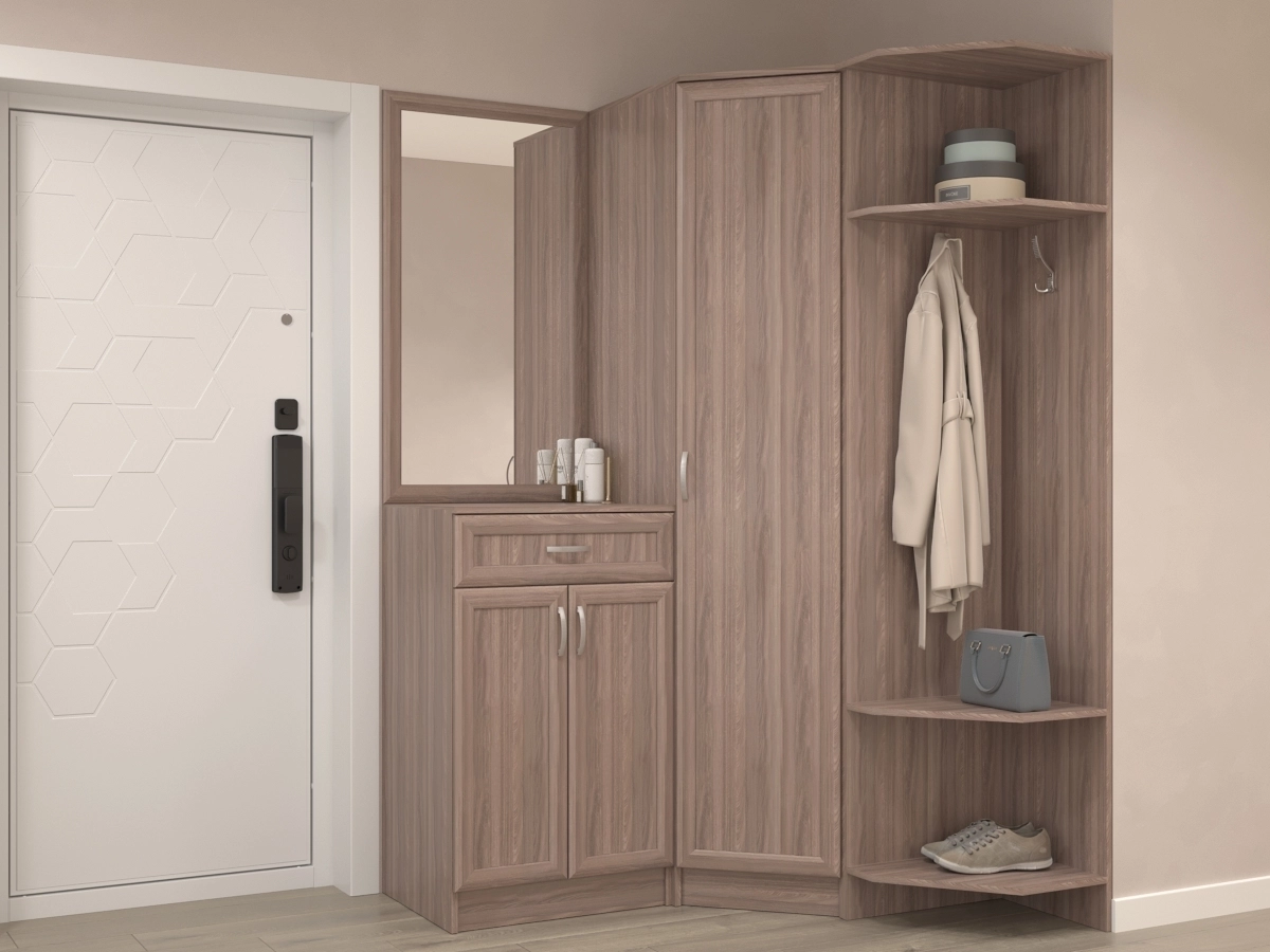 Прихожая Рикардо 3У – элегантный угловой мебельный предмет, состоящий из тумбы с зеркалом, углового шкафа и открытой вешалки. Этот предмет из ЛДСП придаст вашему помещению безупречную элегантность. Комод с функциональным ящиком и шкафом. Небольшая нижняя полка позволит аккуратно спрятать обувь и сапоги.