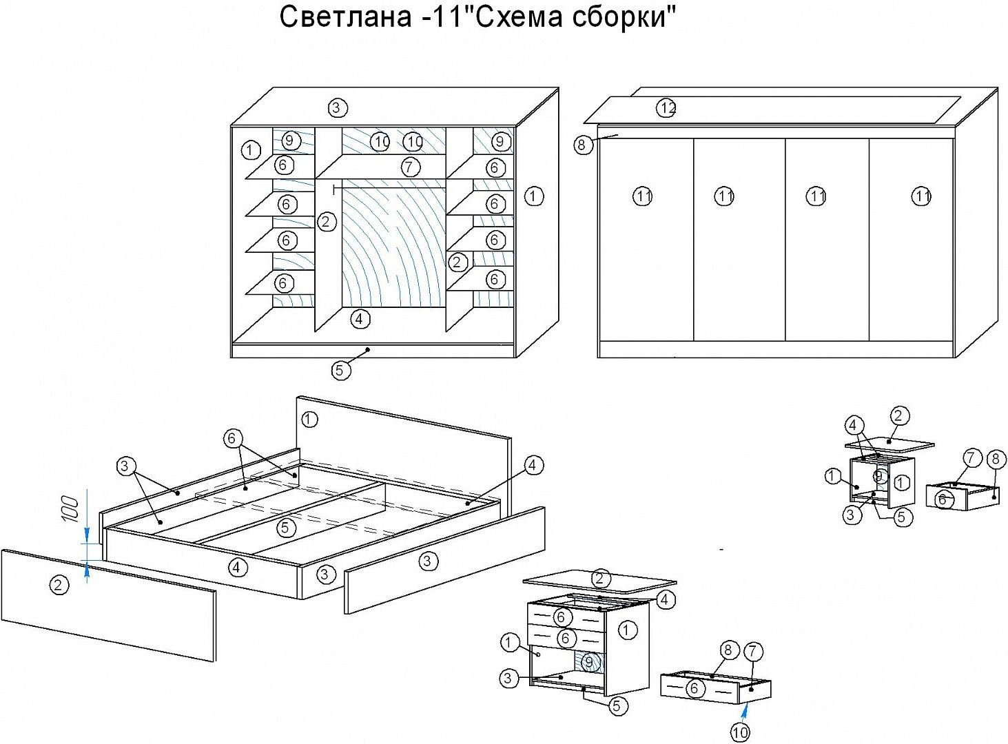 | Шкафы от 4-х дверей просчитываются индивидуально по модулям (2-х двер.+ 2-х двер.+2-х двер.= подъём). | ||
