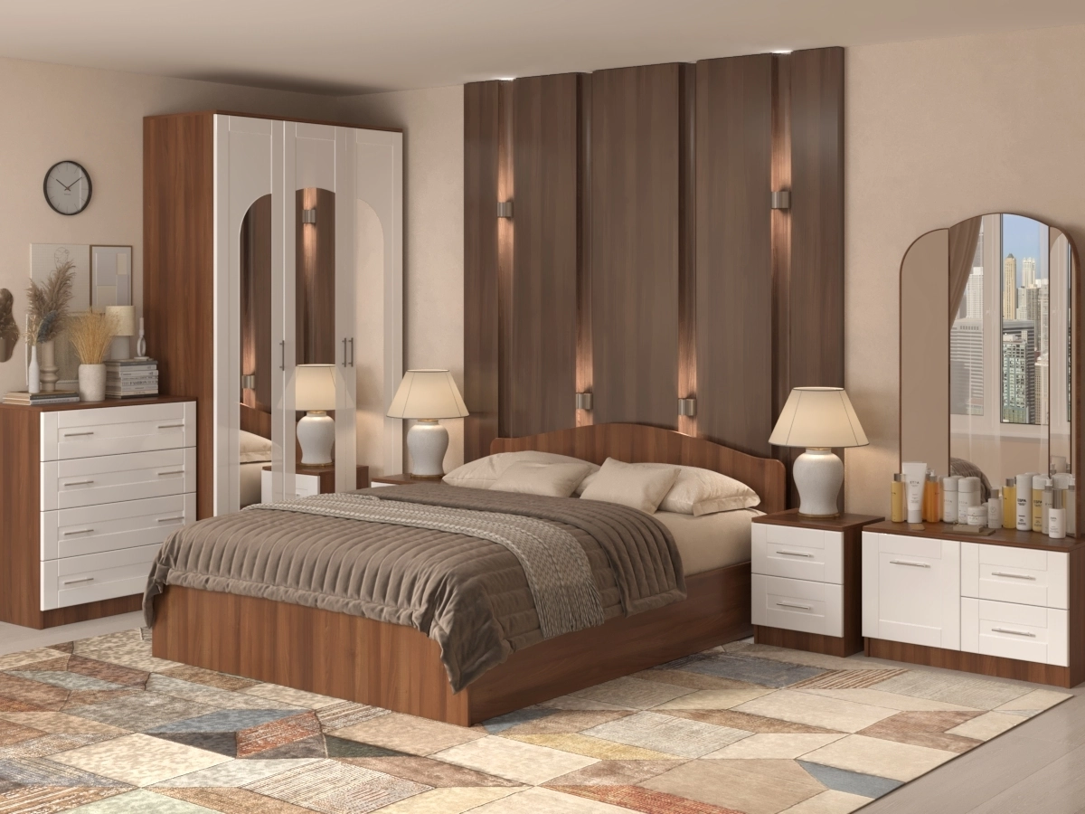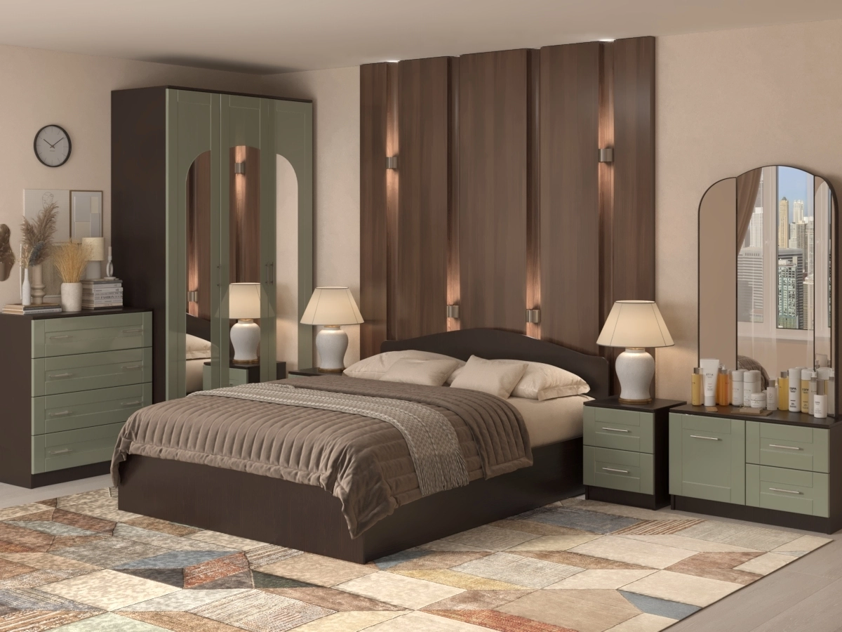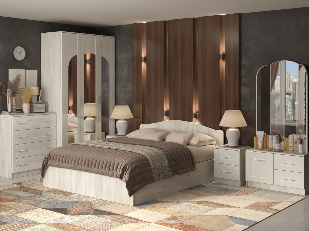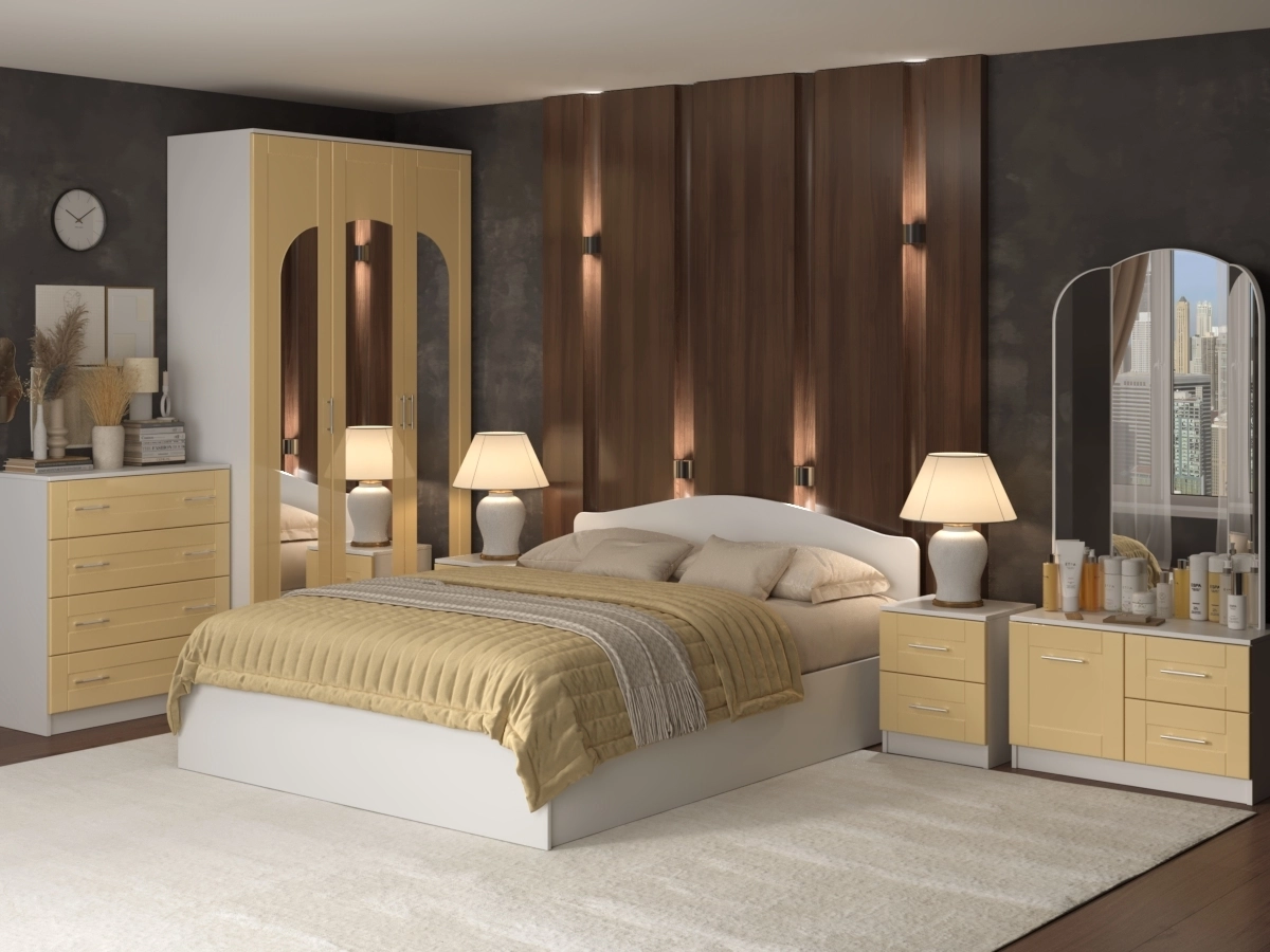 Спальный гарнитур Светлана 13.1 – мебель для спальни включает в себя: красивый и оригинальный шкаф, двуспальную кровать, прикроватную тумбу, трельяж и комод. С помощью такой модели можно воплотить в реальность безупречную дизайнерскую обстановку. Мебельные фасады изготовлены в классическом стиле из МДФ с фрезеровкой. Восхитительный набор гармонично впишется в любое помещение. Чтобы купить Спальный гарнитур Светлана 13.1 по выгодным ценам, достаточно заполнить заявку на нашем сайте или позвонить по телефону 8 (495) 740-75-18
