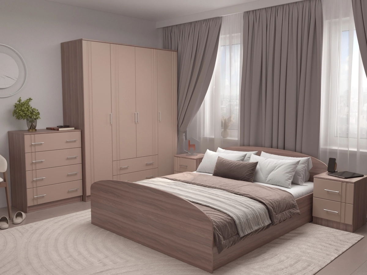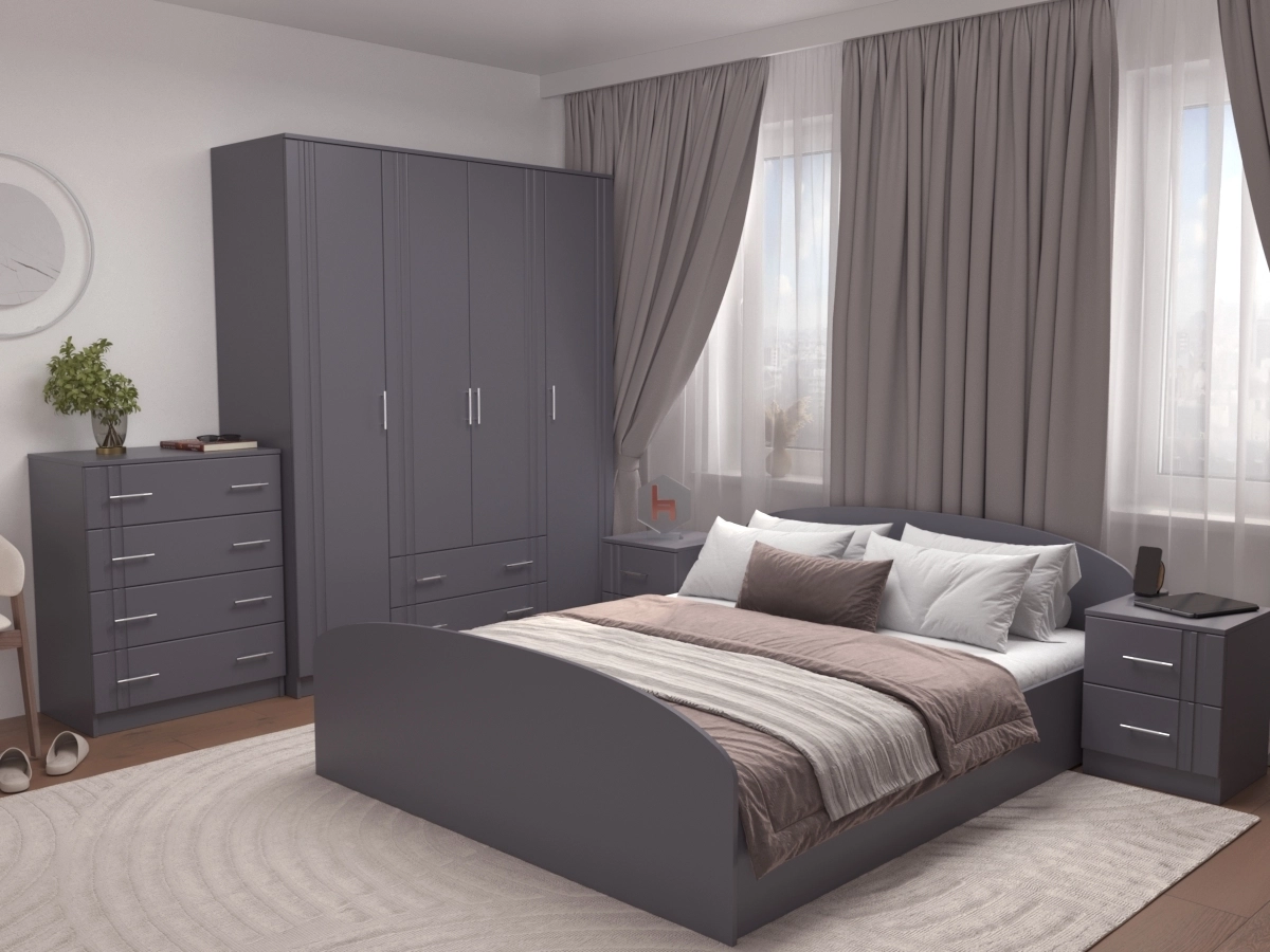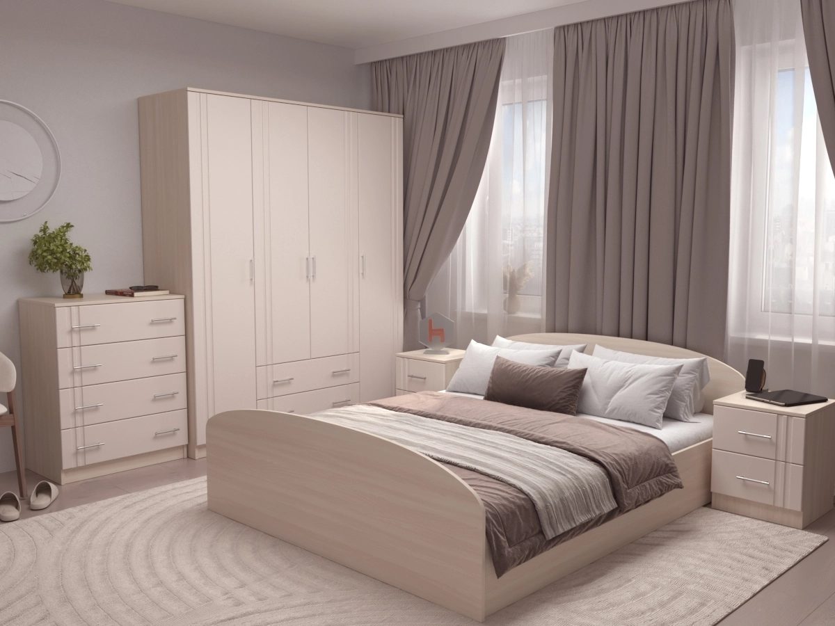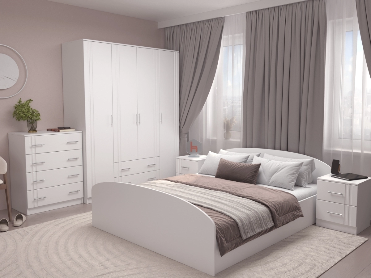 Спальный гарнитур Юнна 2 МДФ– гарнитур для спальной комнаты, который состоит из большой кровати, платяного шкафа, тумбочек с ящиками и комодом. Мебель станет настоящим украшением комнаты. В традиционную стилистику гарнитур впишется гармонично. Комплект подойдет к различным декорам и прослужит долгое время.