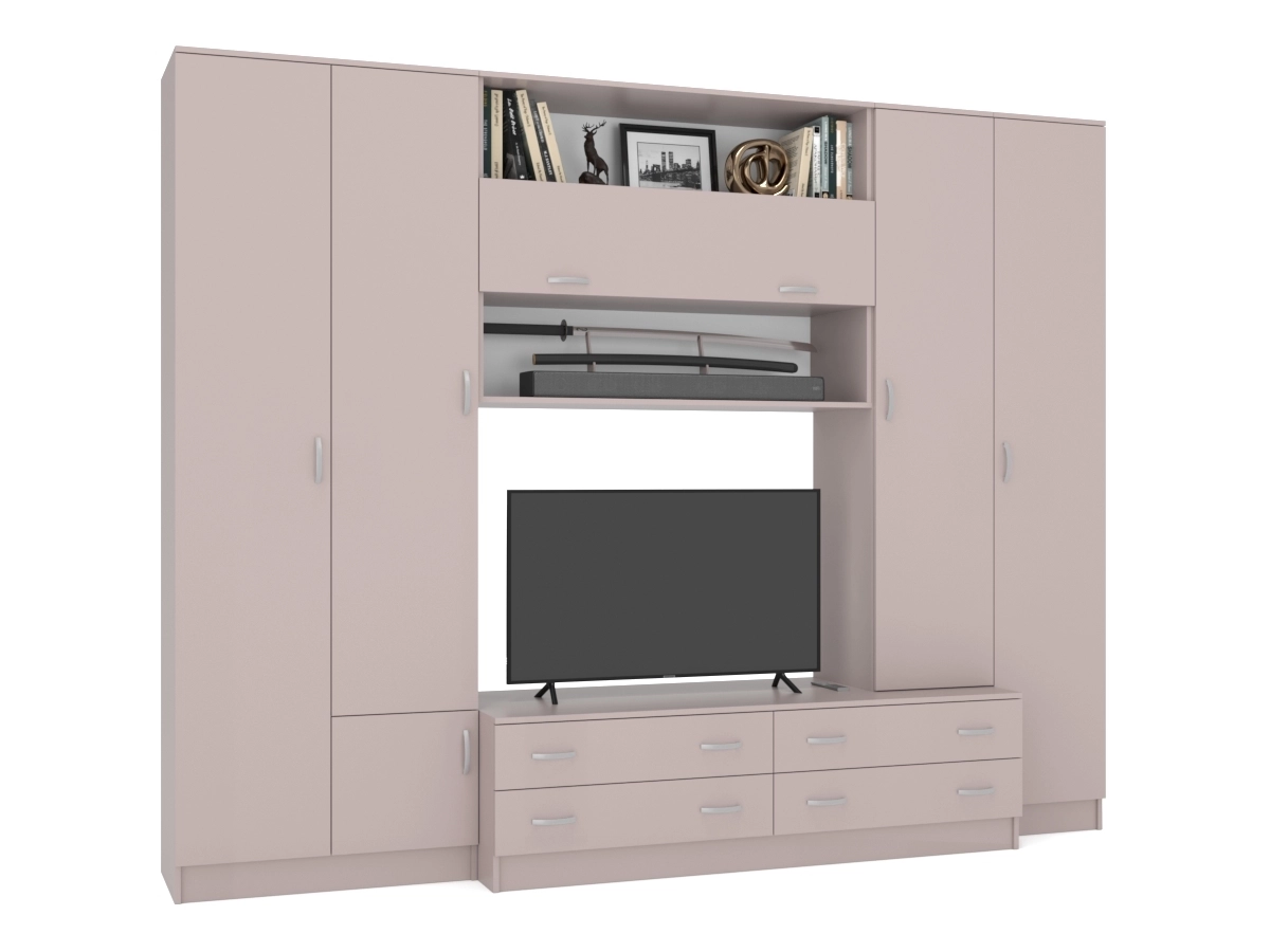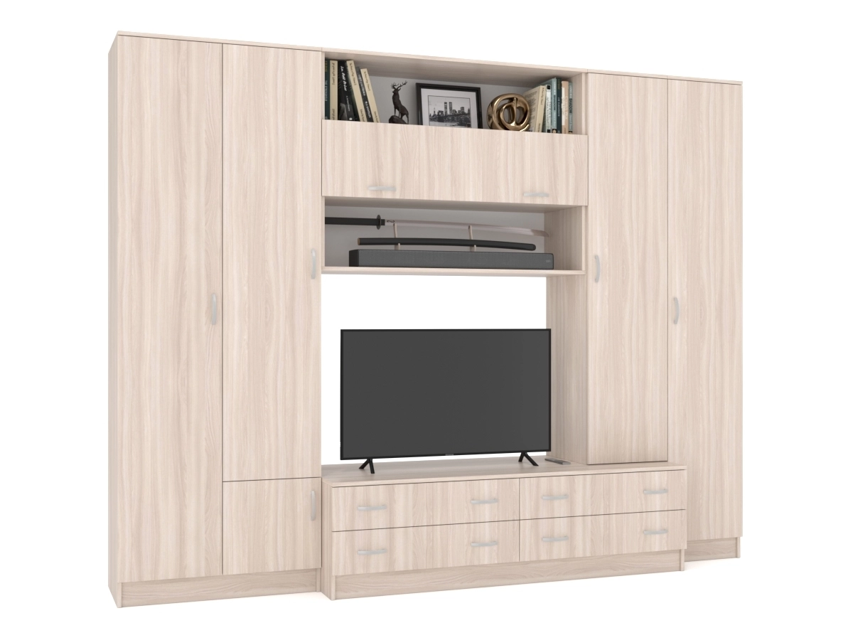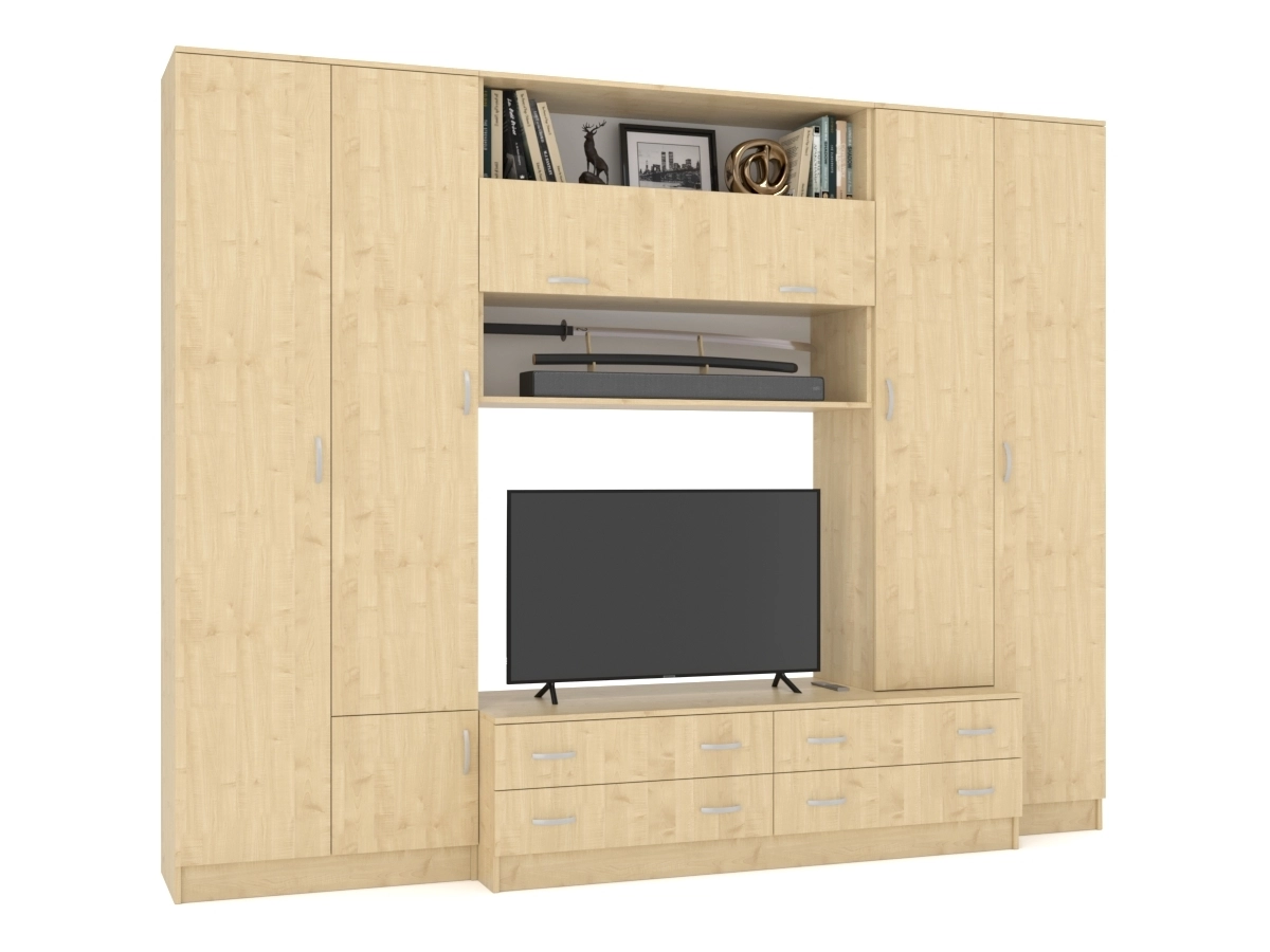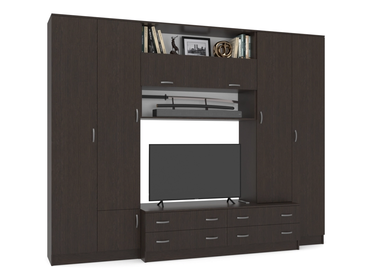 Стенка Аврелия 16 люкс – очень эффектная мебель в гостиную. Центральное место занимает ТВ-тумба с выдвижными ящиками и полка с откидной дверкой. По бокам удобно расположены шкафы, где разместится много вещей. Отличный вариант для уютной комнаты.