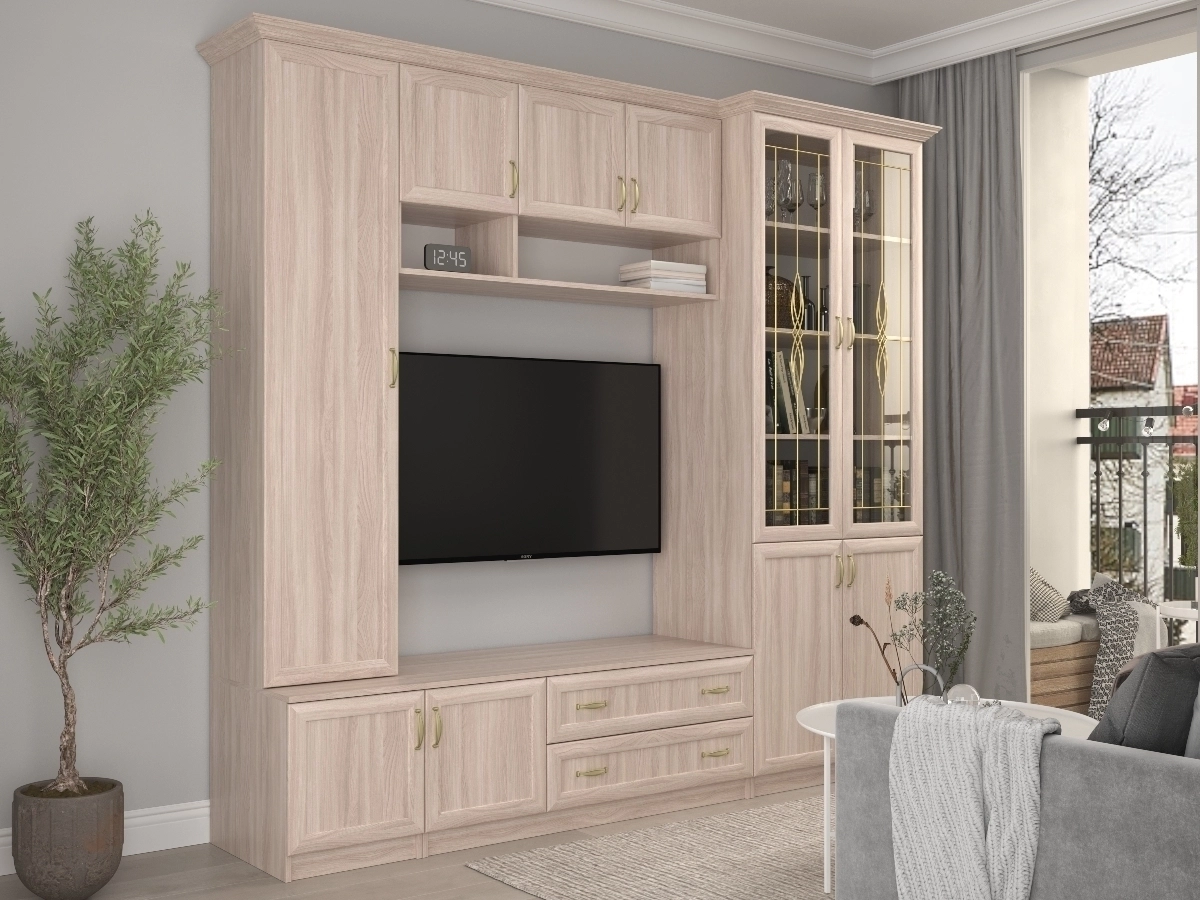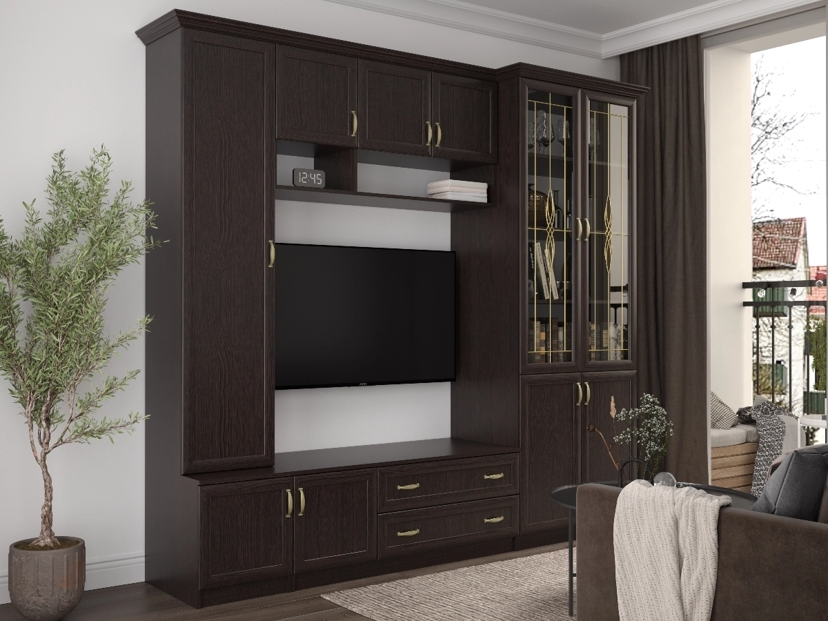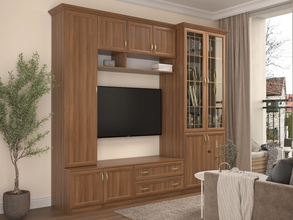 Изысканная Екатерина-23 Стенка, изготовленная в классическом стиле, позволит наполнить комнату атмосферой уюта и комфорта. Стенка оборудована разнообразными полками, где можно разместить книги, элементы декора. Также предусмотрена тумба под телевизор, выдвижные ящики для хранения различных вещей. У нас можно заказать стенку различных цветов и размеров.