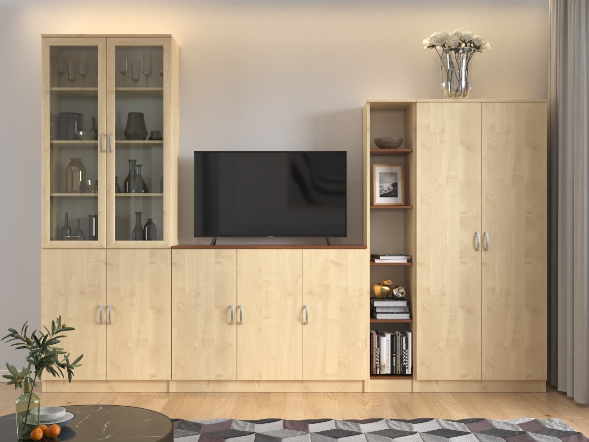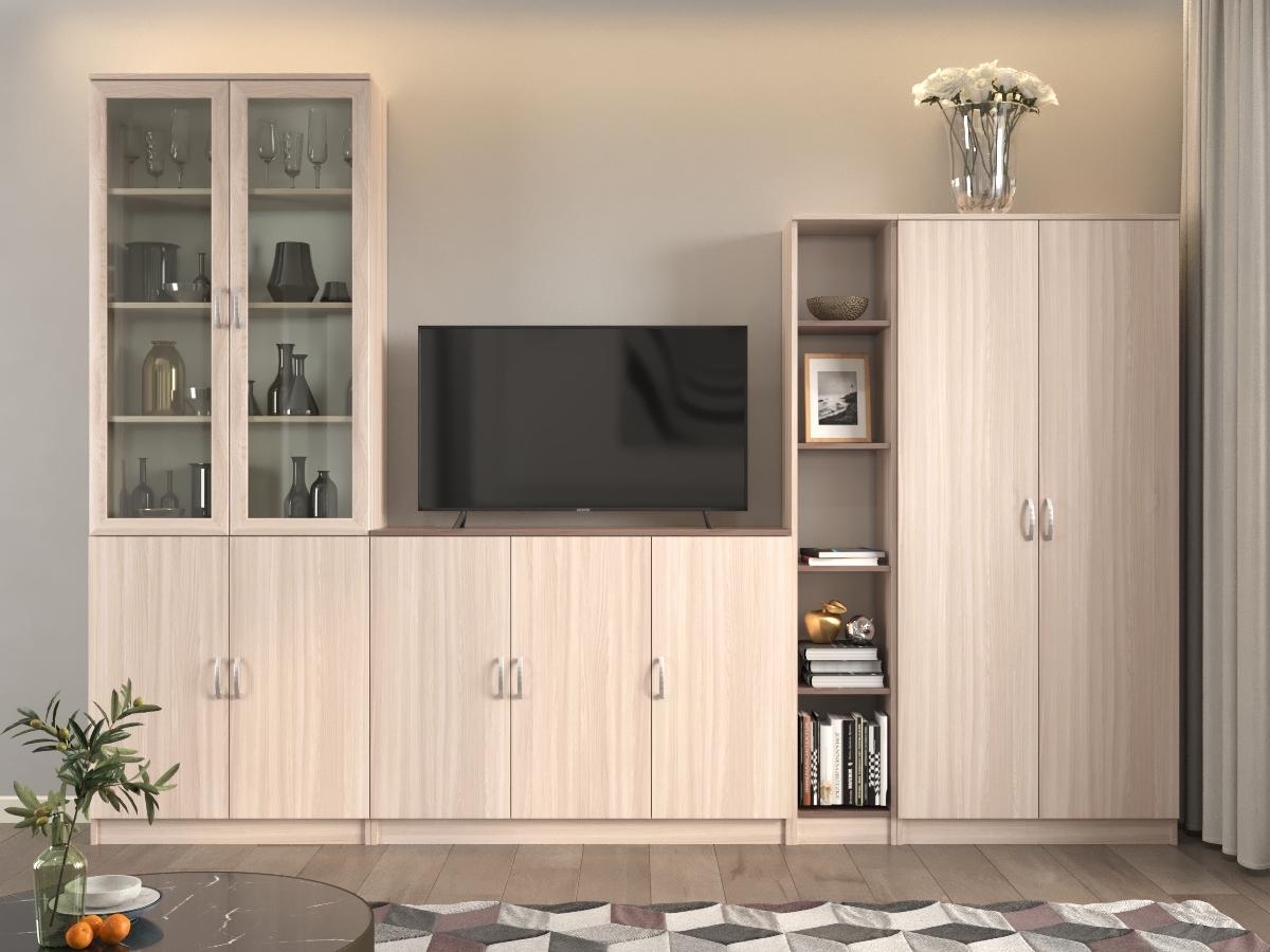 Стенка Композиция 8 — содержит огромное число мест для организованного хранения самых разных предметов. Ее сдержанный образ наполнен элегантностью, создаваемой скромностью фасадов. Модель подразделяется на продуманные секции.