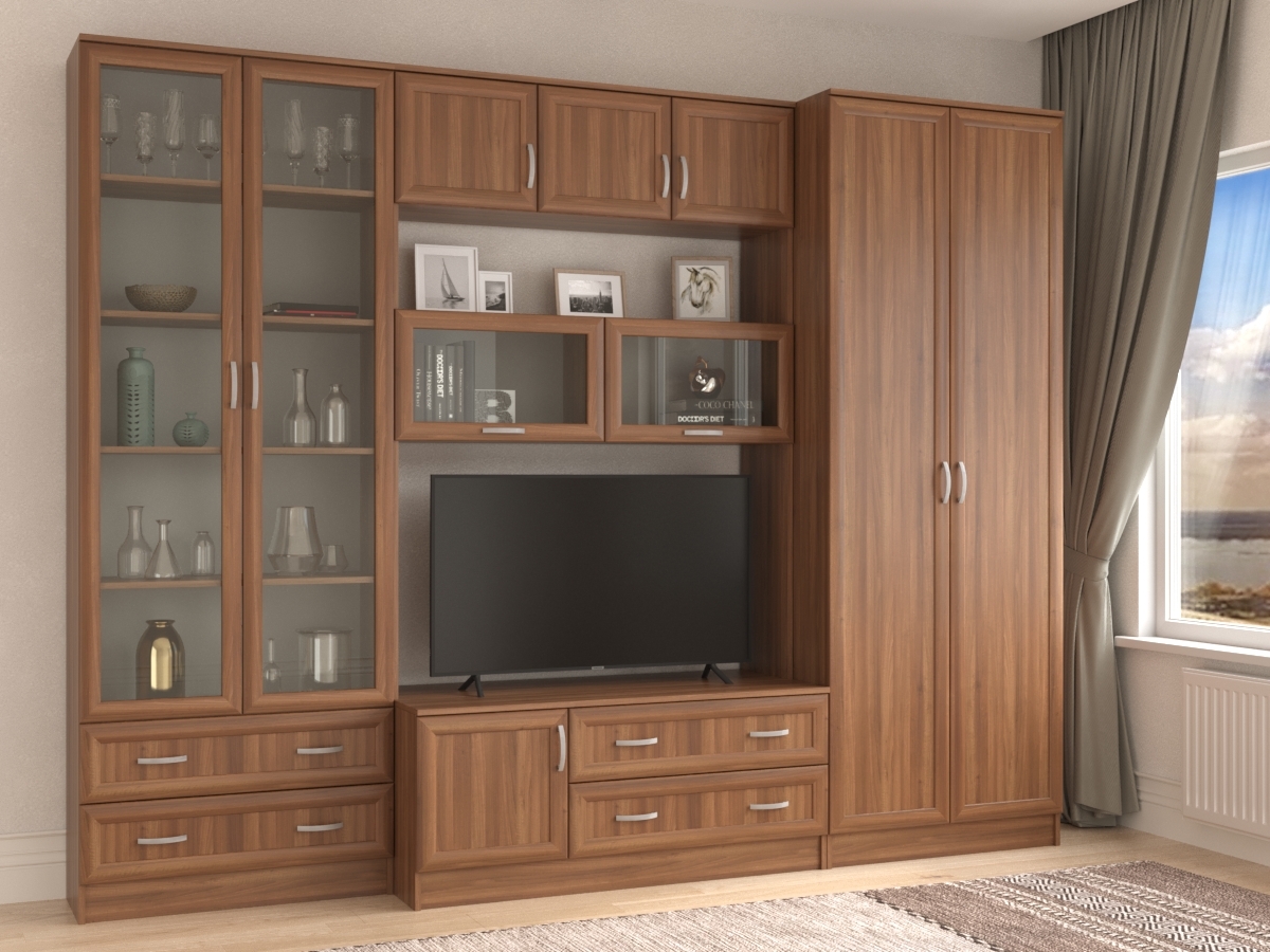 Изысканная Стенка Корсика-2, изготовленная в классическом стиле, позволит наполнить комнату атмосферой уюта и комфорта. Стенка оборудована разнообразными полками, где можно разместить книги, элементы декора. Также предусмотрена тумба под телевизор, выдвижные ящики для хранения различных вещей и двумя шкафами по бокам. У нас можно заказать стенку различных цветов и размеров.