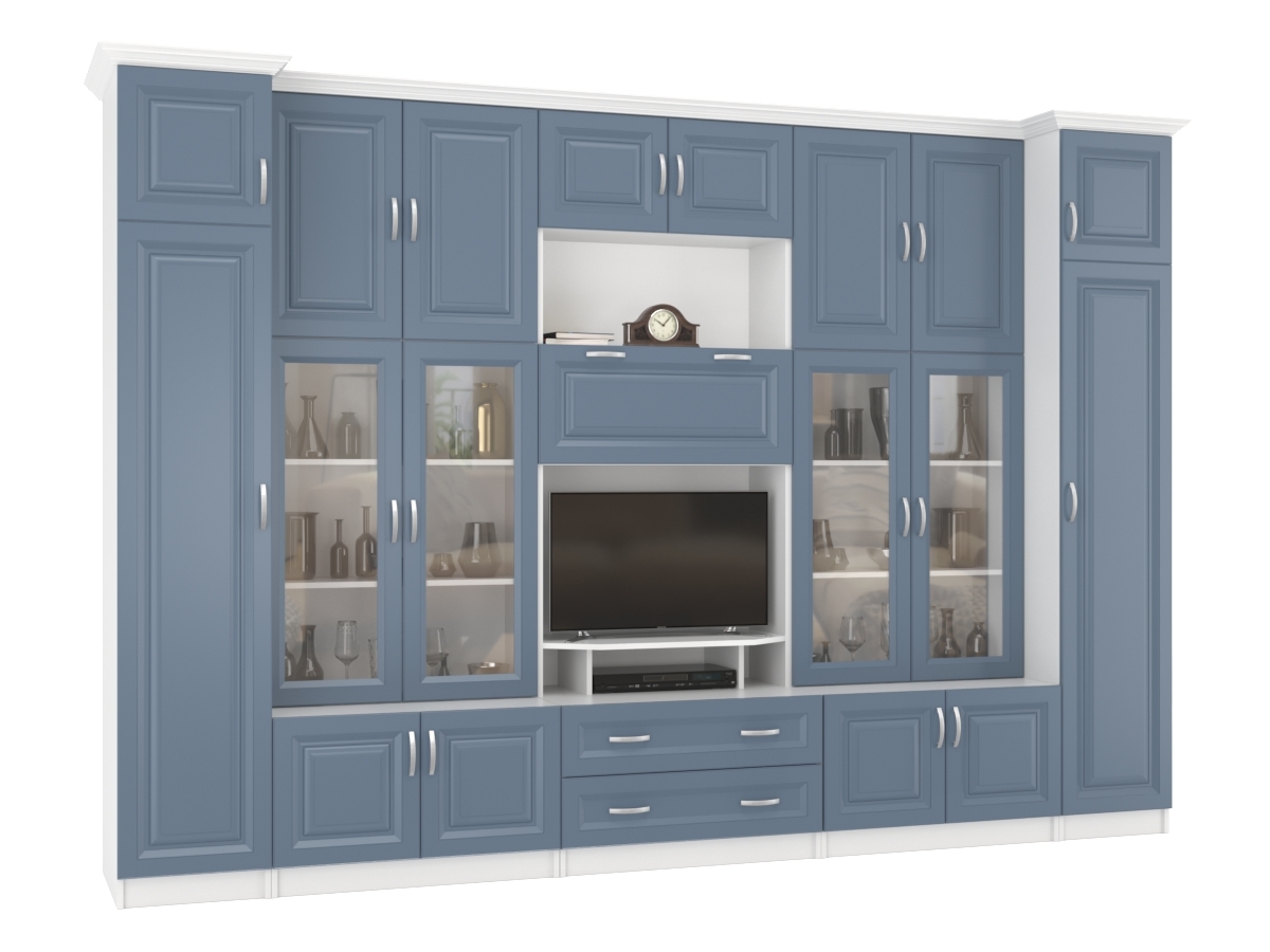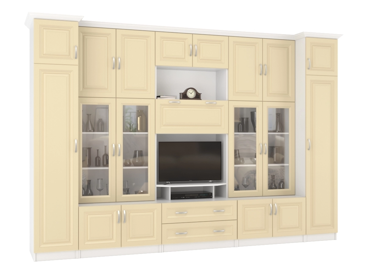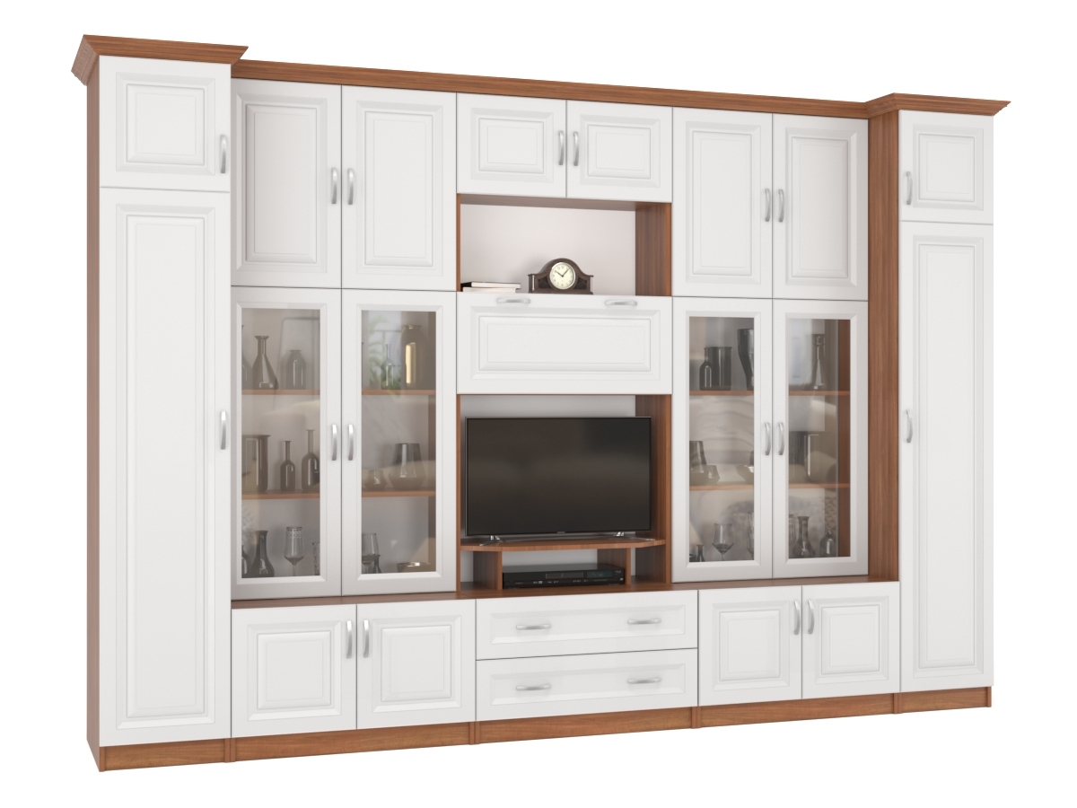 Изысканная Стенка Марина-7, изготовленная в современном классическом стиле, позволит наполнить комнату атмосферой уюта и комфорта. Стенка оборудована разнообразными полками, где можно разместить книги, элементы декора. Также предусмотрена тумба под телевизор, выдвижные ящики для хранения различных вещей. У нас можно заказать стенку различных цветов и размеров.
