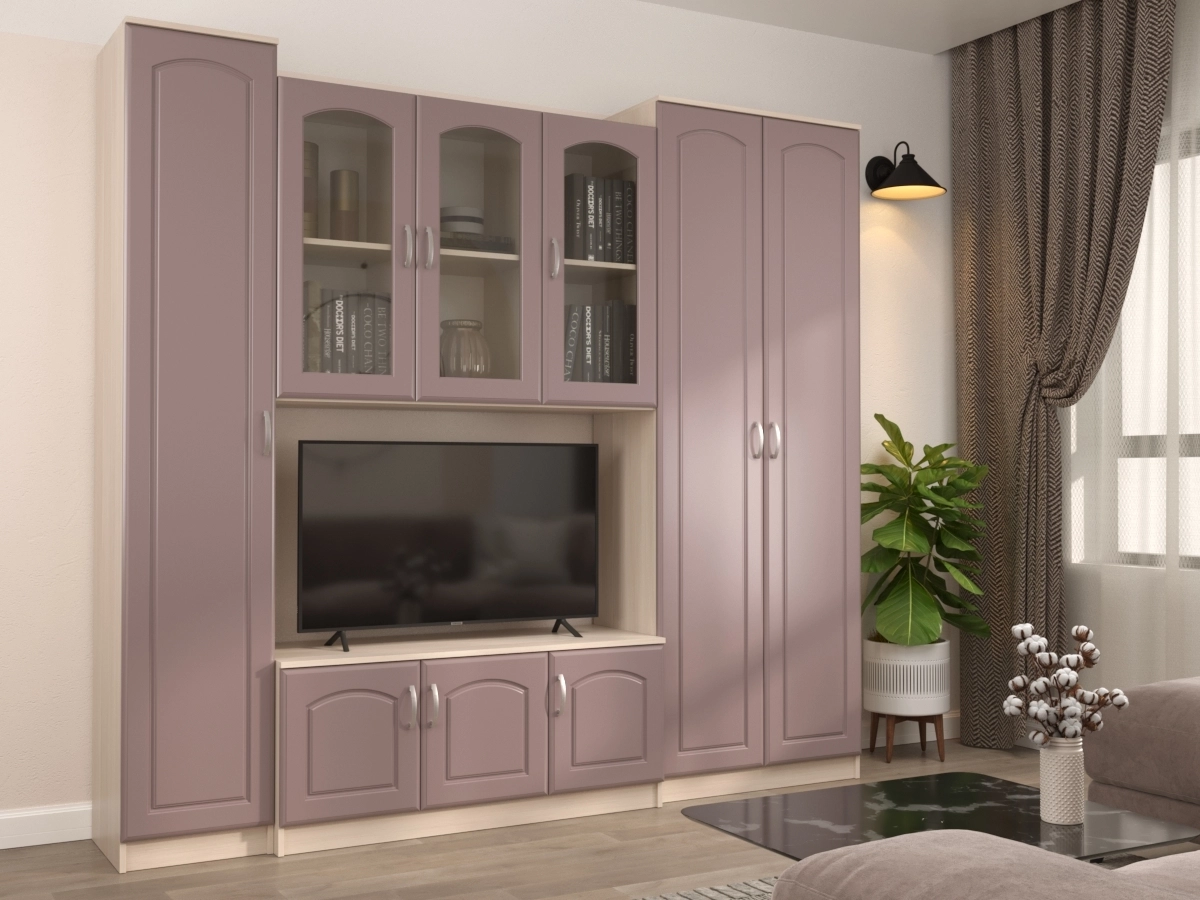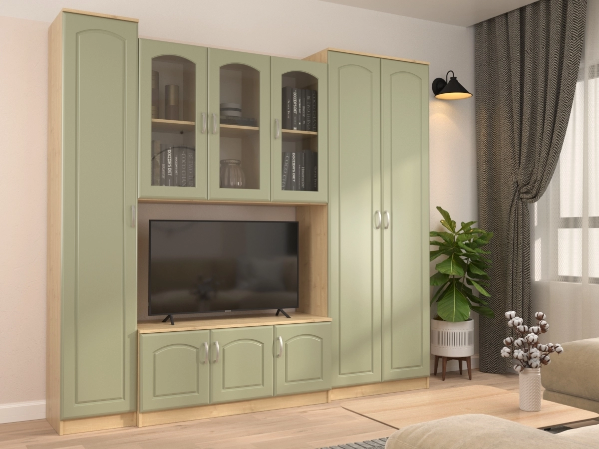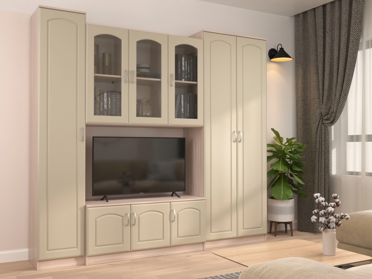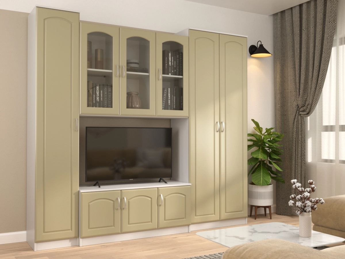 Изысканная современная Стенка МДФ Георгий, изготовленная в стиле современной классики, позволит наполнить комнату атмосферой уюта и комфорта. Стенка изготовлена из ламинированного ДСП и фасад МДФ, оборудована разнообразными полками, где можно разместить книги, элементы декора. Также предусмотрена тумба под телевизор и антресоль. У нас можно заказать стенку различных цветов и размеров.