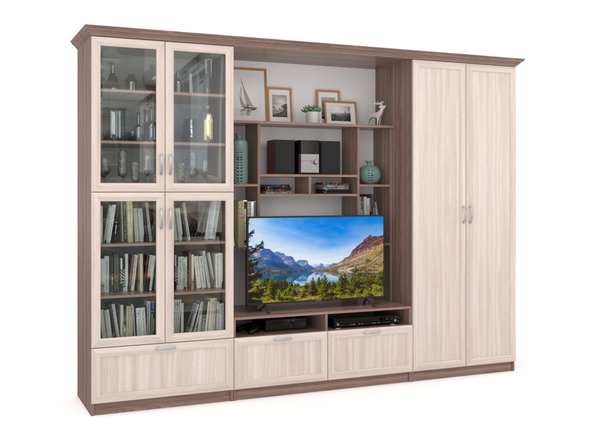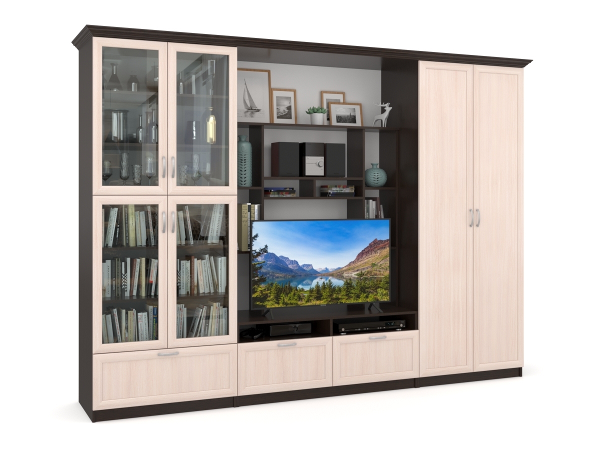 Изысканная Николь-1, изготовленная в классическом стиле, позволит наполнить комнату атмосферой уюта и комфорта. Стенка изготовлена из ламинированного ДСП, оборудована разнообразными полками, где можно разместить книги, элементы декора. Также предусмотрена тумба под телевизор, выдвижные ящики для хранения различных вещей. У нас можно заказать стенку различных цветов и размеров.