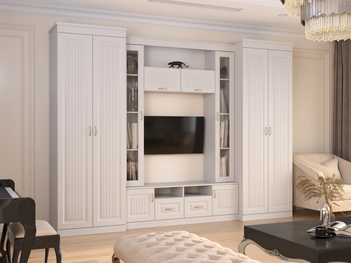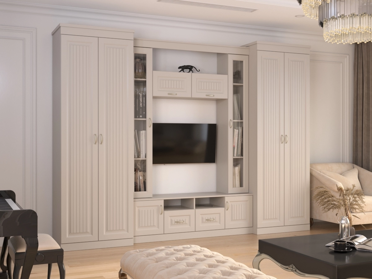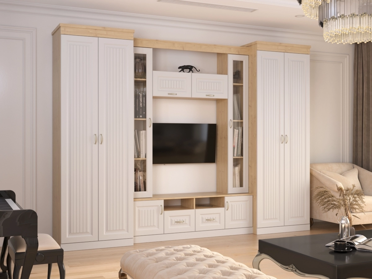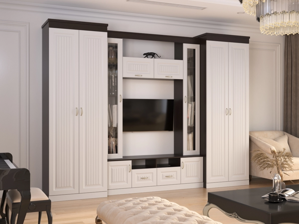 Изысканная Стенка Нинель-4, изготовленная в классическом стиле, позволит наполнить комнату атмосферой уюта и комфорта. Стенка изготовлена из ламинированного ДСП и МДФ, оборудована разнообразными полками, где можно разместить книги, элементы декора. Также предусмотрена тумба под телевизор, выдвижные ящики для хранения различных вещей. У нас можно заказать стенку различных цветов и размеров.