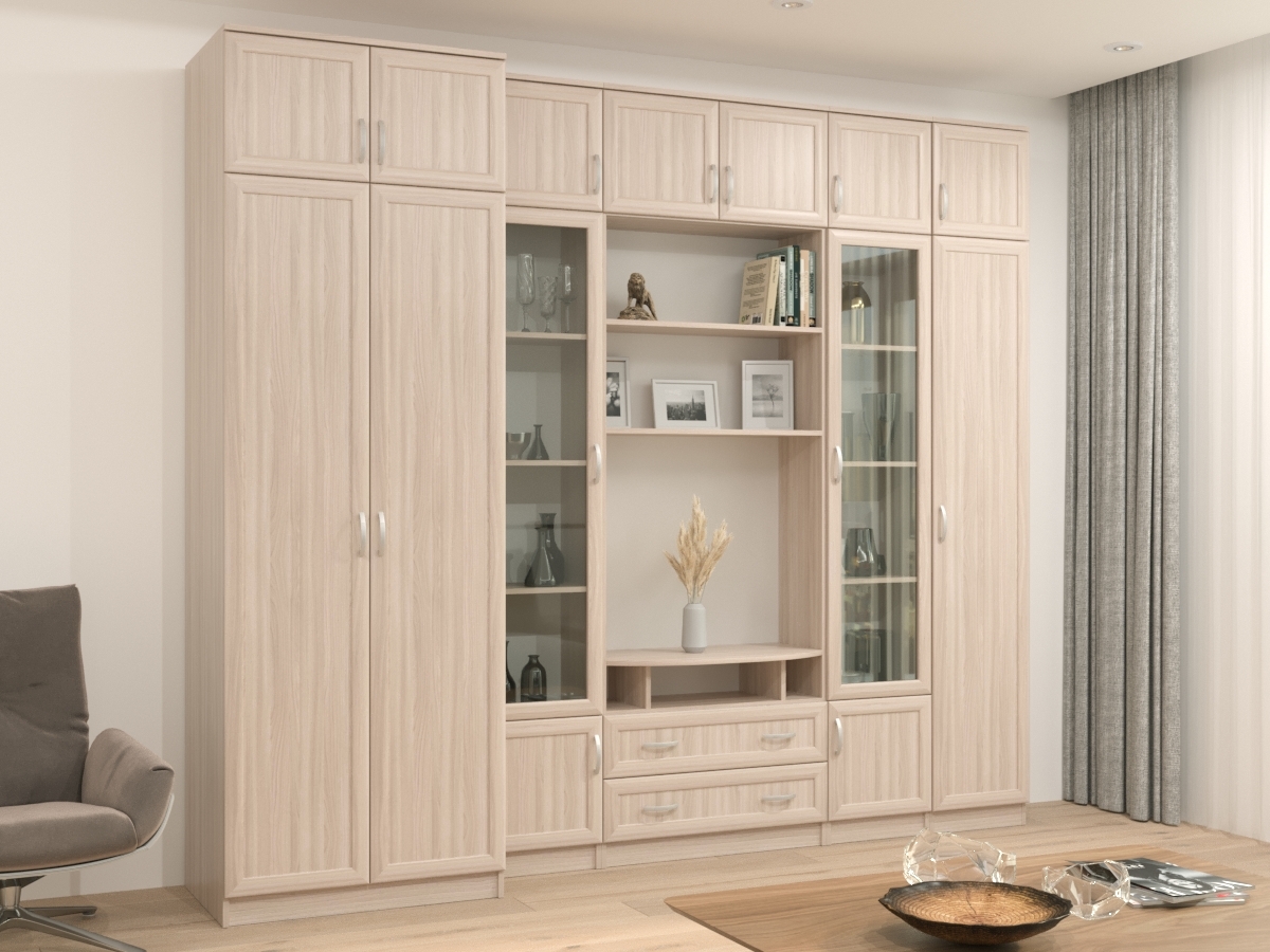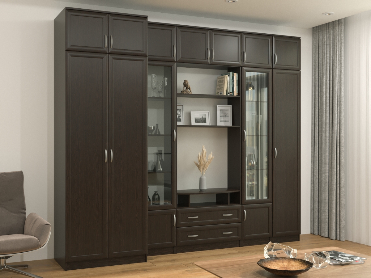 Изысканная Стенка Олимп-5М, изготовленная в классическом стиле, позволит наполнить комнату атмосферой уюта и комфорта. Стенка изготовлена из ламинированного ДСП и МДФ, оборудована разнообразными полками, где можно разместить книги, элементы декора. Также предусмотрена тумба под телевизор, выдвижные ящики для хранения различных вещей. У нас можно заказать стенку различных цветов и размеров.
