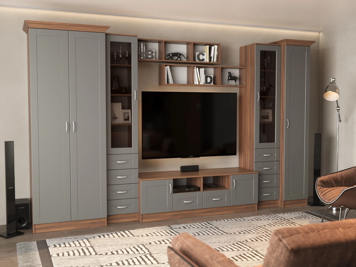Изысканная Премьера - 1 Стенка, изготовленная в стиле современной классики, позволит наполнить комнату атмосферой уюта и комфорта. Стенка оборудована разнообразными полками, где можно разместить книги, элементы декора. Также предусмотрена тумба под телевизор, выдвижные ящики для хранения различных вещей. У нас можно заказать стенку различных цветов и размеров.