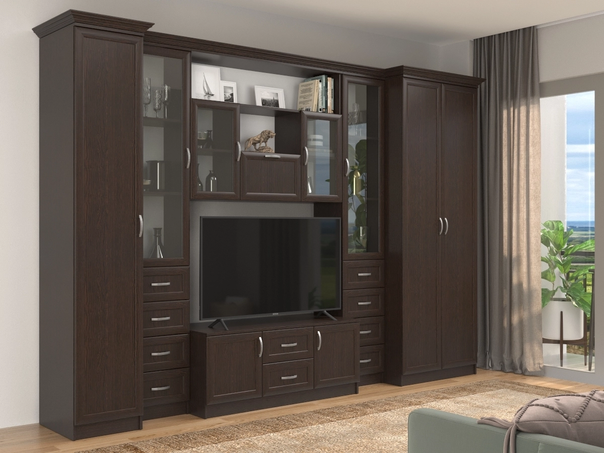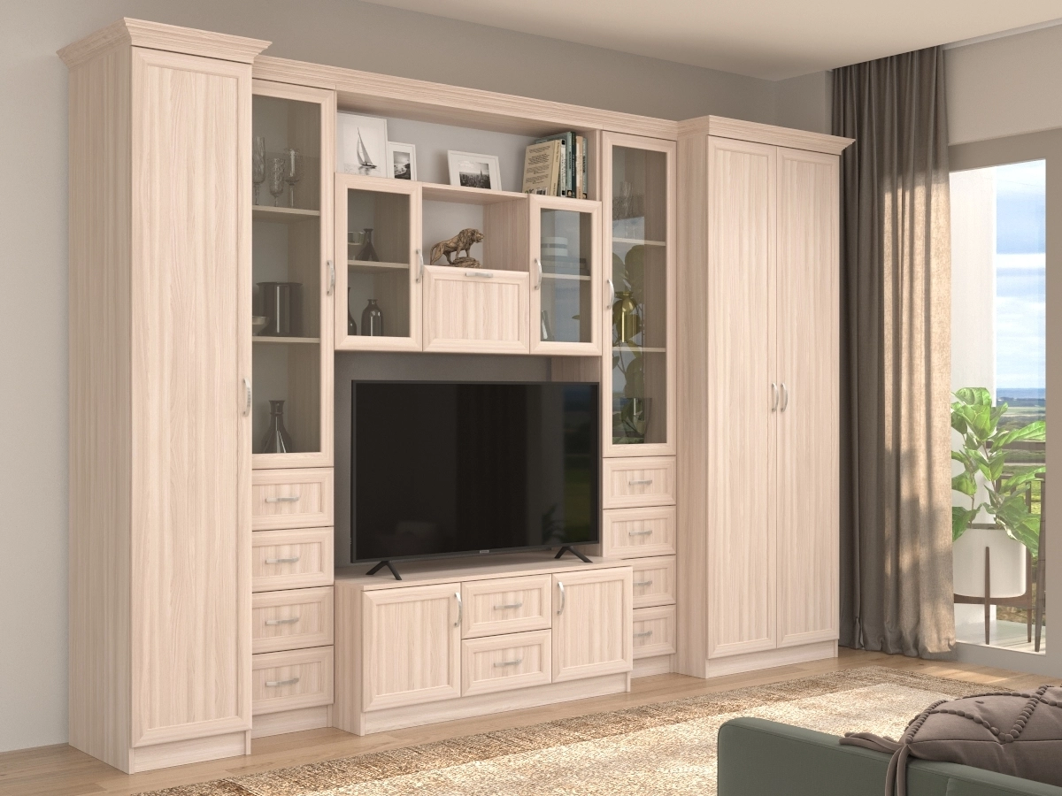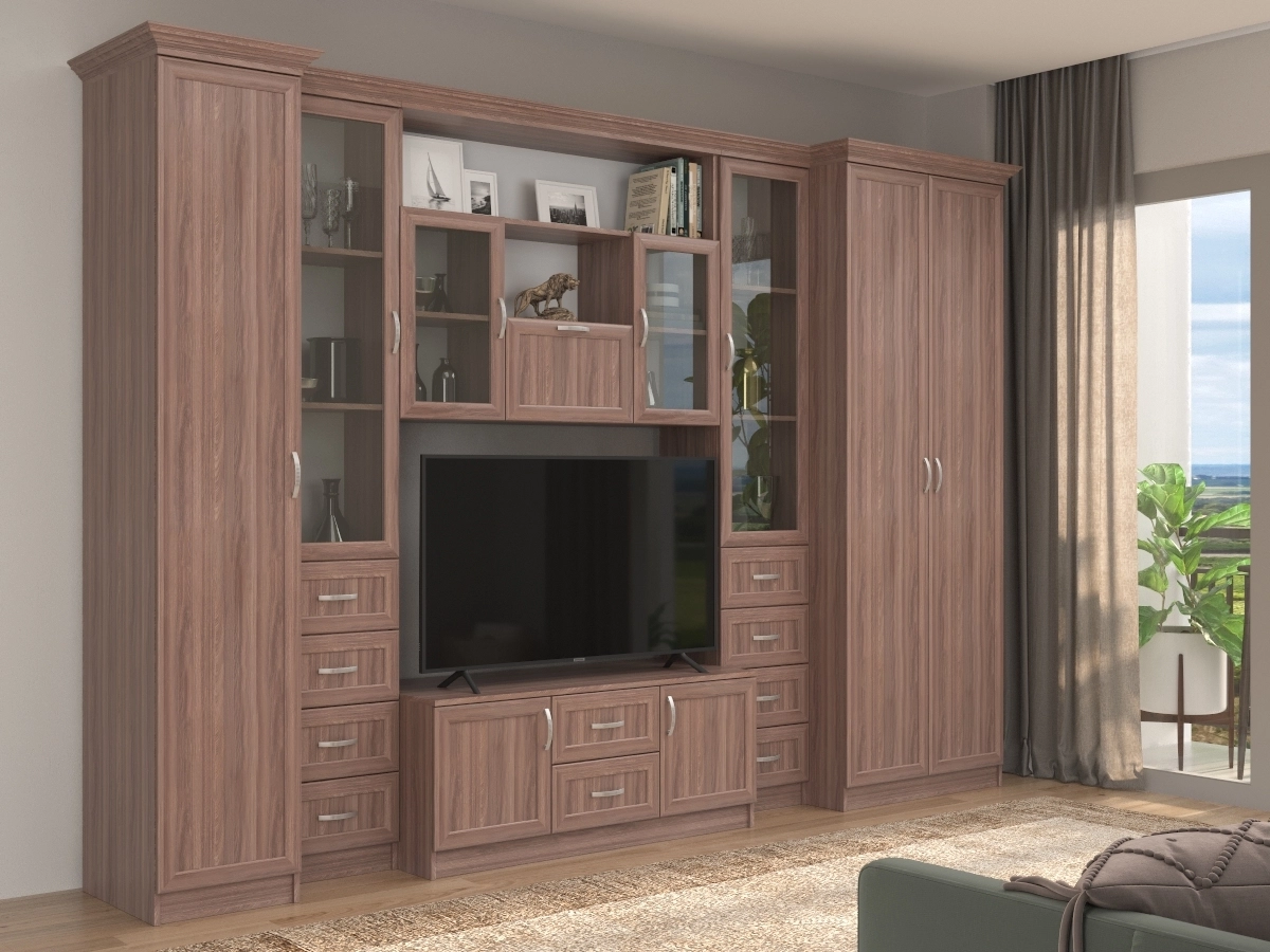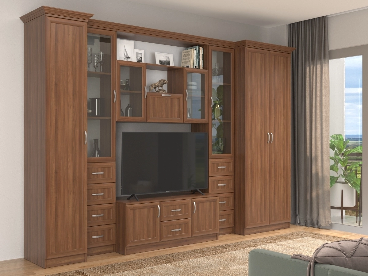 Изысканная Премьера-1 Стенка, изготовленная в классическом стиле, позволит наполнить комнату атмосферой уюта и комфорта. Стенка изготовлена из ламинированного ДСП, оборудована разнообразными полками, где можно разместить книги, элементы декора. Также предусмотрена тумба под телевизор, выдвижные ящики для хранения различных вещей. У нас можно заказать стенку различных цветов и размеров.
