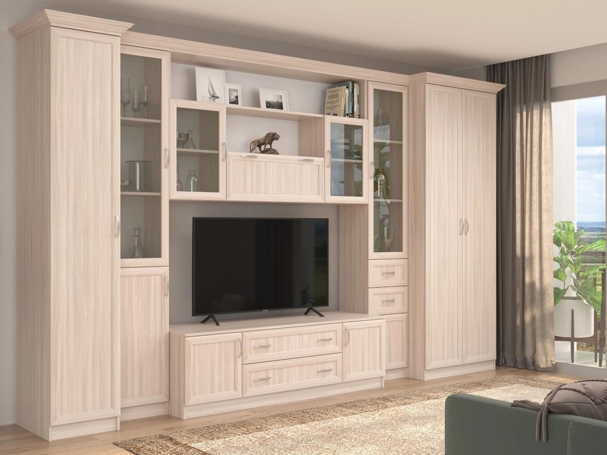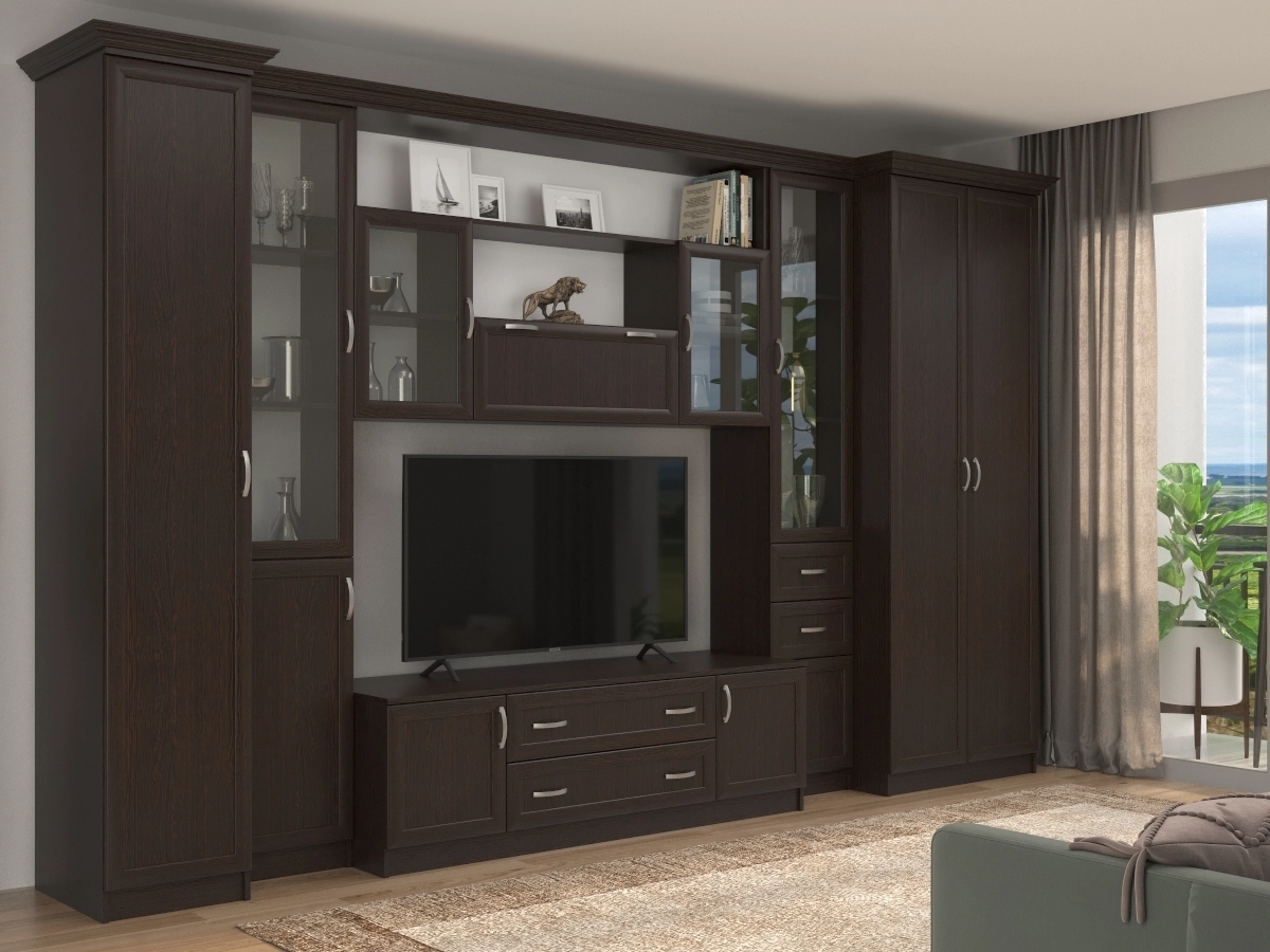 Изысканная Премьера-2 Стенка, изготовленная в классическом стиле, позволит наполнить комнату атмосферой уюта и комфорта. Стенка изготовлена из ламинированного ДСП и МДФ, оборудована разнообразными полками, где можно разместить книги, элементы декора. Также предусмотрена тумба под телевизор, выдвижные ящики для хранения различных вещей. У нас можно заказать стенку различных цветов и размеров.