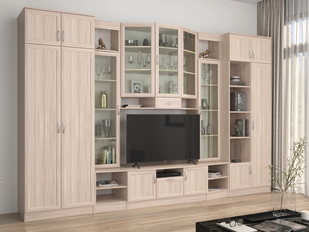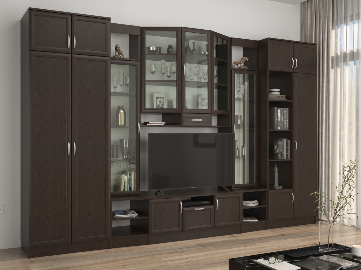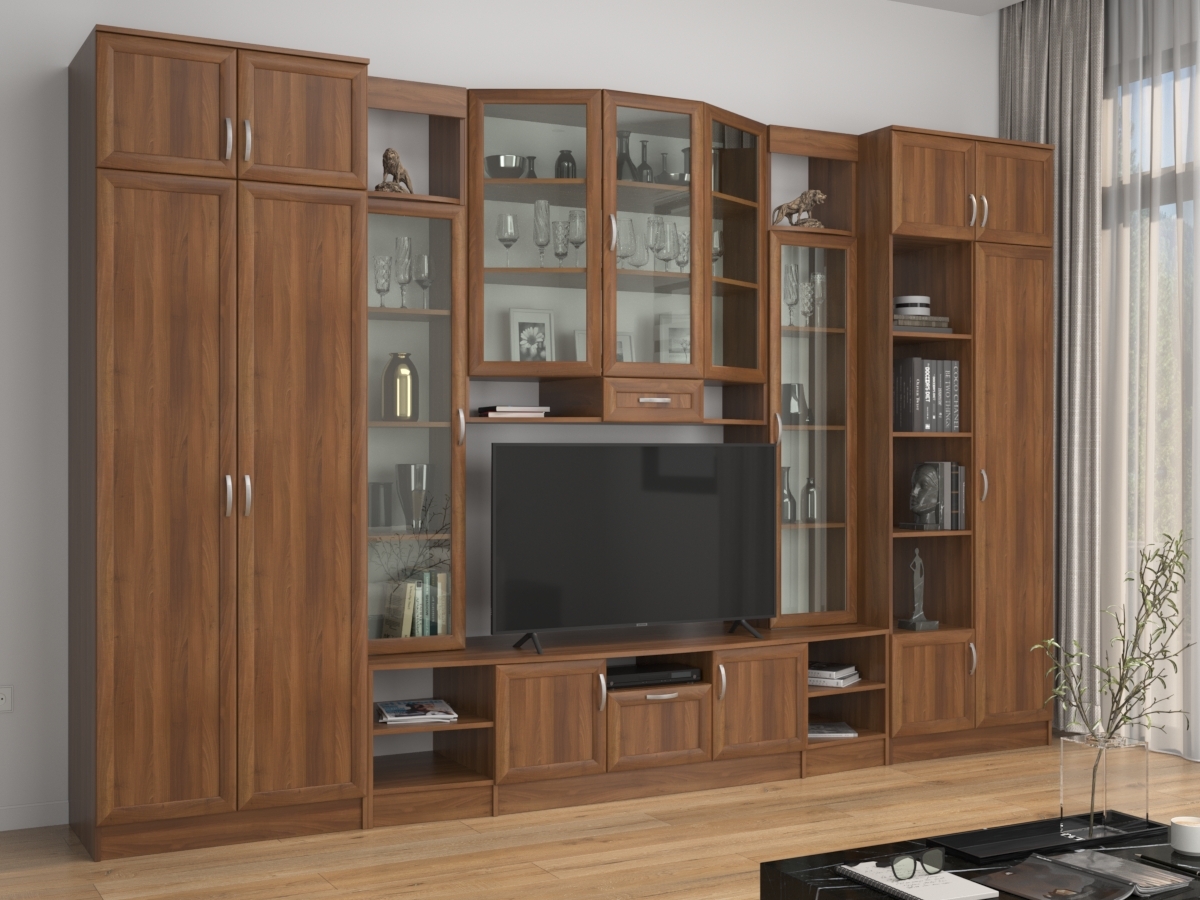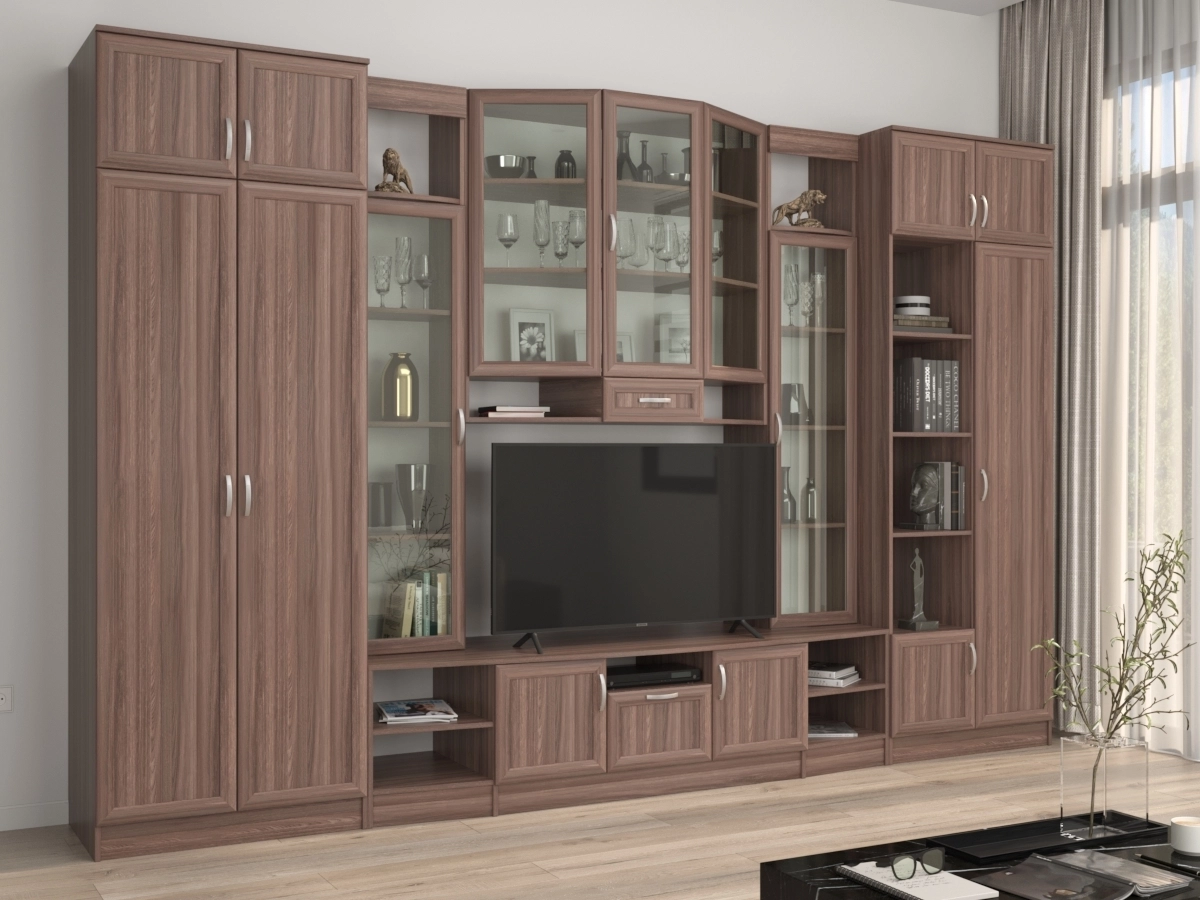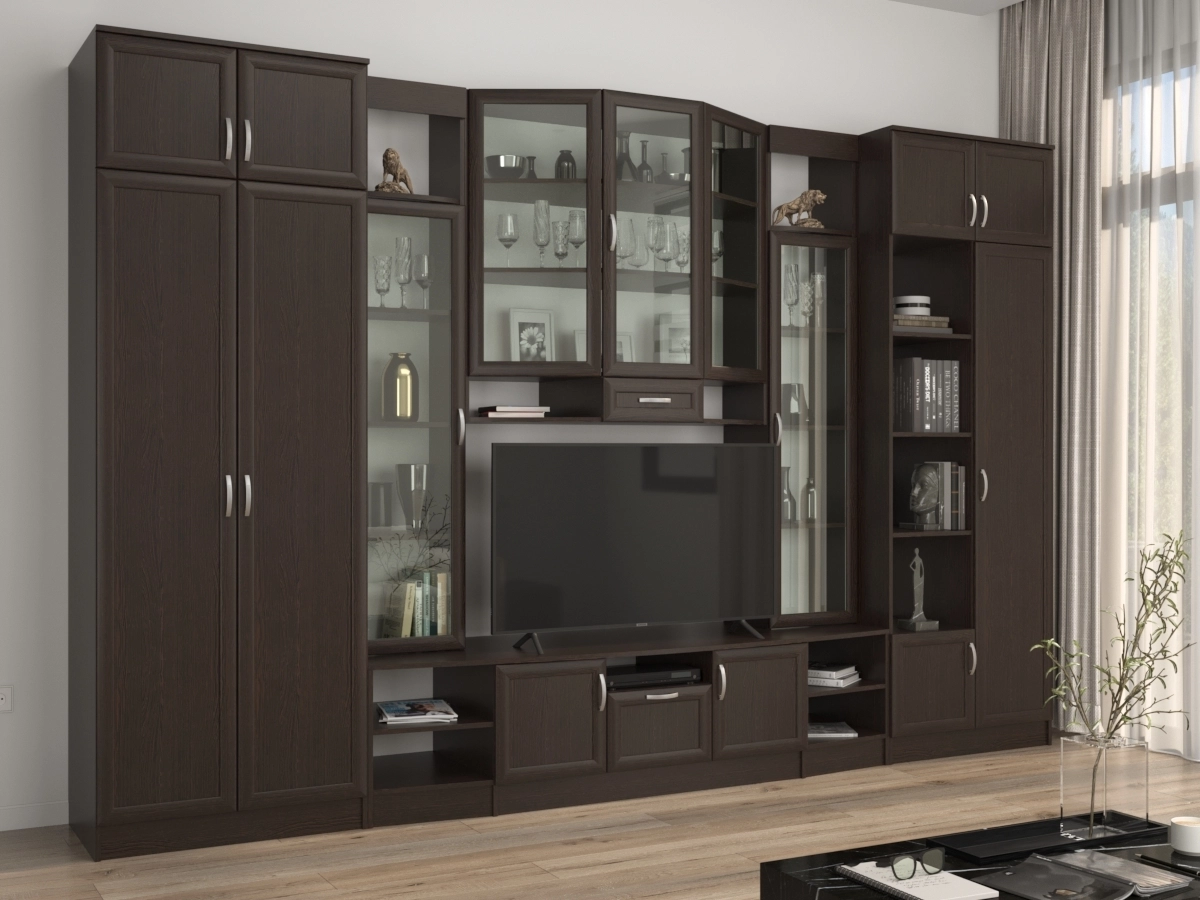 Изысканная Стенка Сильва позволит наполнить комнату атмосферой уюта и комфорта. Стенка изготовлена из ламинированного ДСП, оборудована разнообразными полками, где можно разместить книги, элементы декора. Также предусмотрена тумба под телевизор, выдвижные ящики для хранения различных вещей. У нас можно заказать стенку различных цветов и размеров.
