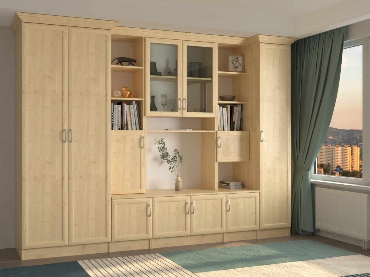Изысканная Трио (2+1) Стенка, изготовленная в классическом стиле, позволит наполнить комнату атмосферой уюта и комфорта. Стенка оборудована разнообразными полками, где можно разместить книги, элементы декора. Также предусмотрена тумба под телевизор, шкаф и пенал для хранения различных вещей. У нас можно заказать стенку различных цветов и размеров.