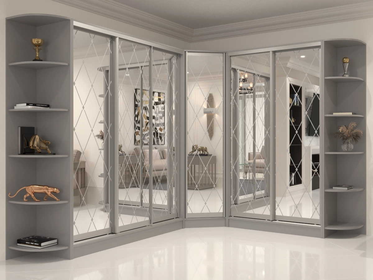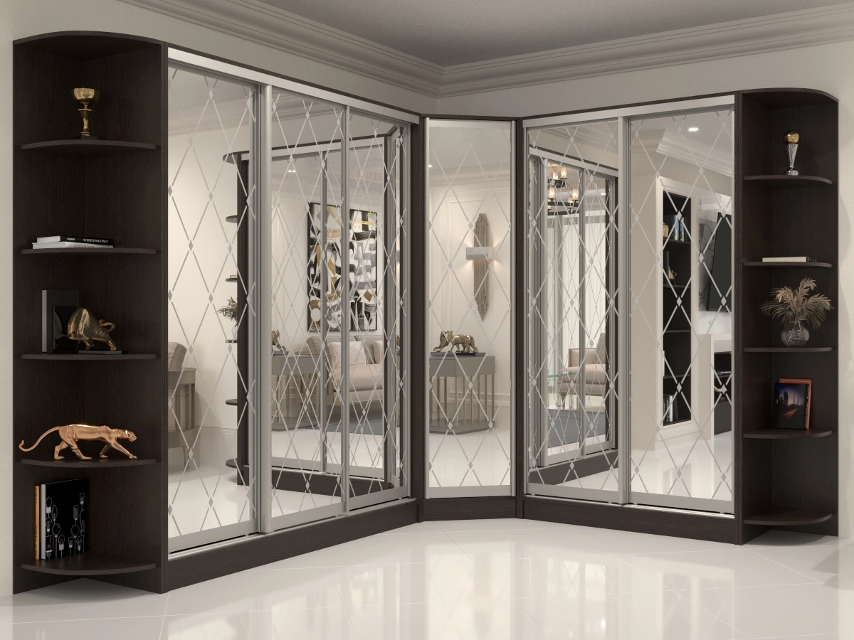 Набор шкафов Стайл - этот великолепный набор шкафов смотрится просто бесподобно. Он представлен двухдверным и трехдверным шкафами, в центре расположен угловой шкаф, удобный и вместительный. С двух сторон имеются стеллажи с открытыми полками для размещения различных вещей. Все шкафы оснащены зеркалами с пескоструйным рисунком.