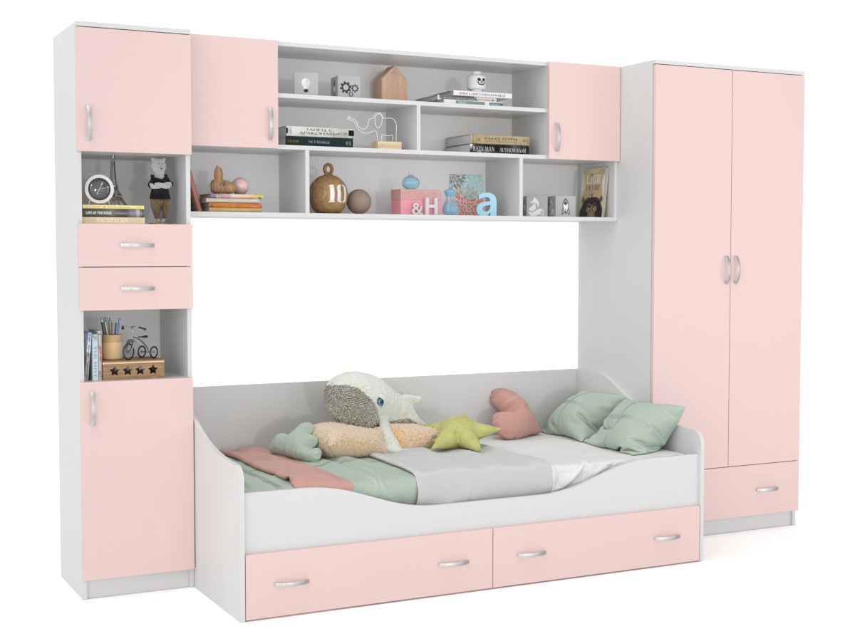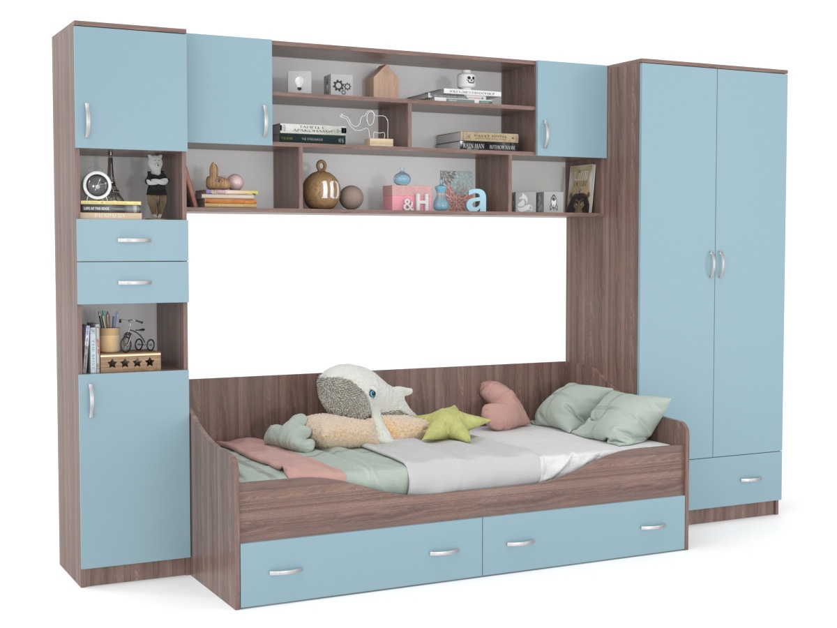 Детская стенка Бусинка – прекрасная стенка в детскую. Пенал представлен ящиками и полками открытого и закрытого типа. Кровать односпальная с ящиками для белья. Сверху есть много открытых полок и два шкафчика. Платяной шкаф двухстворчатый с нижним ящиком. Мебель оснащается металлическими ручками.