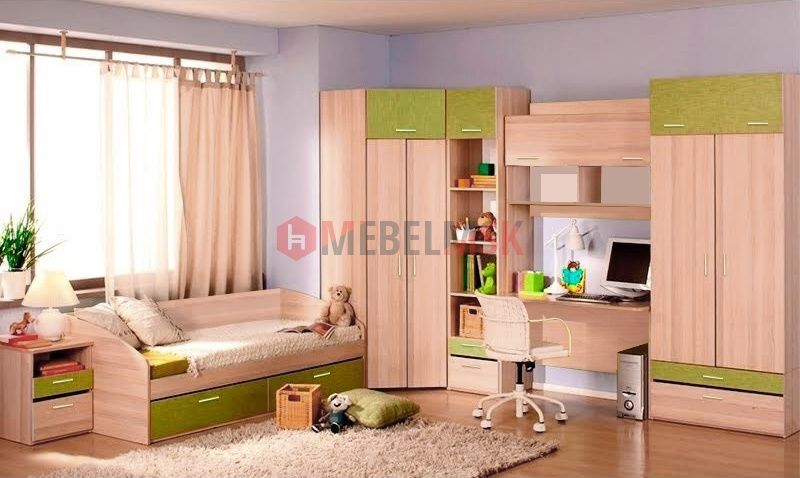Детская стенка Лайм 14 – стенка представлена в спокойном цвете лайм. Она идеальна для меблировки детской комнаты. Удобная стенка комплектуется кроватью и письменным столом. С помощью такой стенки можно обставить полностью комнату. Угловой шкаф вместительный и очень большой. В композицию также входят открытые полки, колонка, тумба и распашной шкаф.