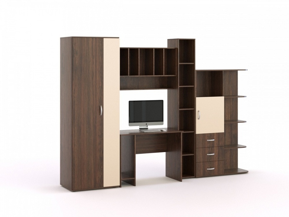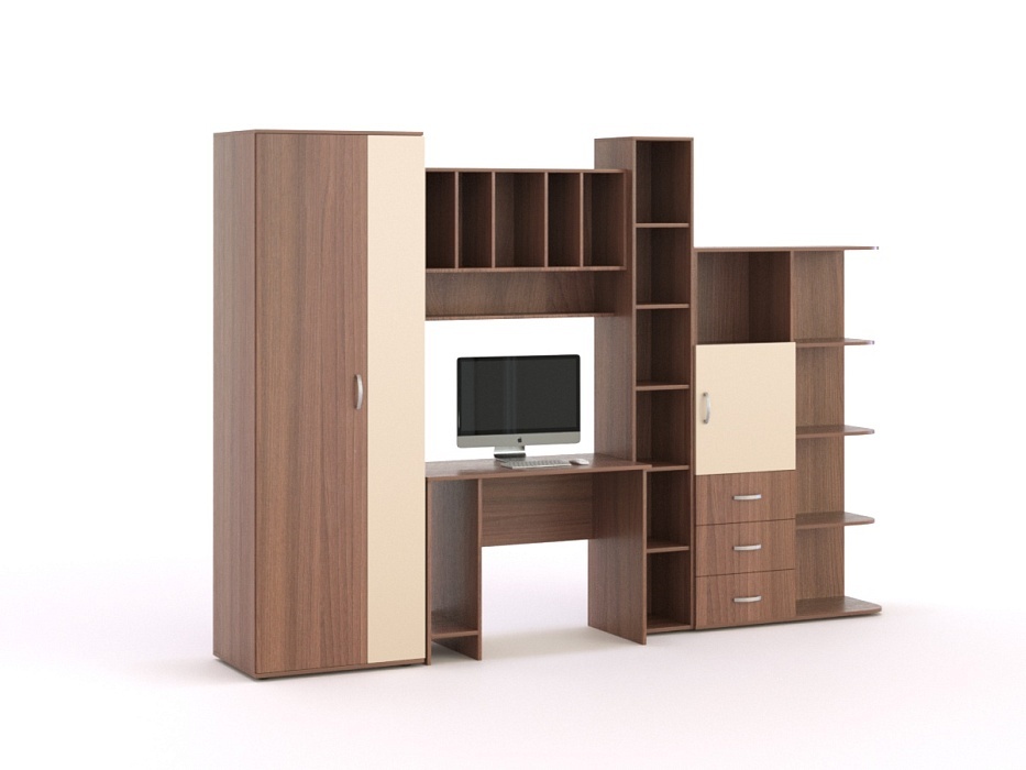 Детская стенка «Отличник 2» представляет собой продуманный гарнитур для комнаты подростка. Варианты цветового исполнения позволяют подобрать комплект как для девочки, так и для мальчика. Слева находится шкаф со сплошной дверью, в котором удобно хранить одежду и другие вещи. К нему примыкает учебная зона: компактный компьютерный стол с полками над ним. Рядом — узкий пенал с полками для книг, учебников и пр. Справа находится комбинированный стеллаж: отделения с дверцей и открытое, ящики, угловые закругленные полочки.