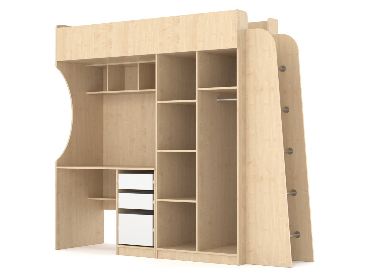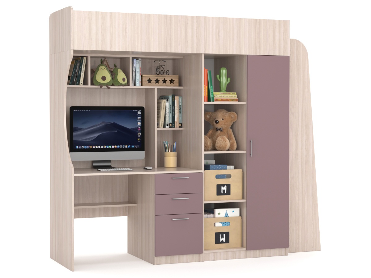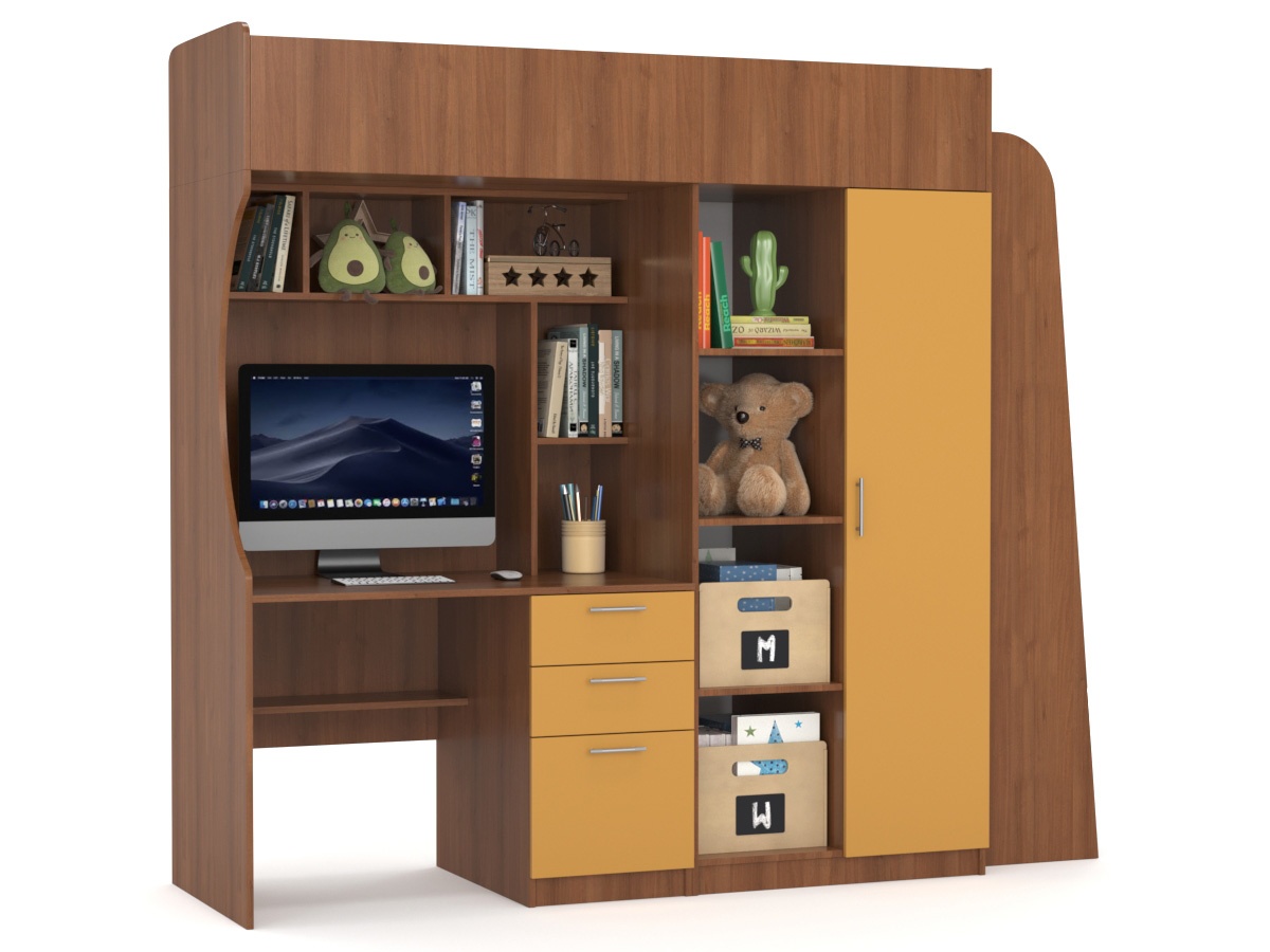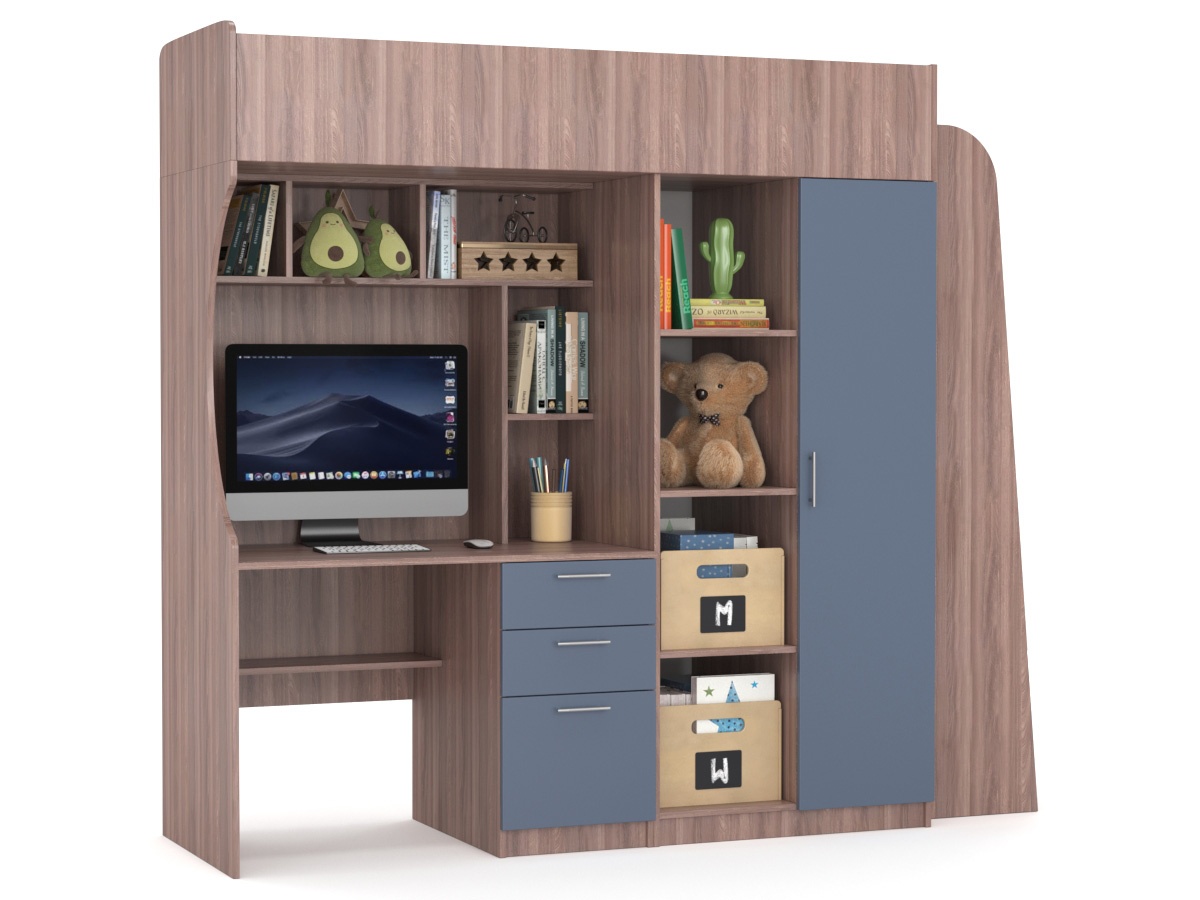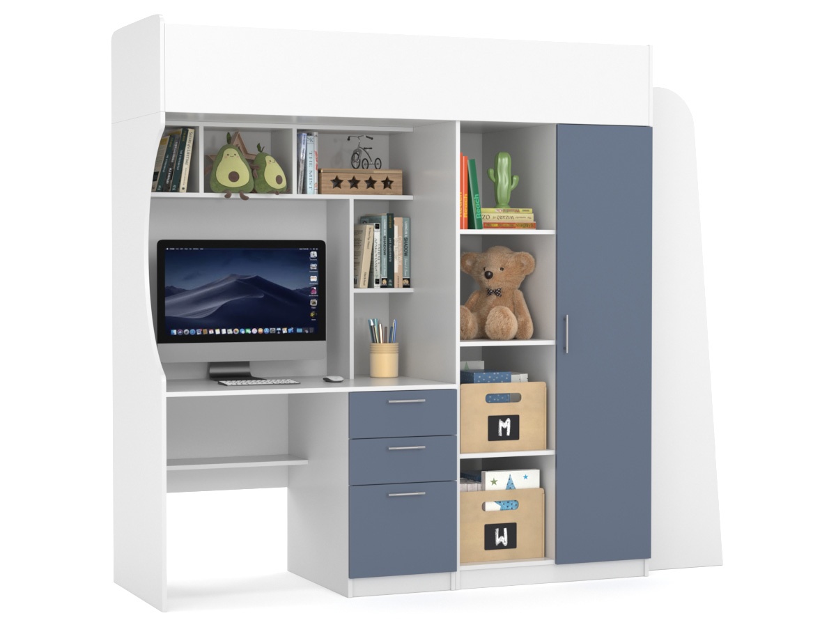 Детский гарнитур В гостях у сказки 12 — отличный гарнитур. Кровать чердачного типа надежно спрятана за высоким бортиком. Под ней находится рабочая зона — компьютерный стол с тумбочкой и книжными полками, открытый пенал и вместительный шкаф для одежды.