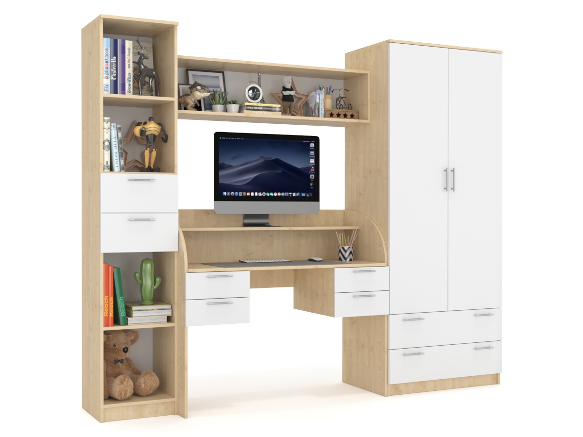 Детский гарнитур В гостях у сказки 14 - подойдет для комнаты ребенка школьного возраста. В комплект входит комбинированный узкий стеллаж для книг и игрушек, книжная полка со стеклянной дверцей, компьютерный стол с ящиками по бокам. Также гарнитур включает в себя шкаф с распашными дверцами и ящиками. Модель стильно украшена фотопечатью.
