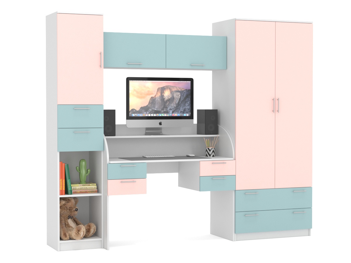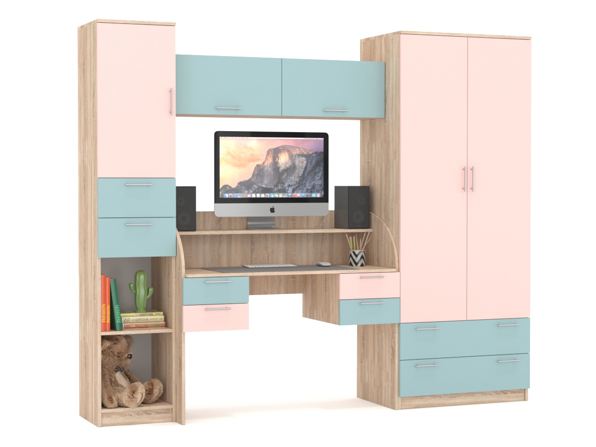 Детский гарнитур В гостях у сказки 20 – очень яркая детская стенка для ребенка. Компьютерный стол выполняет функцию письменного и рабочего. Шкаф для одежды состоит из платяного отсека и из нижних выдвижных ящиков. Над столом расположены закрытые полки. Есть пенал с полками и ящиками.