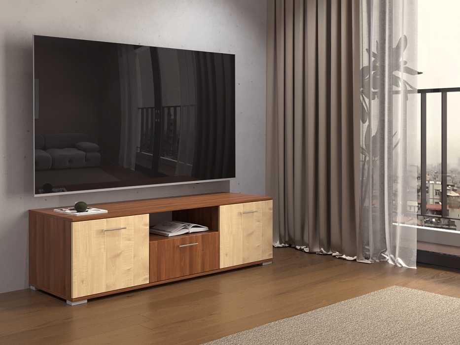 Комод Блеск 11 – комод станет идеальным вариантом для меблировки гостиной, который стоит на ножках. Есть два отсека с откидными дверцами. В центре выдвижной ящик и открытая полка. Комод имеет три ручки. На столешнице можно разместить телевизор, также она идеально подойдет для демонстрации украшений и аксессуаров.
