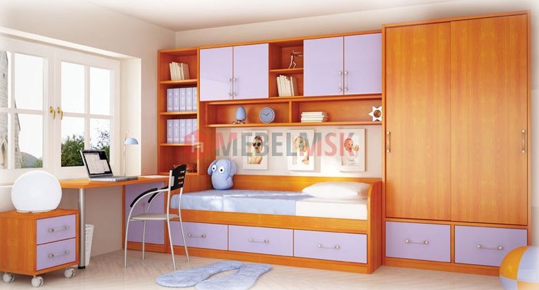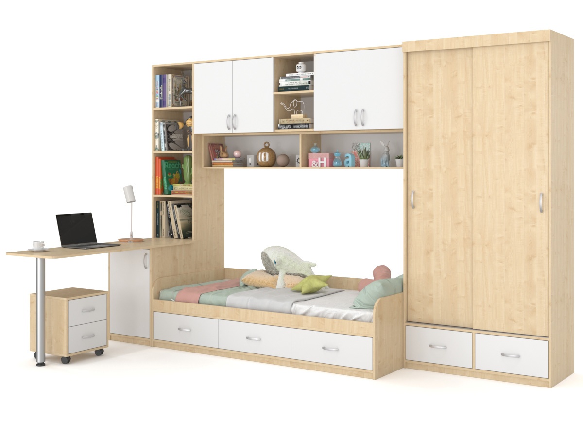 Детский гарнитур Ангел — красивый и практичный модульный гарнитур. В набор входит письменный стол, тумба на колесиках, книжный стеллаж. По центру гарнитура кровать с тремя ящиками снизу, дополненная сверху книжными полками и навесным шкафчиком с дверцами. Справа от нее находится платяной шкаф с раздвижными дверями и глубокими ящиками в нижней части. Мебель отлично впишется в детскую, создавая уют и комфорт.