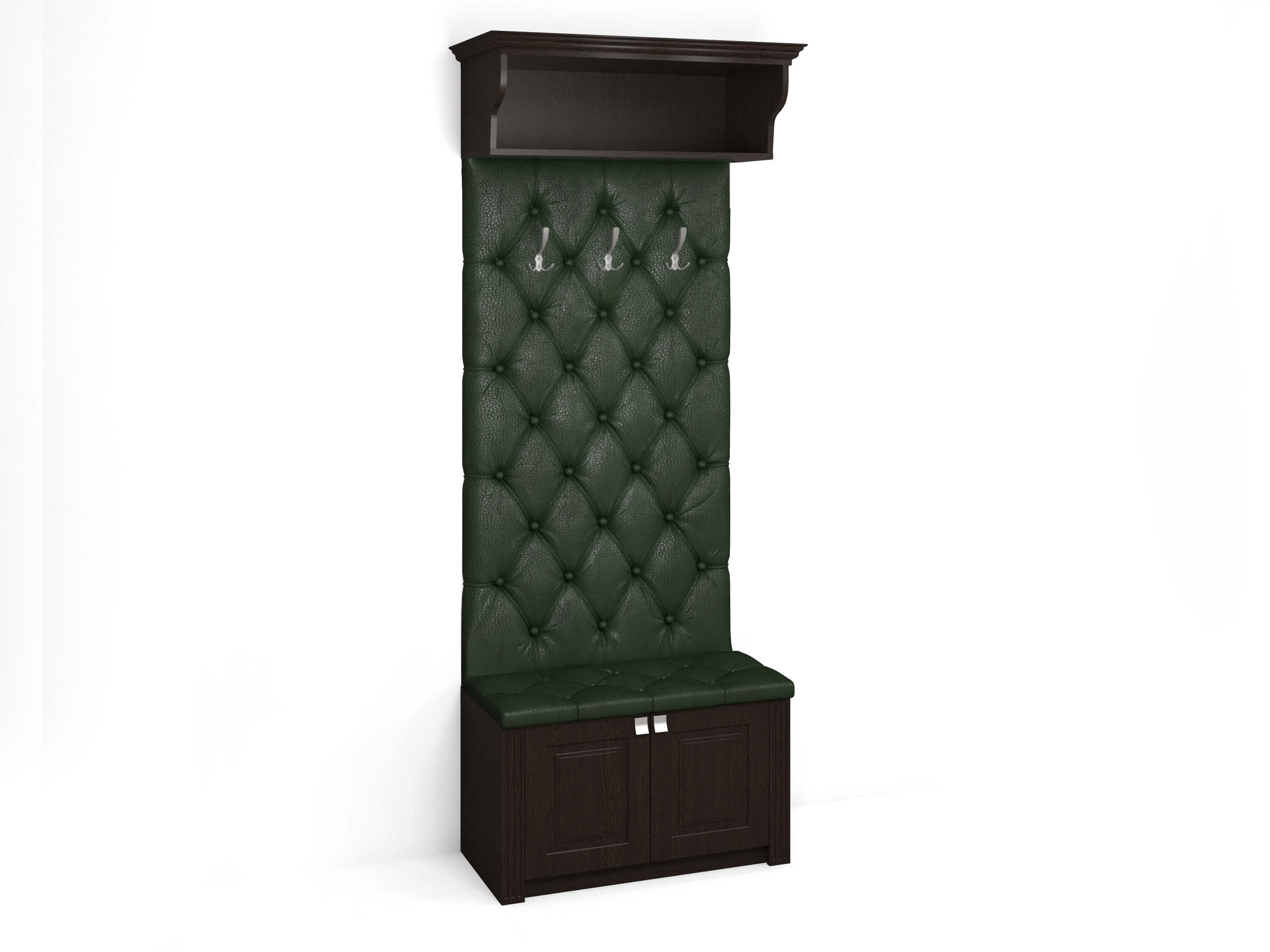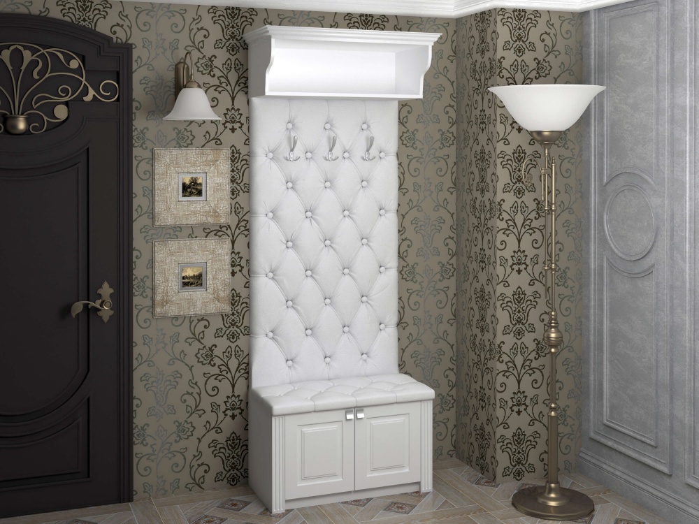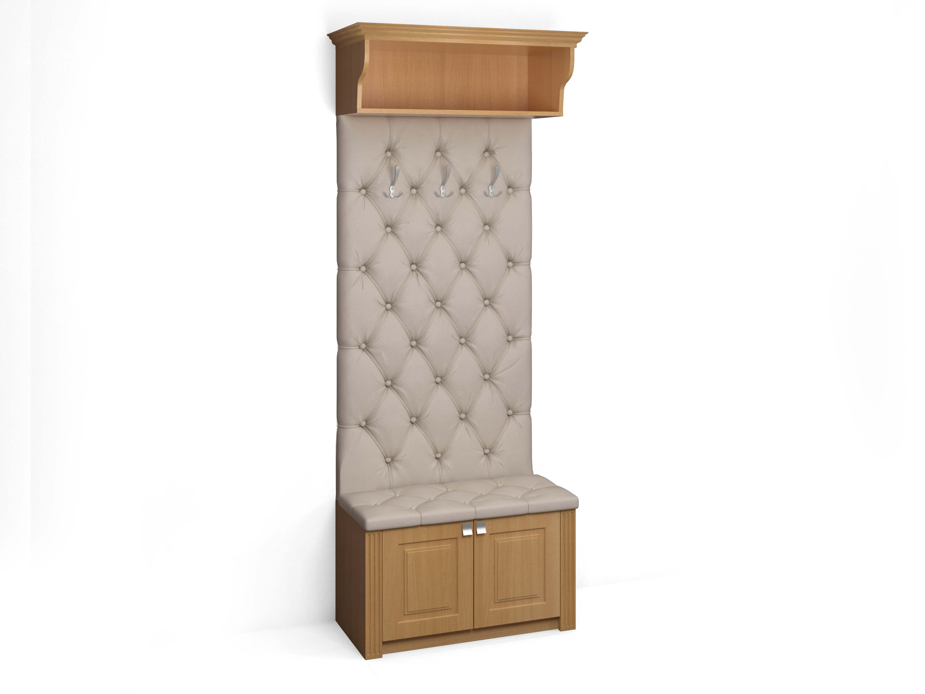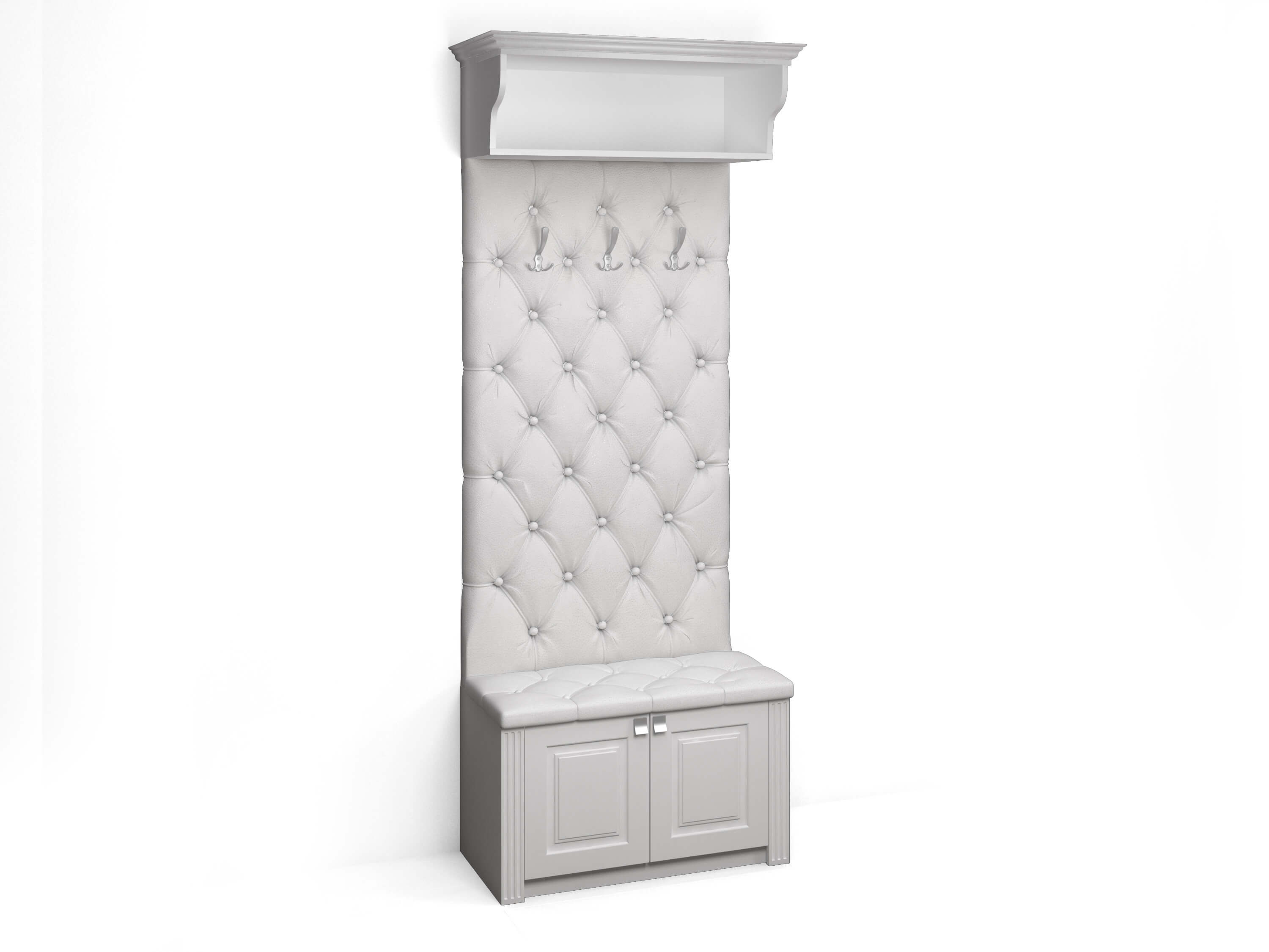 Прихожая МДФ Жасмин мини - элегантная прихожая, которая идеально впишется в любое помещение. Она представлена верхней полкой, центральная часть имеет мягкую обивку и ромбообразный рисунок, а также мягкая обивка имеется на тумбе. Тумба используется под обувницу и имеет привлекательные распашные створки. Верхняя одежда вешается на открытые крючки.