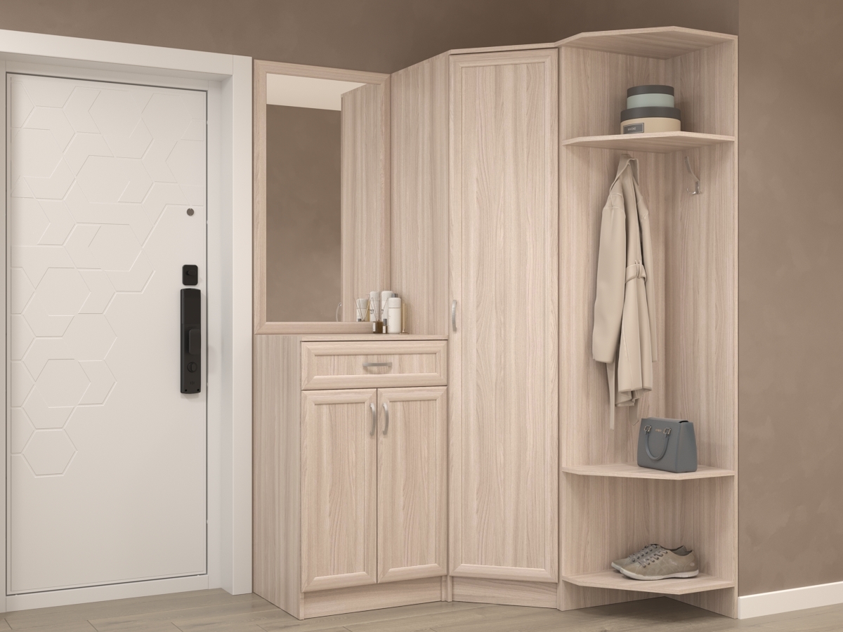 Прихожая Рикардо 3У – элегантный угловой мебельный предмет, состоящий из тумбы с зеркалом, углового шкафа и открытой вешалки. Этот предмет из ЛДСП придаст вашему помещению безупречную элегантность. Комод с функциональным ящиком и шкафом. Небольшая нижняя полка позволит аккуратно спрятать обувь и сапоги.