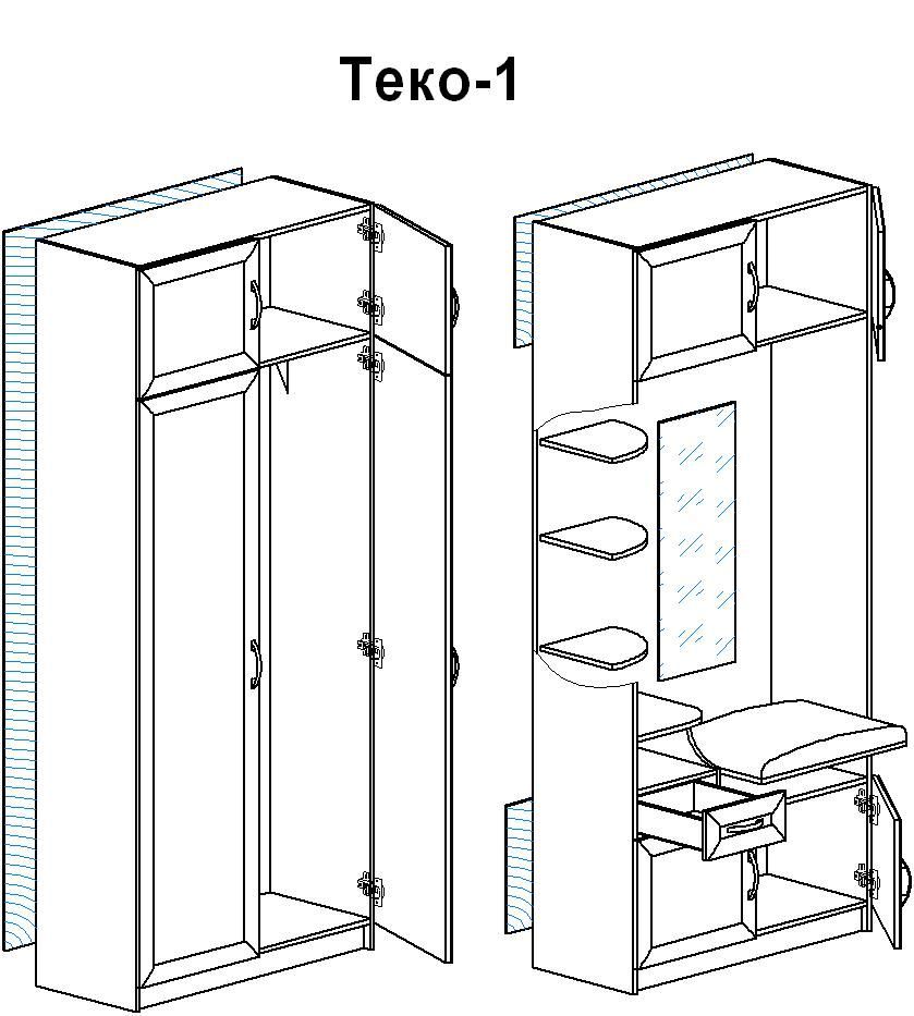Прихожая Теко 1 МДФ – мебельный предмет линейного типа, отличающийся лаконичностью и удобством. В комплектацию входит распашной шкаф с антресолью, модуль с еще одной антресолью, обувницей, выдвижным ящиком, полками и зеркалом. На обувницу можно присесть. Отличный вариант для небольшой прихожей. Зеркало входит в стоимость.