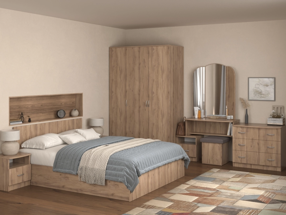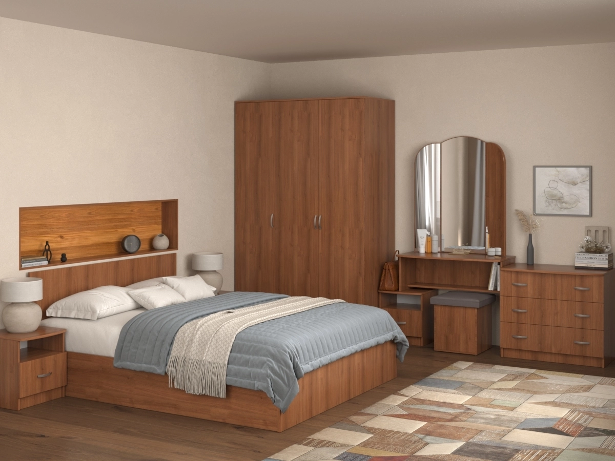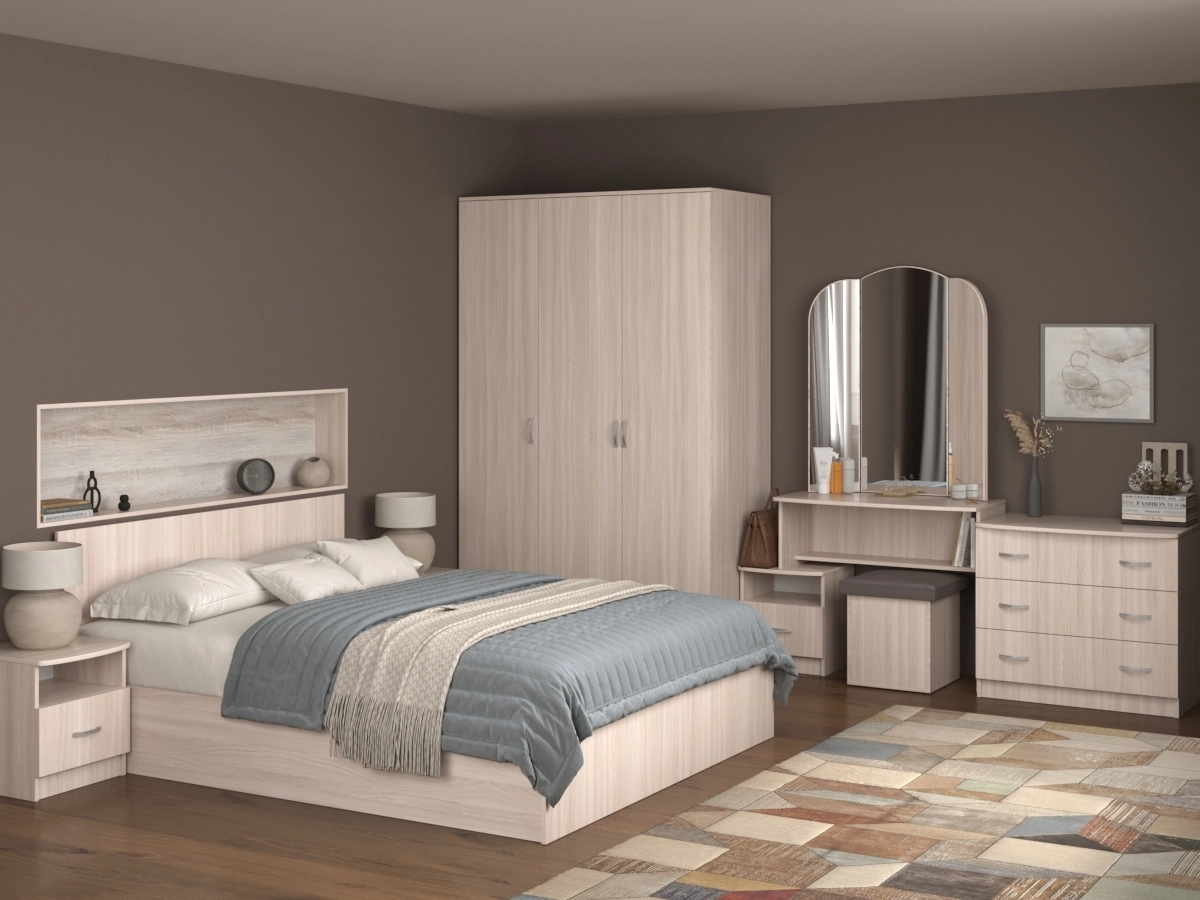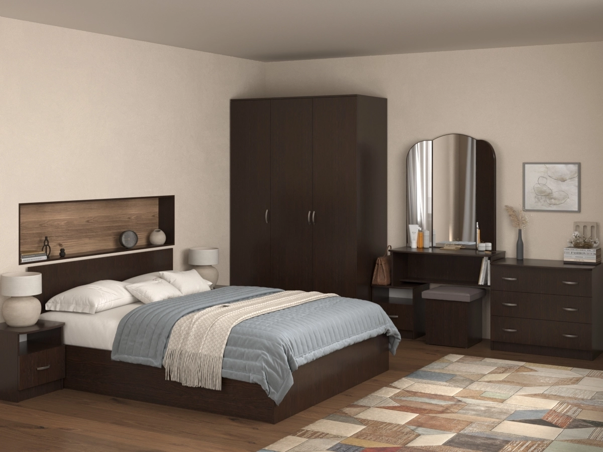 Спальный гарнитур «Елена 1» – отличное решение для интерьера в современном стиле. В набор входят комод, прикроватные тумбы, двуспальная кровать, распашной шкаф и столик с зеркалом. В комплект включено всё нужное для удобного хранения и комфортного отдыха. Чтобы купить Спальный гарнитур «Елена 1» по выгодным ценам, достаточно заполнить заявку на нашем сайте или позвонить по телефону 8 (495) 740-75-18