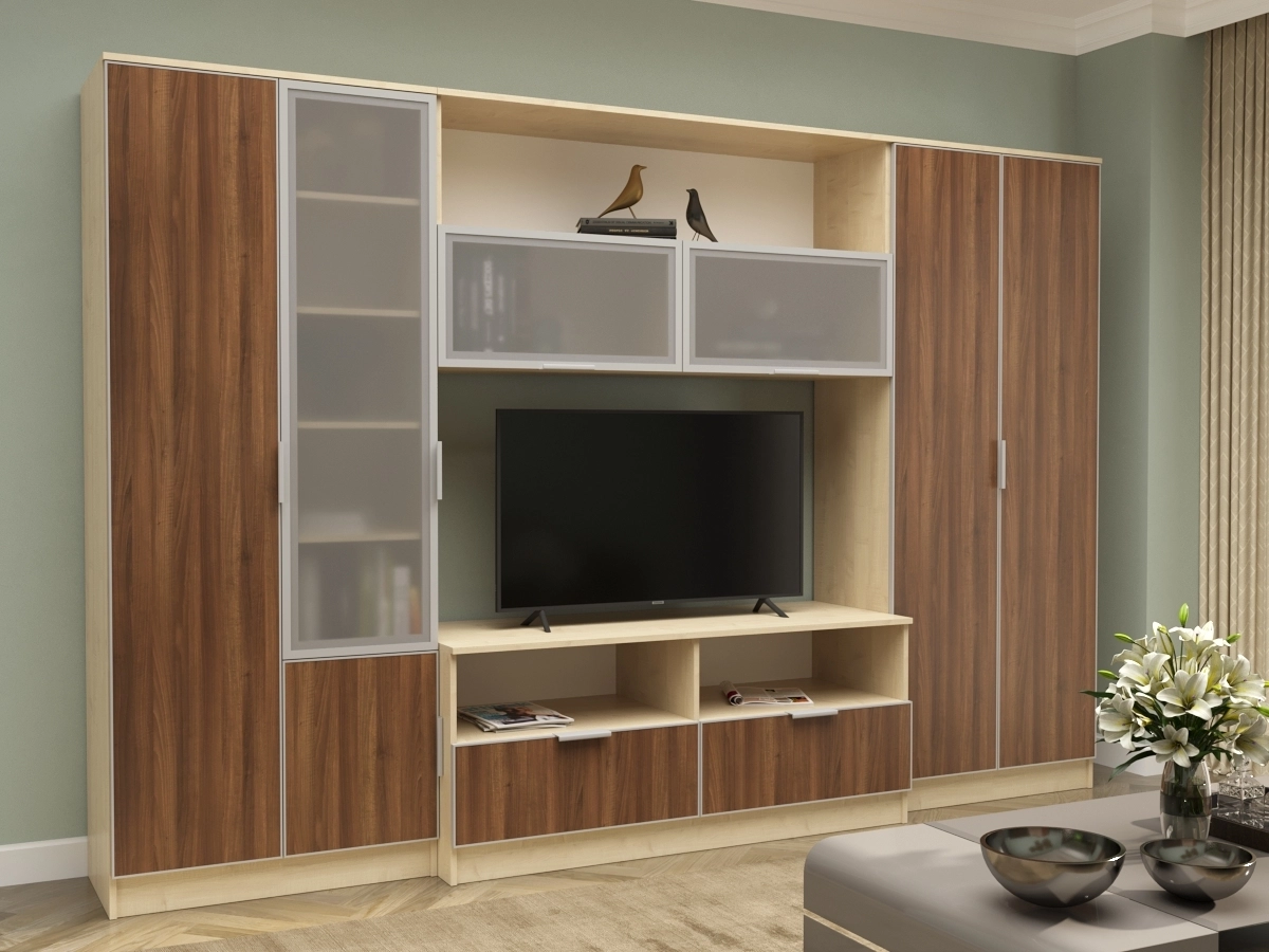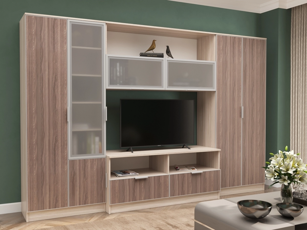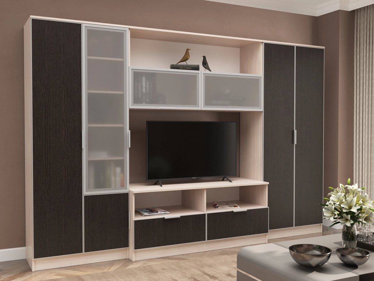 Стенка Аврелия 15 люкс – мебельная стенка для просторной гостиной. В комплектации платяной шкаф, тумба под телевизор с двумя выдвижными ящиками, полки, пенал. Современная и устойчивая мебель займет определенное пространство и будет очень функциональной. С помощью этой стенки создается уютная атмосфера.