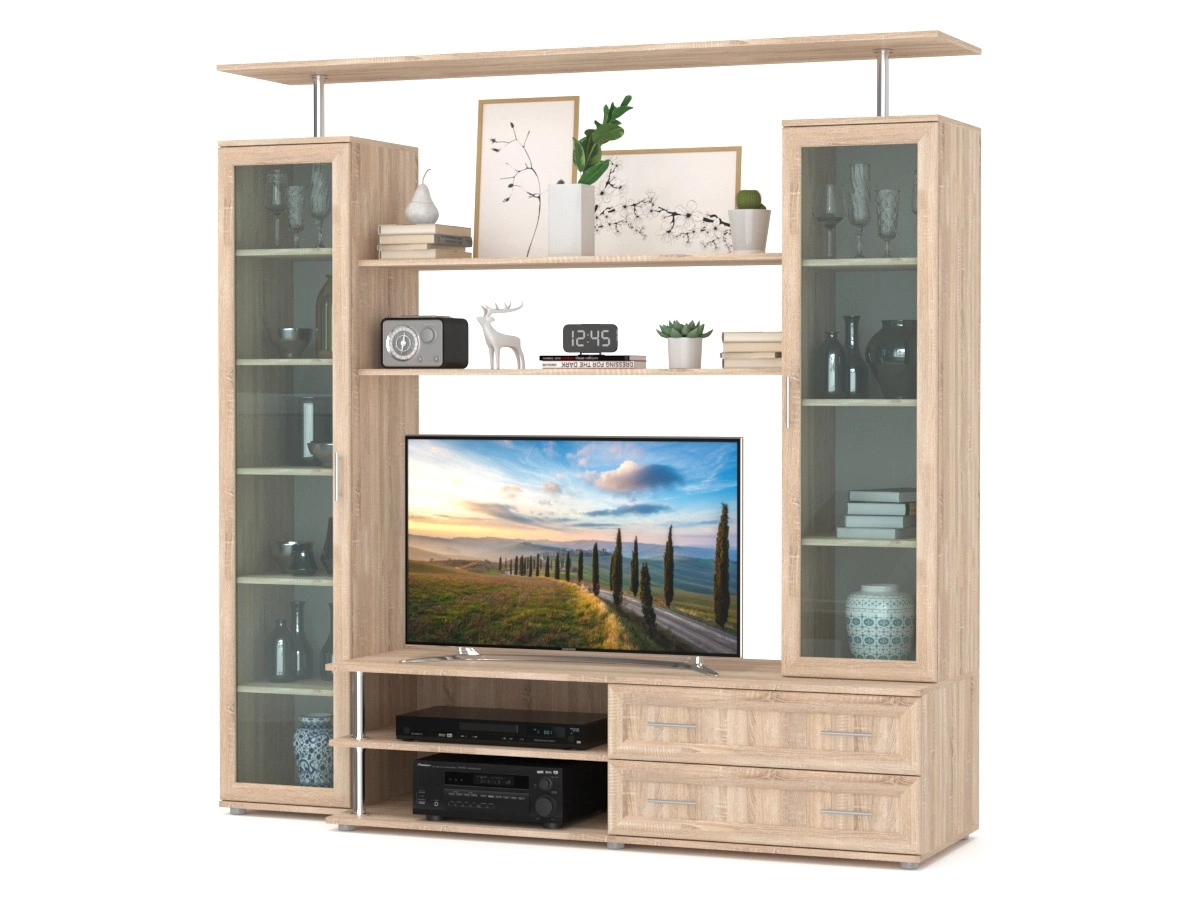Стенка Аврелия 4 – мебель, которая изготовлена из высококачественных материалов и в своем составе имеет открытые полки, тумбу под телевизор с выдвижными ящиками, стеллаж и шкаф с полками и стеклянными фасадами. Эта модель может устанавливаться не только в квартире, но и в доме и в офисе. Сверху имеются открытые полки, на которых можно установить статуэтки, фотографии и другие предметы.